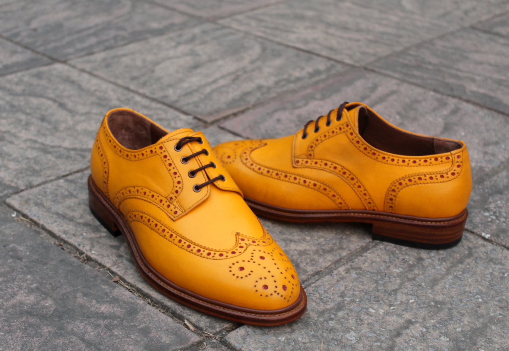 Inner: Soft Leather Sole: Leather Gender : Male Heel: Leather Color: Yellow Style: Wing-tip Dress Shoes Totally Hand stitched Manufacturing time 7-10 business days If you can’t find your Size/Color just send us message we will make for you.