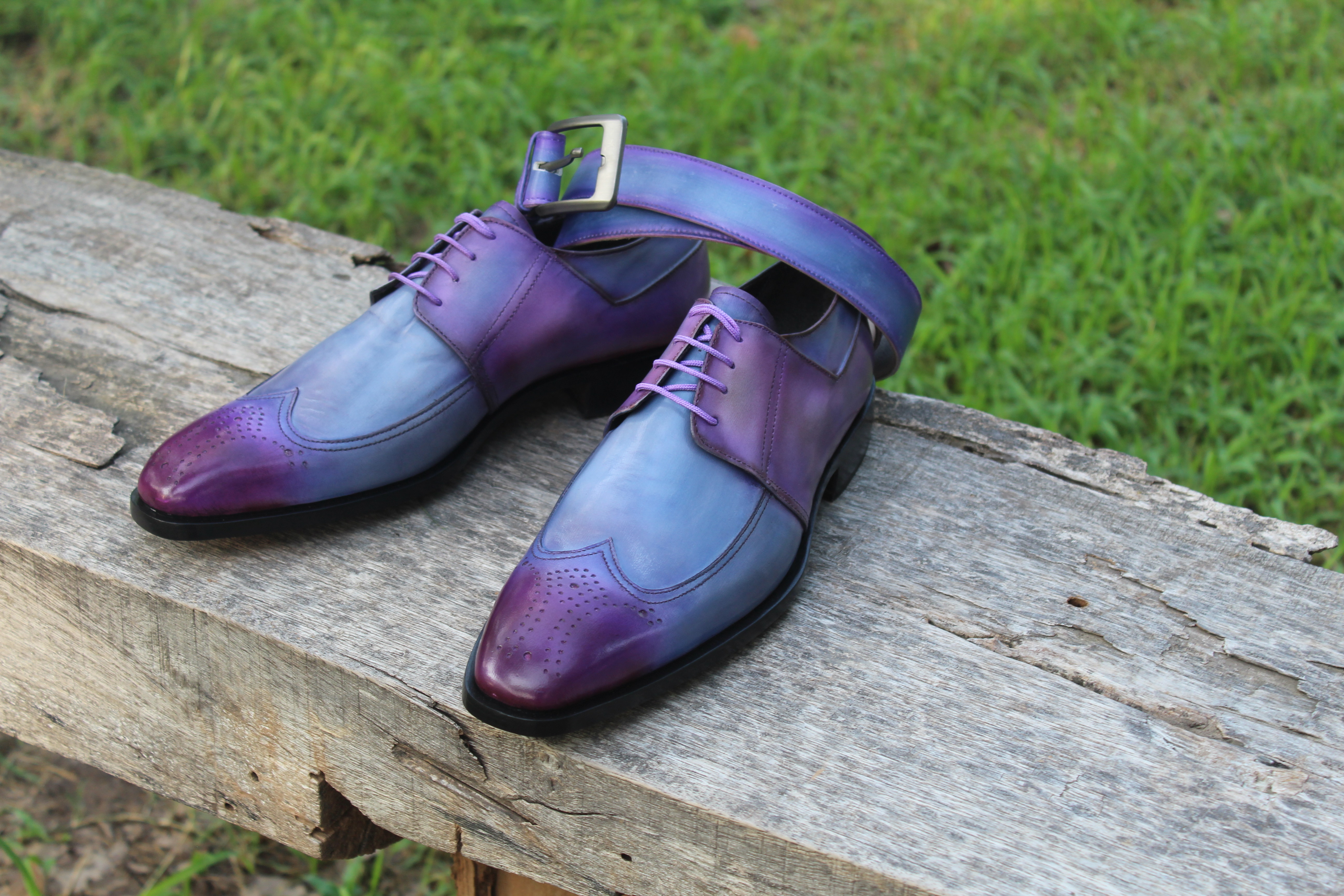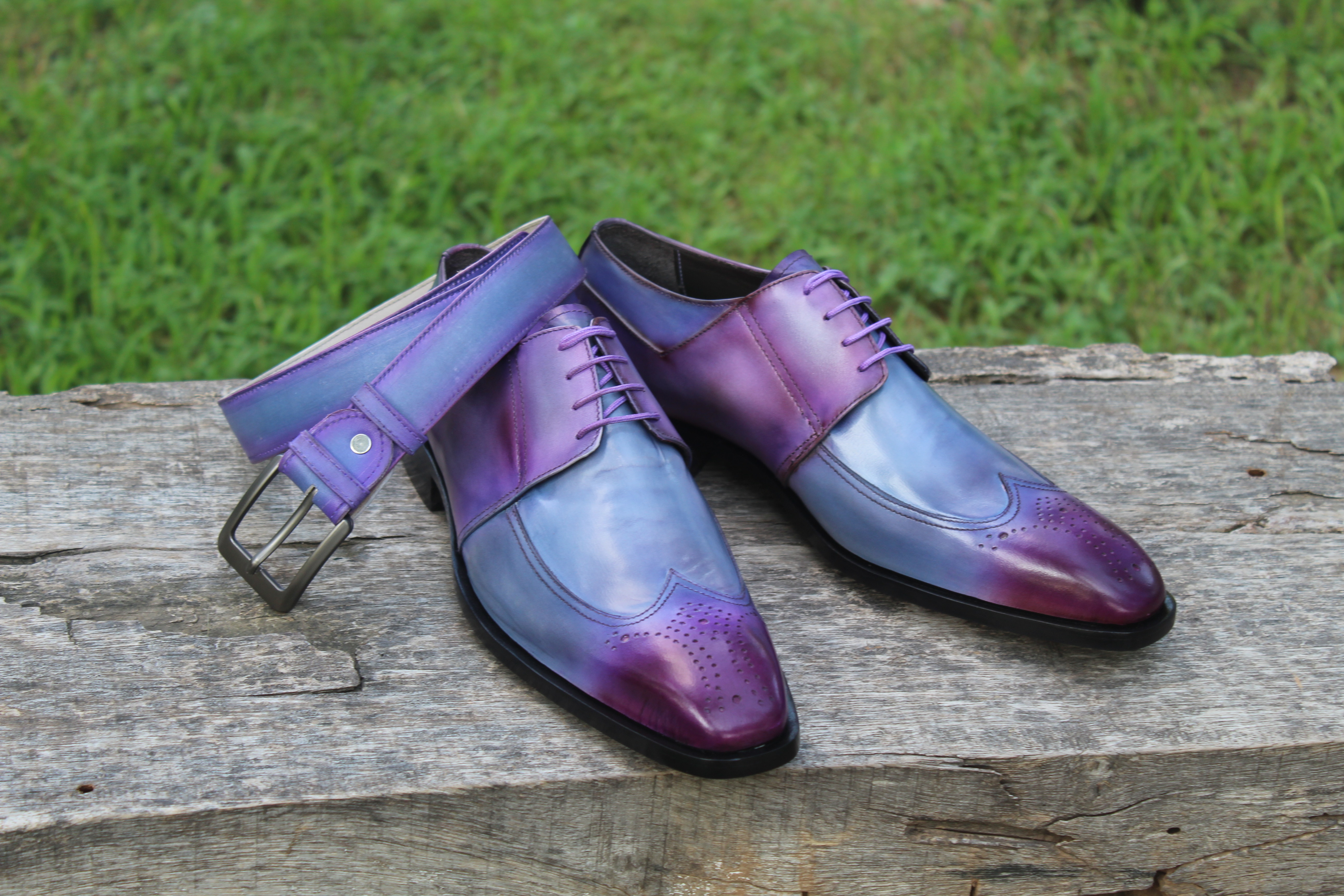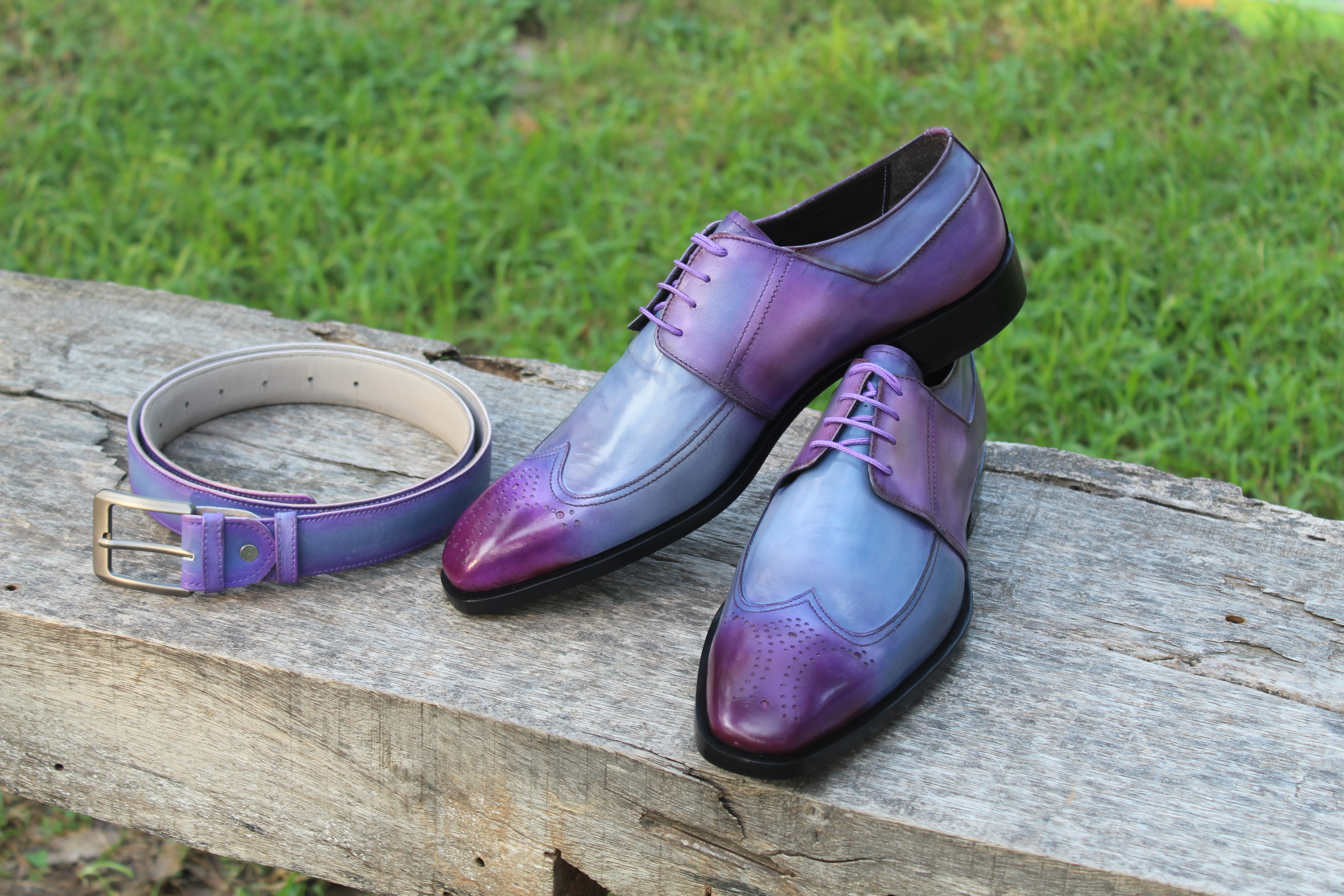 Crafted Leather Classic Handmade Mens Purple Patina Wingtip Dress Oxford Shoes with Matching Belt