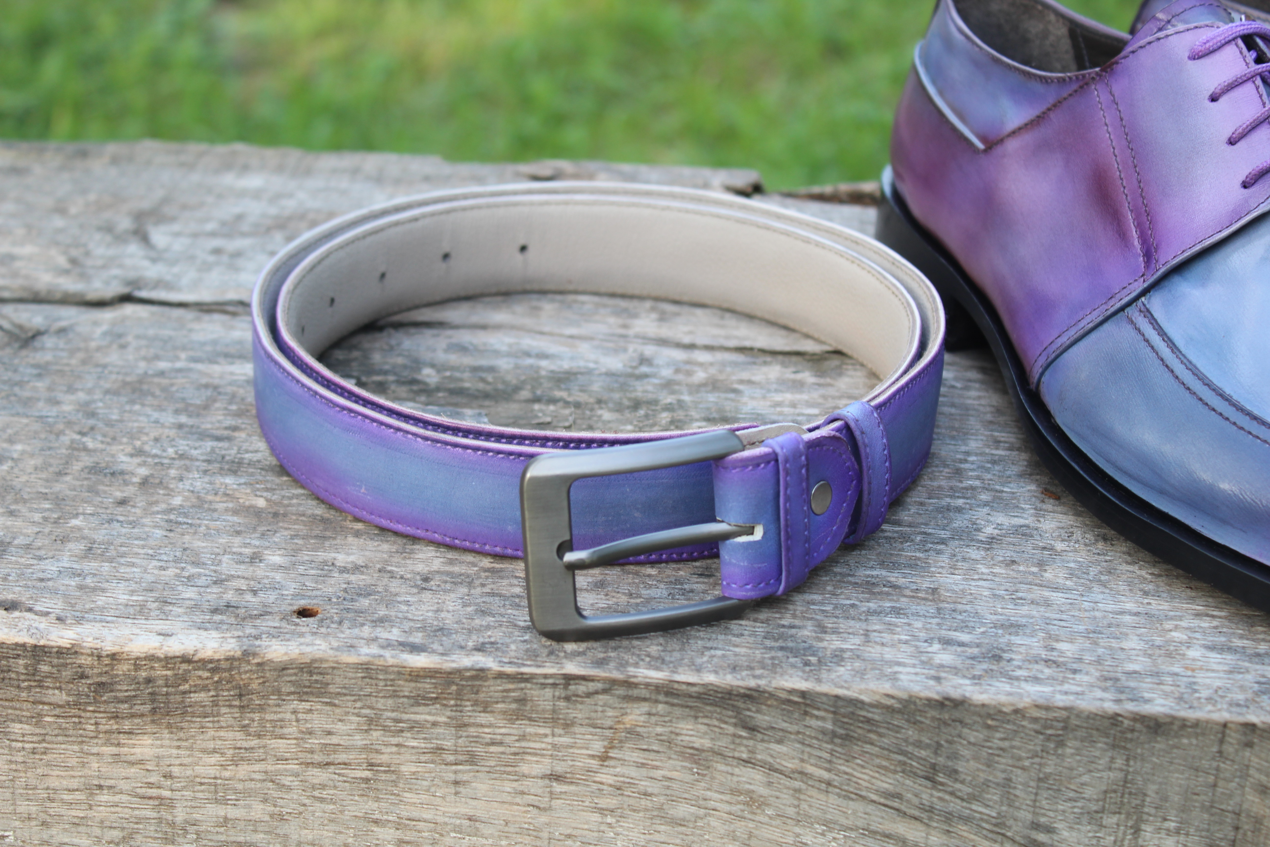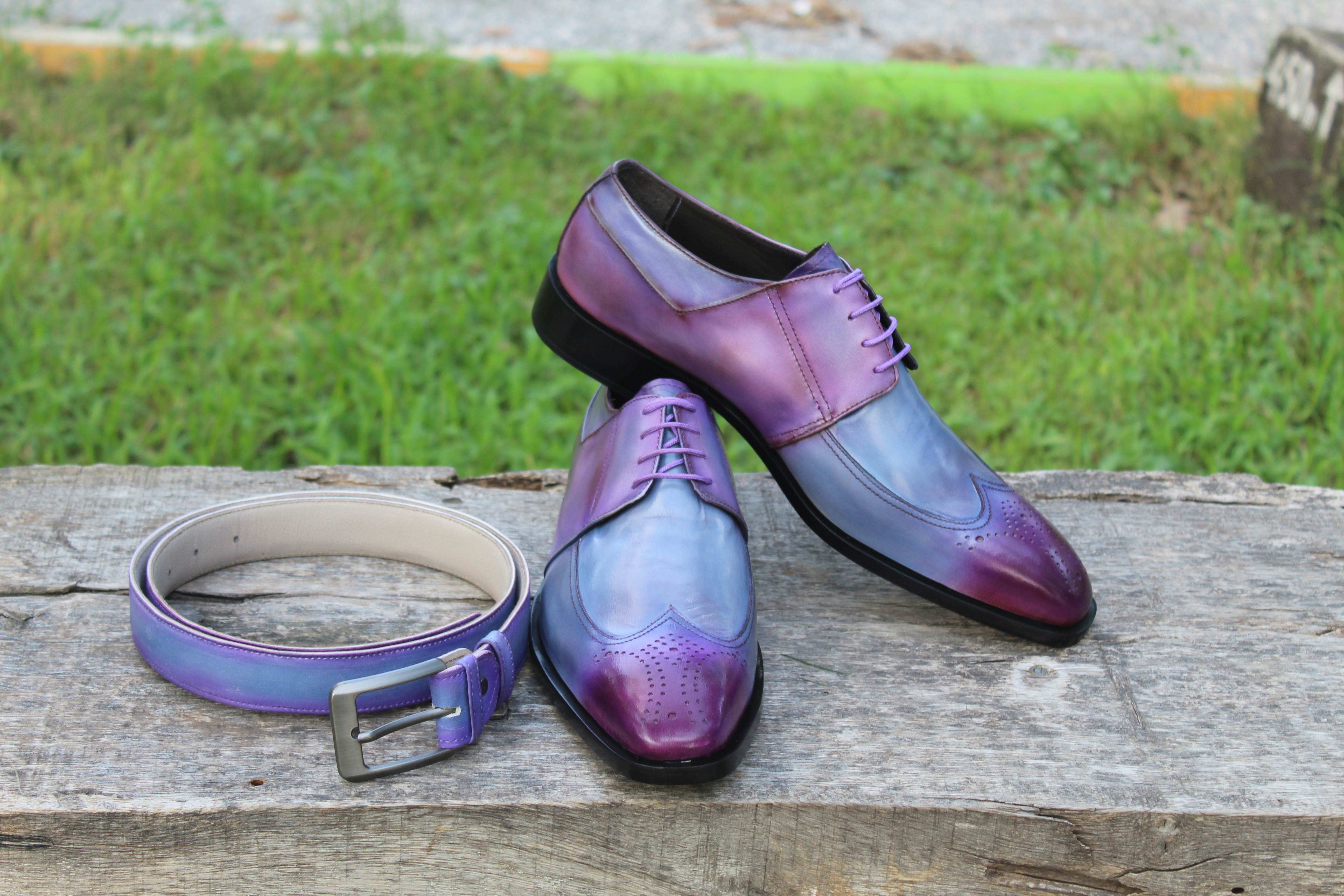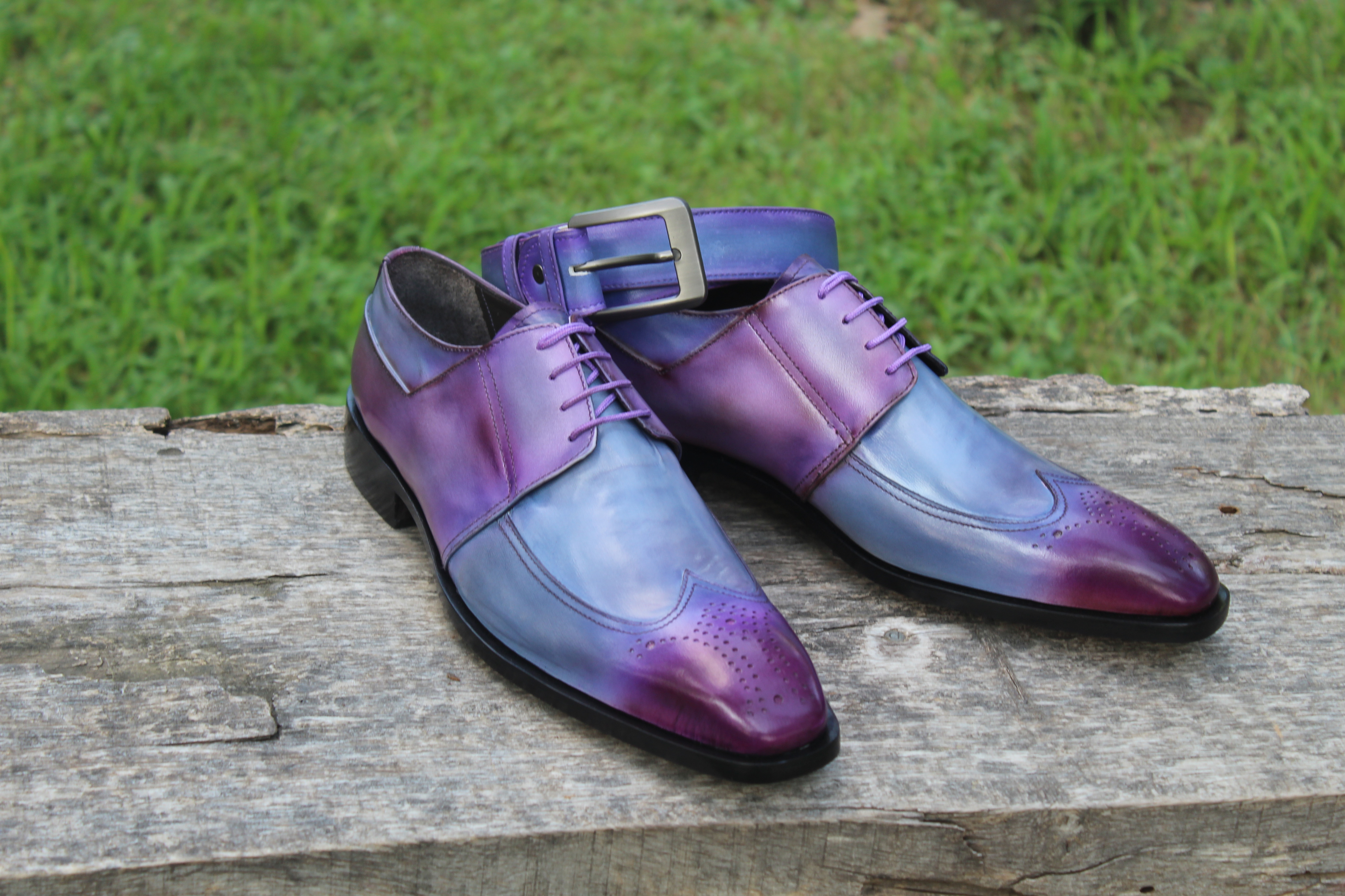 Crafted Leather Classic Handmade Mens Purple Patina Wingtip Dress Oxford Shoes with Matching Belt
