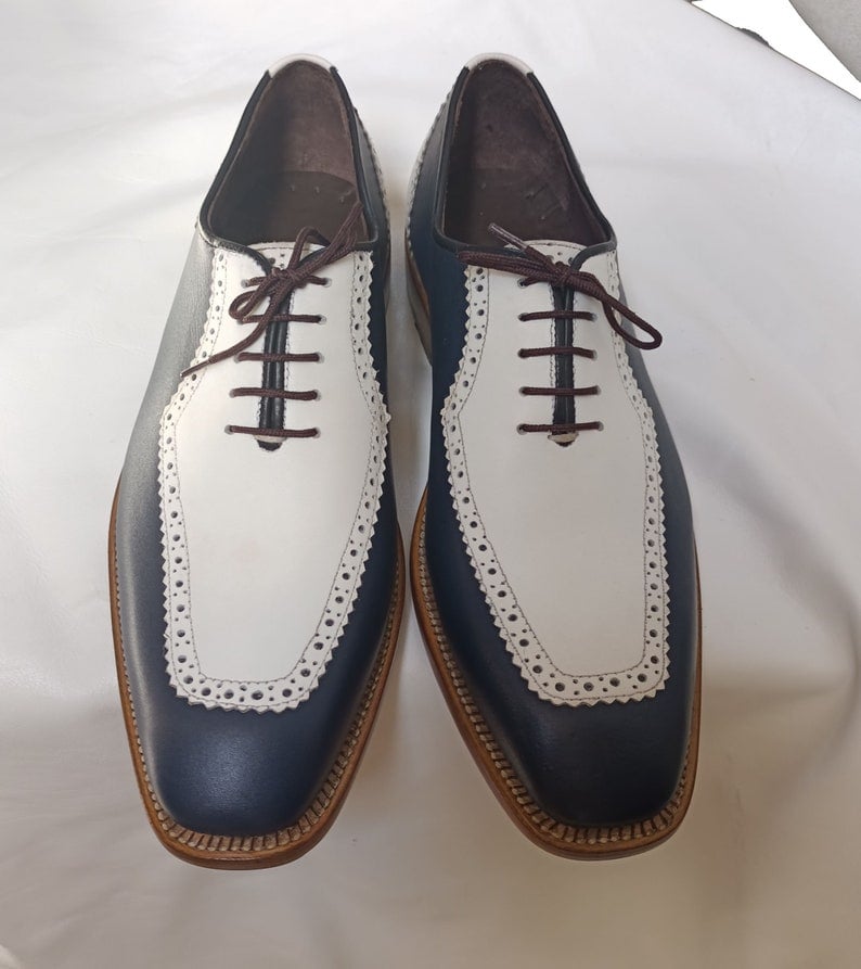 Handmade Blue & White Color Genuine Leather Dress Lace up Oxford Shoes
