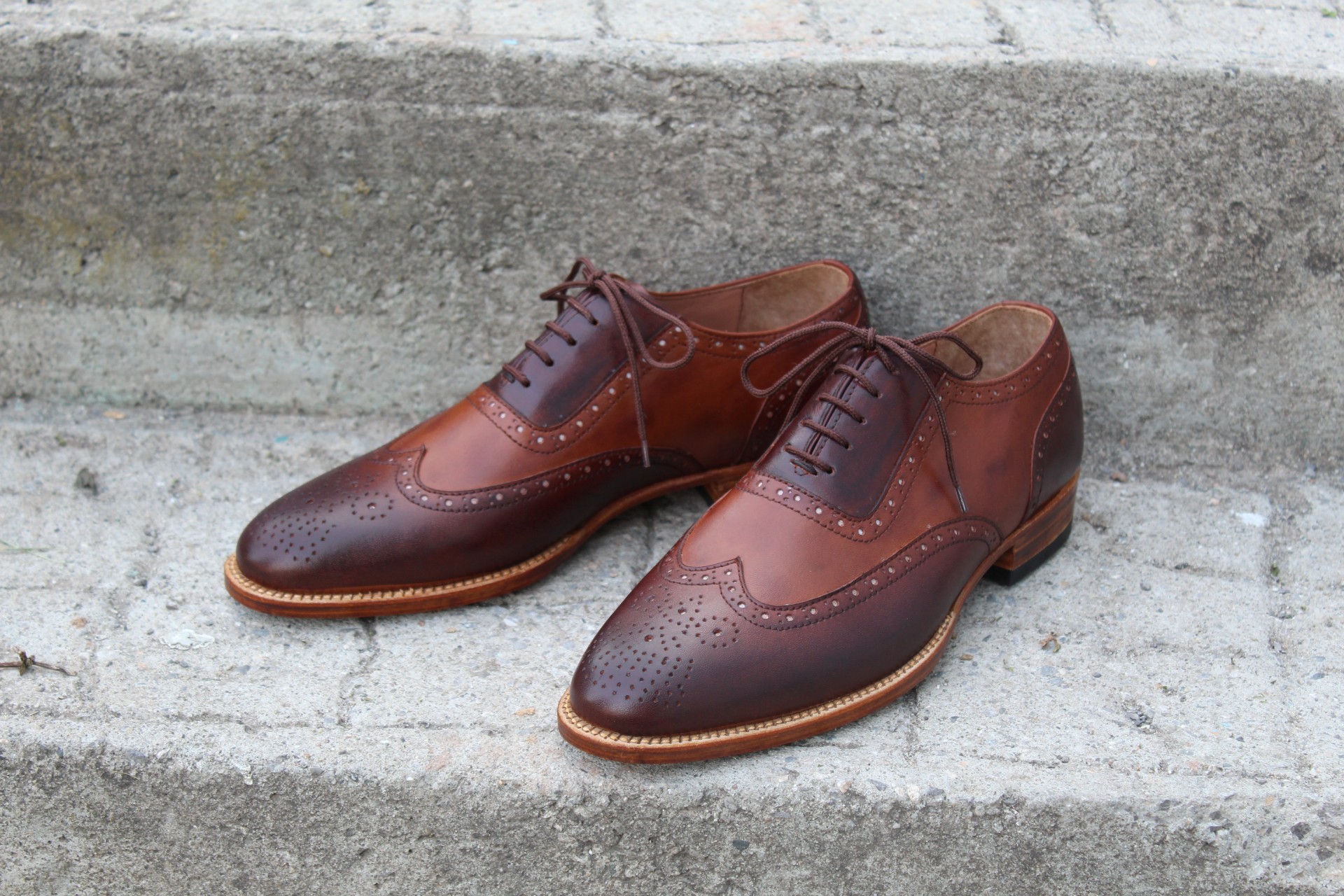 Inner: Soft Leather Sole: Leather Gender : Male Heel: Leather Color: Brown Patina Style: Wing Tip Brogue Shoes Manufacturing time 7-10 business days Totally Hand stitched If you can’t find your Size/Color just send us message we will make for you.