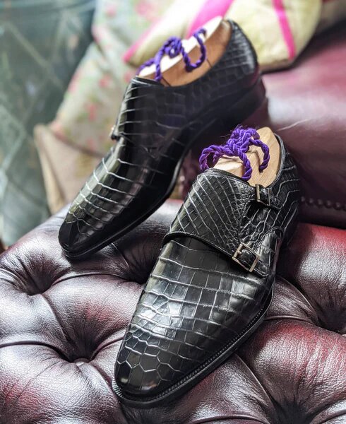 Handmade Mens Black Crocodile Leather Monk Strap Dress Formal Shoes
