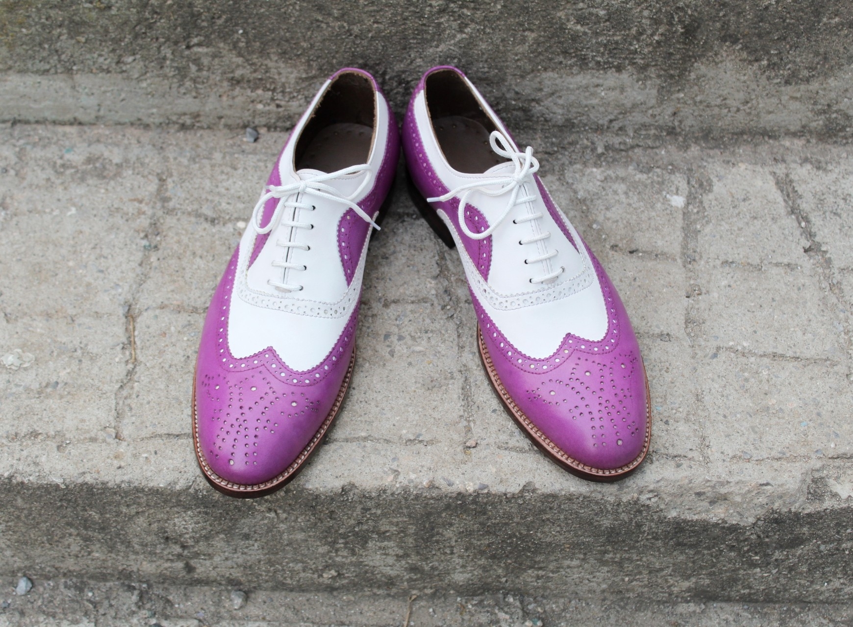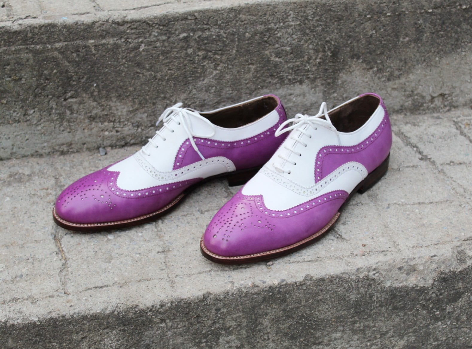 Crafted Leather Stunning Men Handmade Purple White Leather Lace up Wingtip Dress Shoes