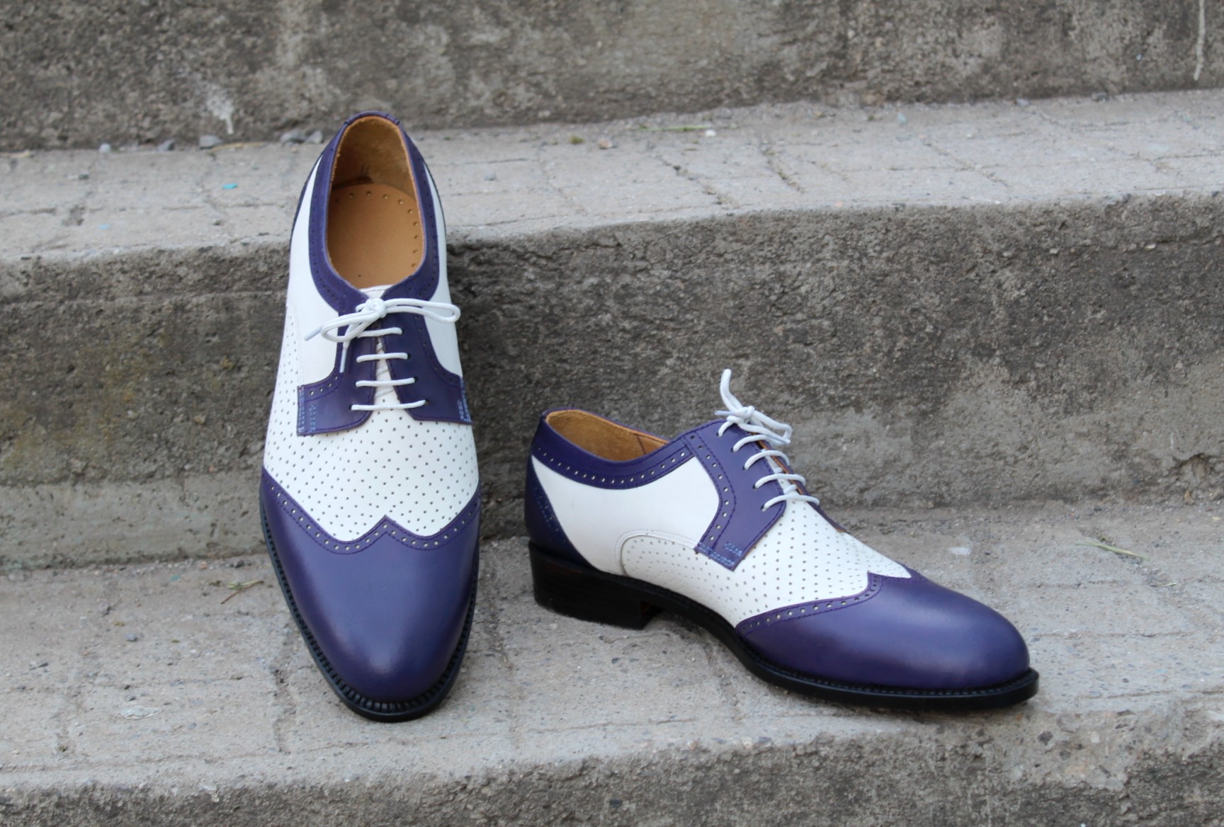Inner: Soft Leather Sole: Leather Gender : Male Heel: Leather Color: Purple / White Style: Oxford Shoes Totally Hand stitched Manufacturing time 7-10 business days If you can’t find your Size/Colorjust send us message we will make for you.