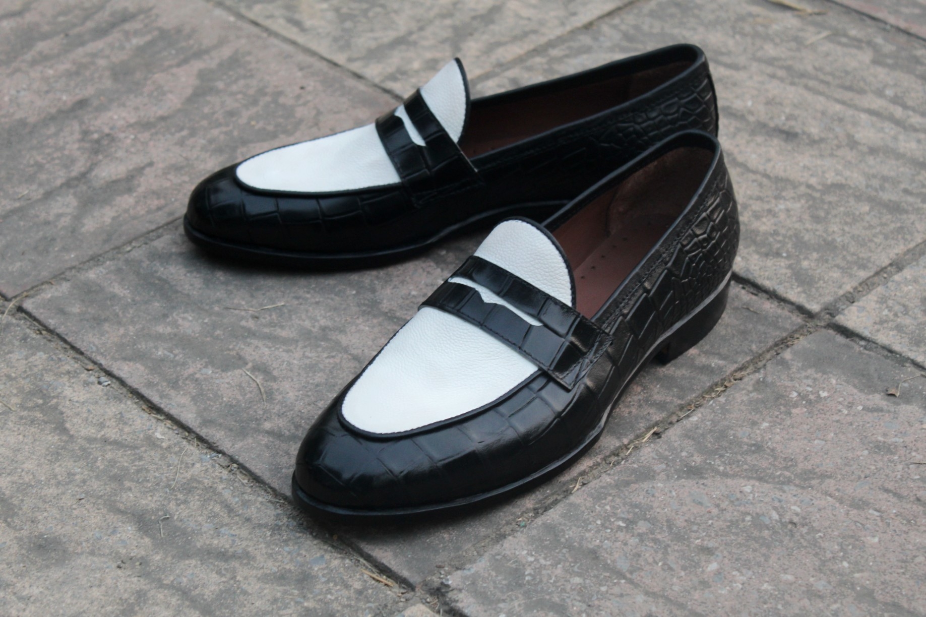 Inner: Soft Leather Sole: Leather Gender : Male Heel: Leather Color: Black / White Style: Loafers Shoes Lining Soft Calf Leather Lining Totally Hand stitched Manufacturing time 7-10 business days If you can’t find your Size/Colorjust send us message we will make for you.