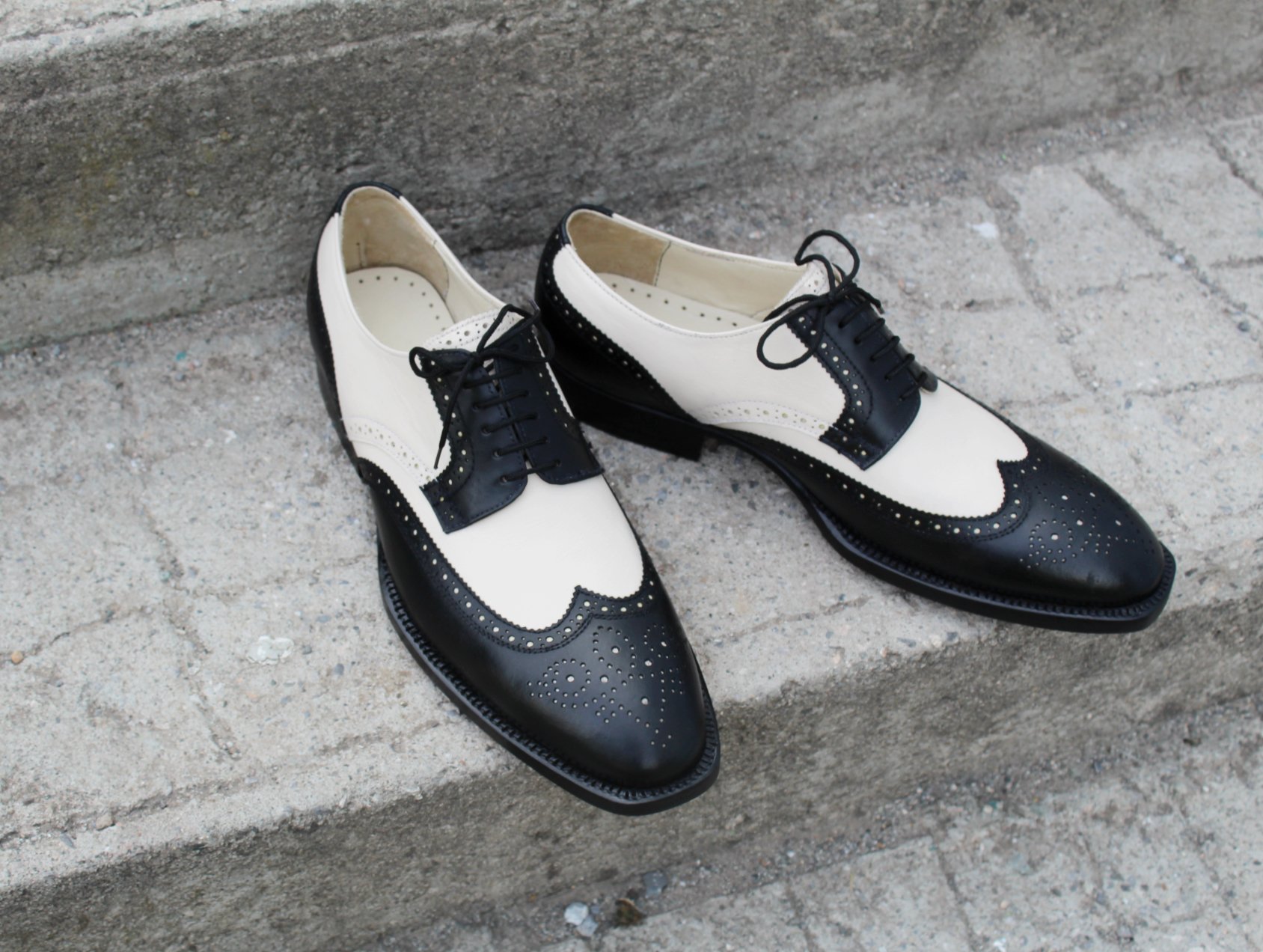 Crafted Leather Black Beige Leather Oxford Wingtip Shoes, Men Lace up Dress Formal Shoes