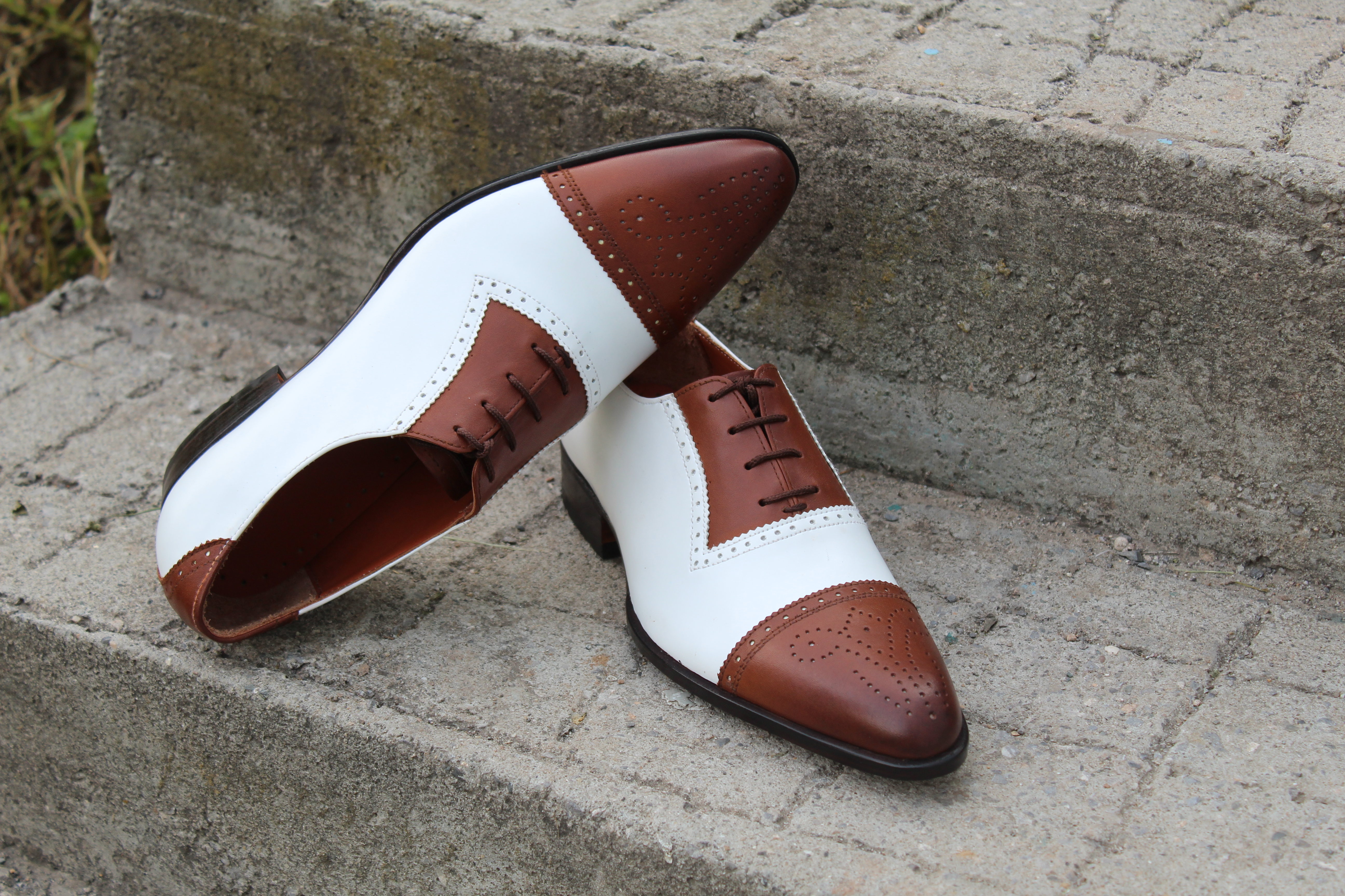 Crafted Leather Handmade Classic Brown White Leather Oxfords Dress Shoes