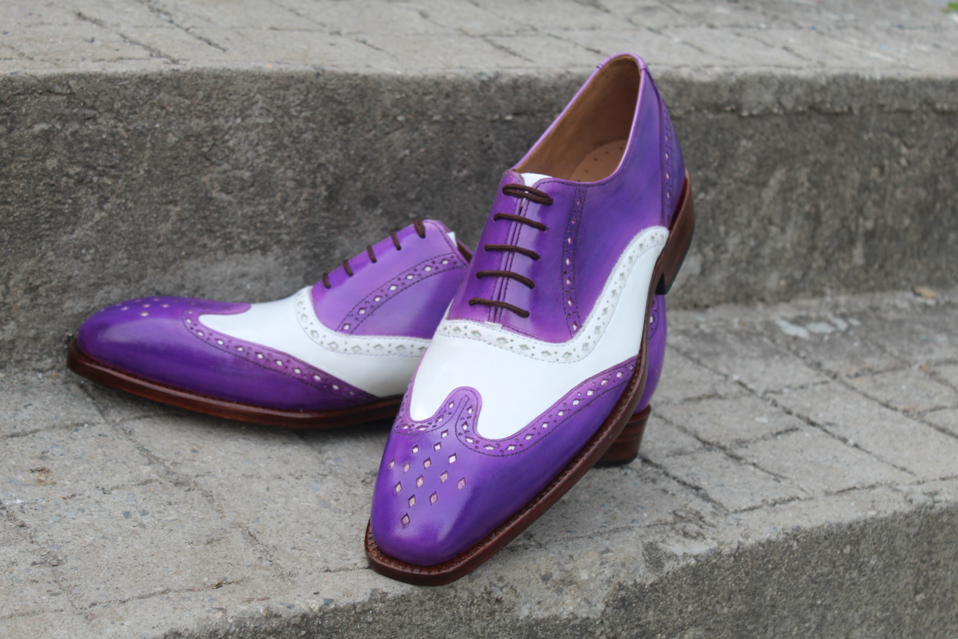 Crafted Leather Classic Handmade Purple White Wingtip Oxford Dress Shoes