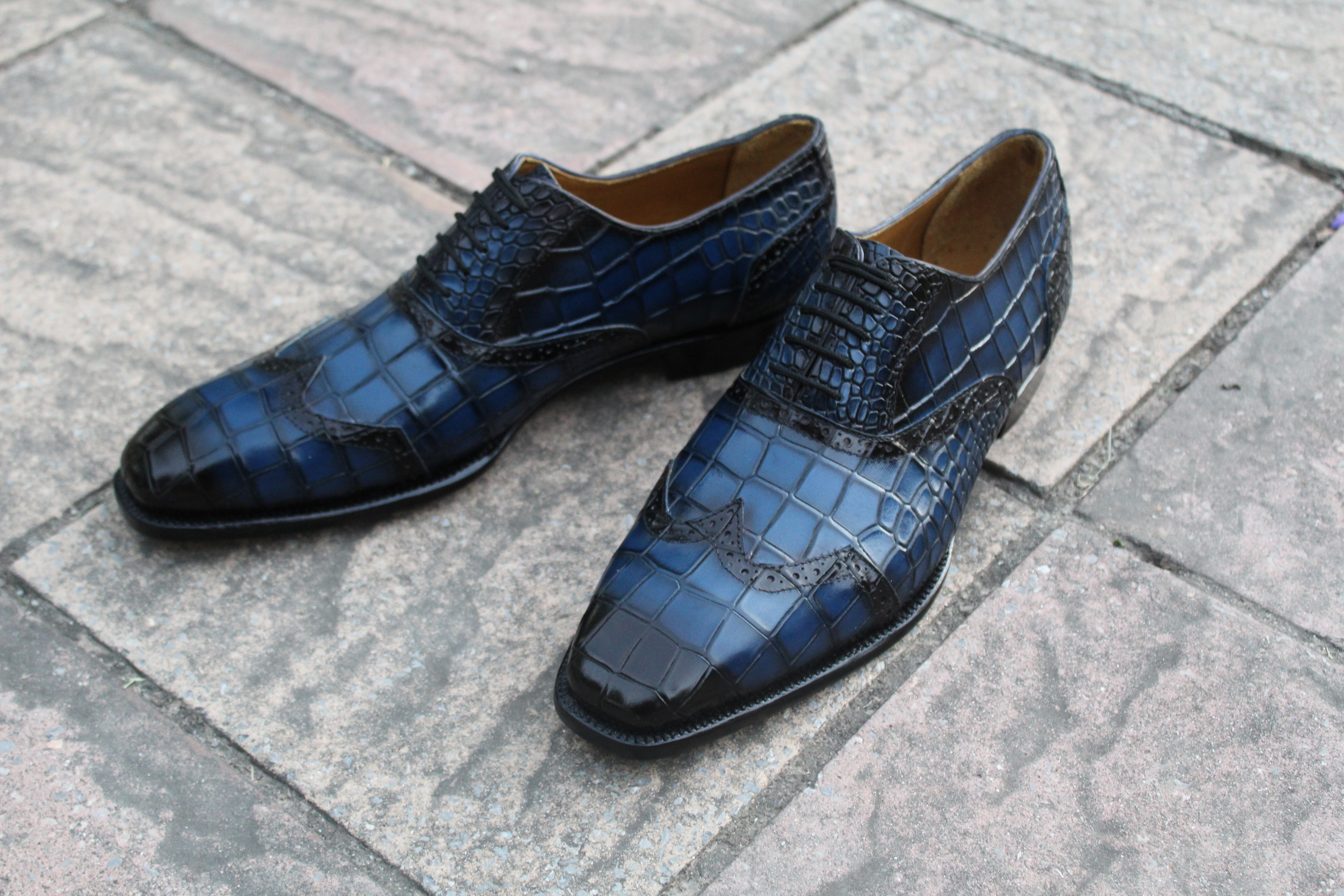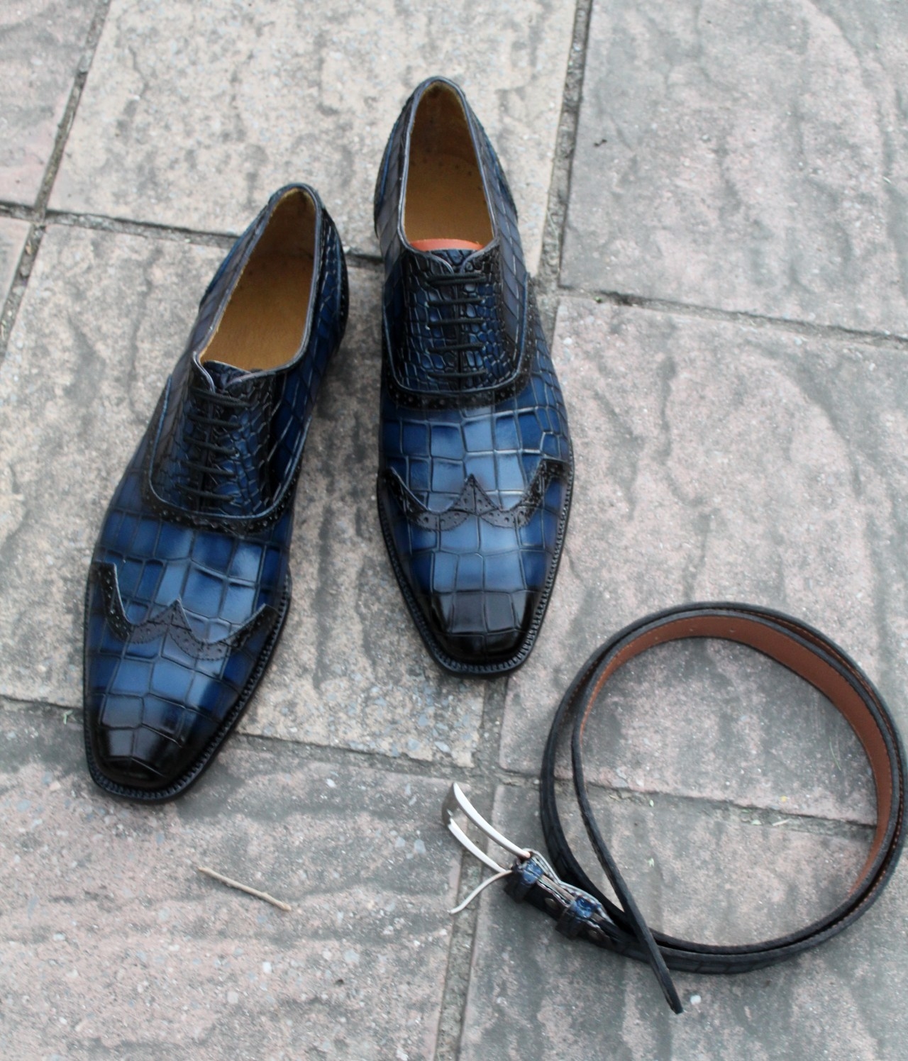 Crafted Leather Classic and Luxury Blue Patine-Art Crocodile/Alligator Wingtip Oxford Dress Shoes With Matching Belt