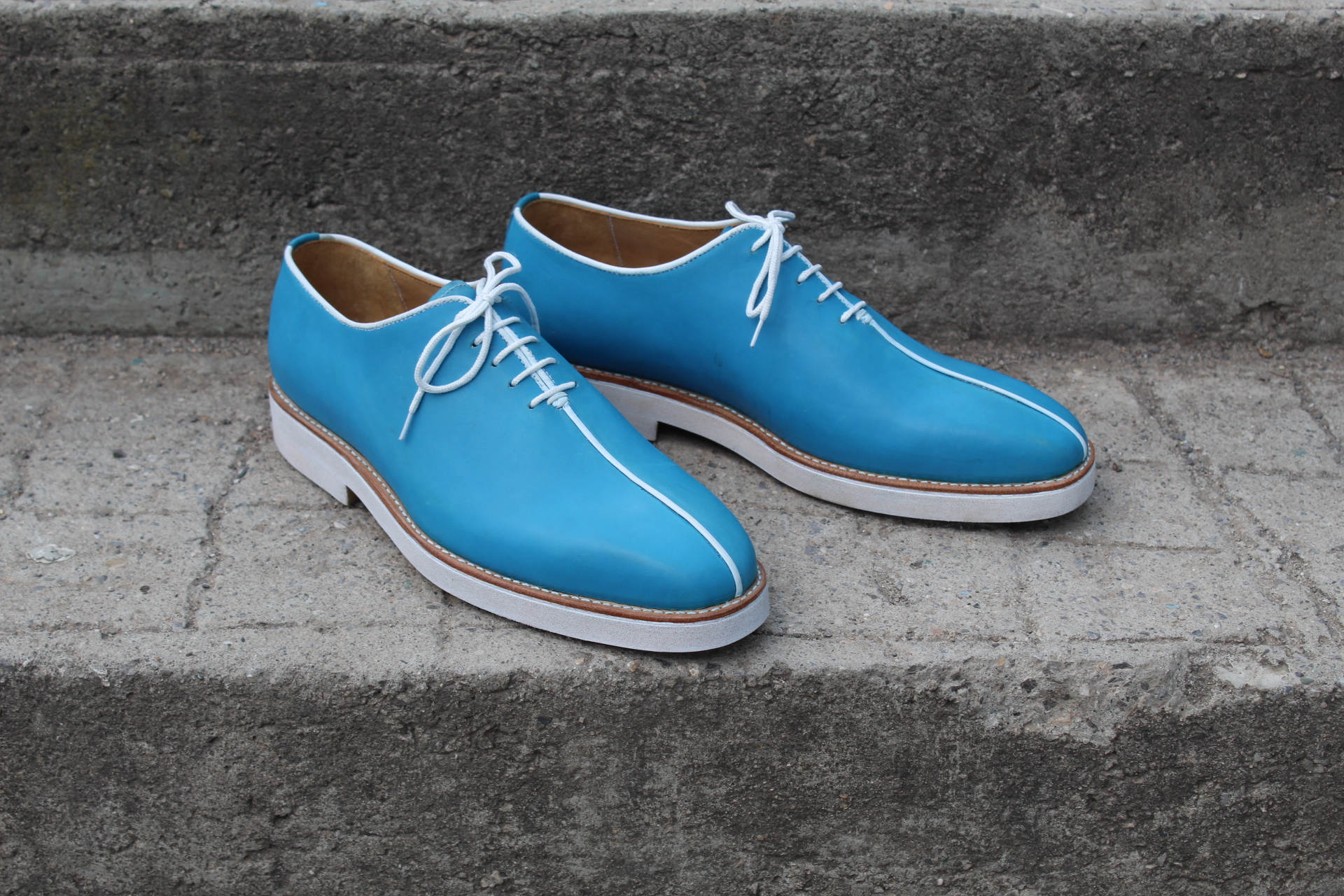 Inner: Soft Leather Sole: Leather Gender : Male Heel: Leather Color: Blue Style: Dress Shoes Lining Soft Calf Leather Lining Totally Hand stitched Manufacturing time 7-10 business days If you can’t find your Size/Colorjust send us message we will make for you.