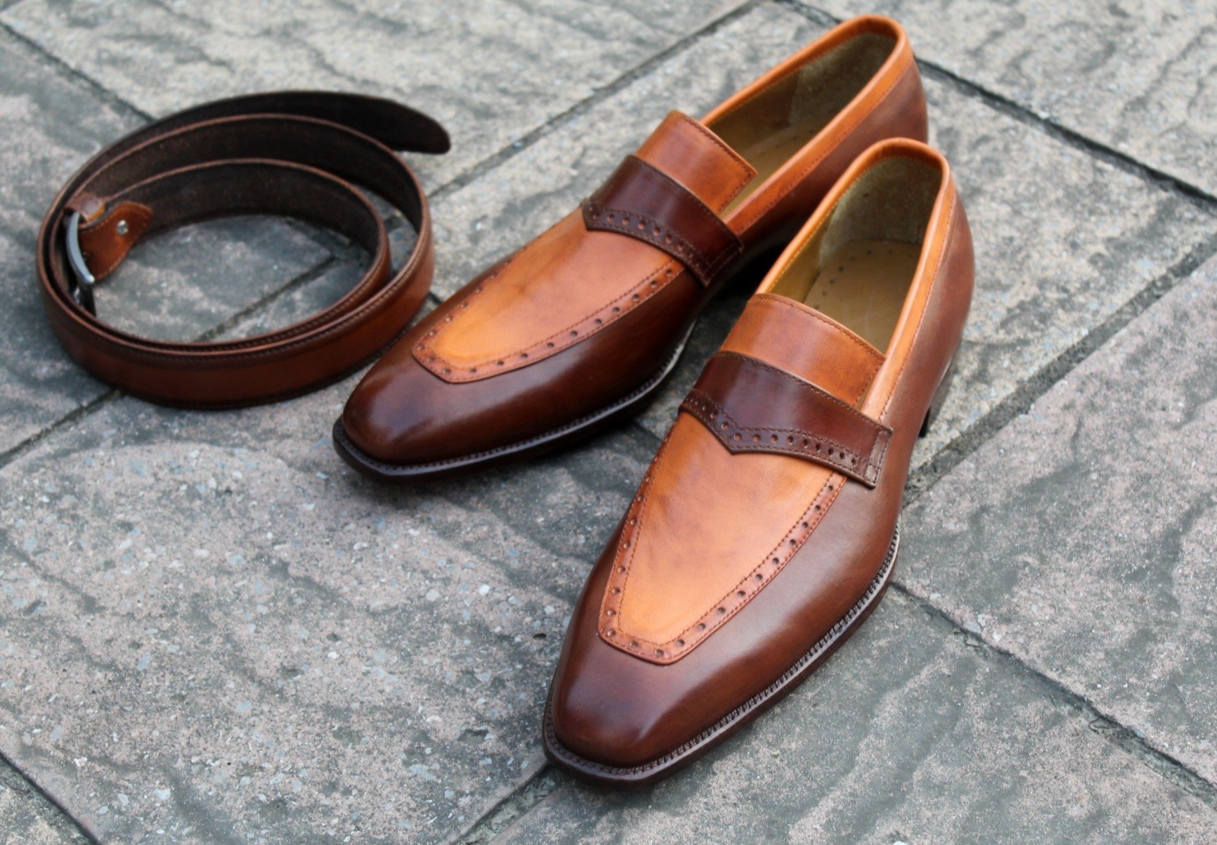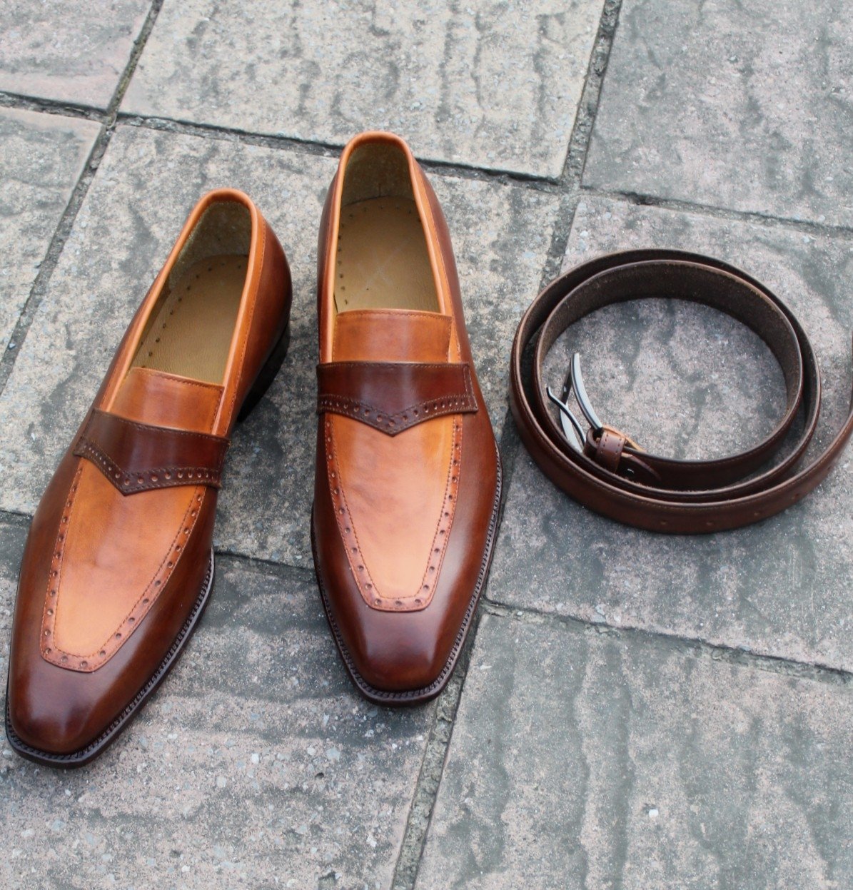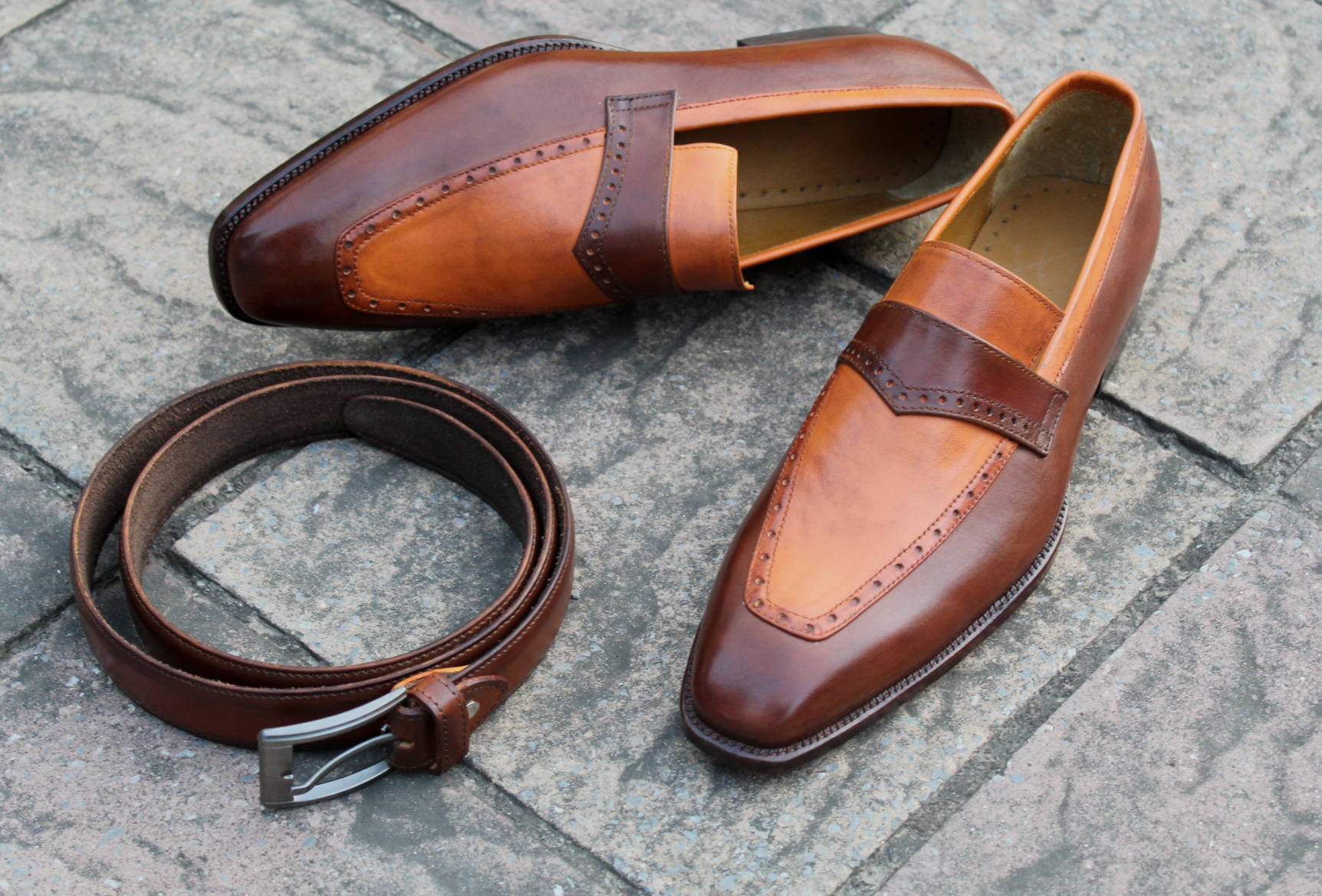 Crafted Leather Classic Brown Tan Leather Moccasin Loafers Dress Shoes With Matchinf Belt