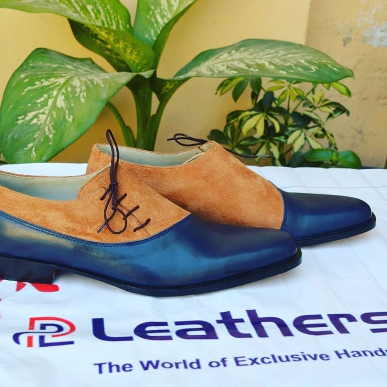 Inner: Soft Leather Sole: Leather Gender : Male Heel: Leather Color: Blue / Brown Style: Dress Shoes Lining Soft Calf Leather Lining Totally Hand stitched Manufacturing time 7-10 business days If you can’t find your Size/Colorjust send us message we will make for you.