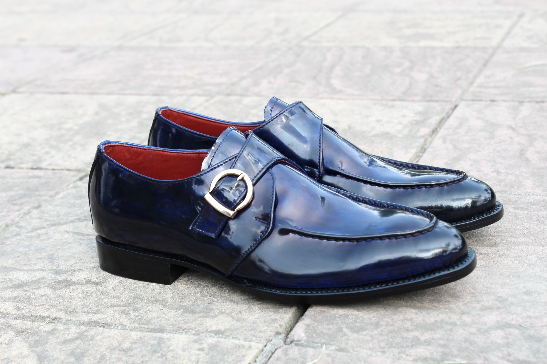 Crafted Leather Men's Handmade Custom Shoes Blue Patent Leather Monk Strap
