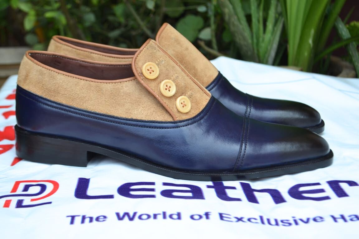 Crafted Leather Brown Suede Blue Leather Button Loafer Dress Shoes