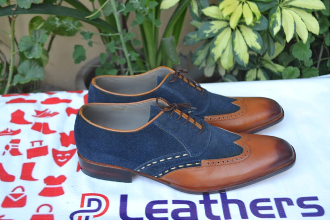 Crafted Leather Handmade Brown Leather and Blue Suede Wingtip Oxford Lace up Dress Shoes
