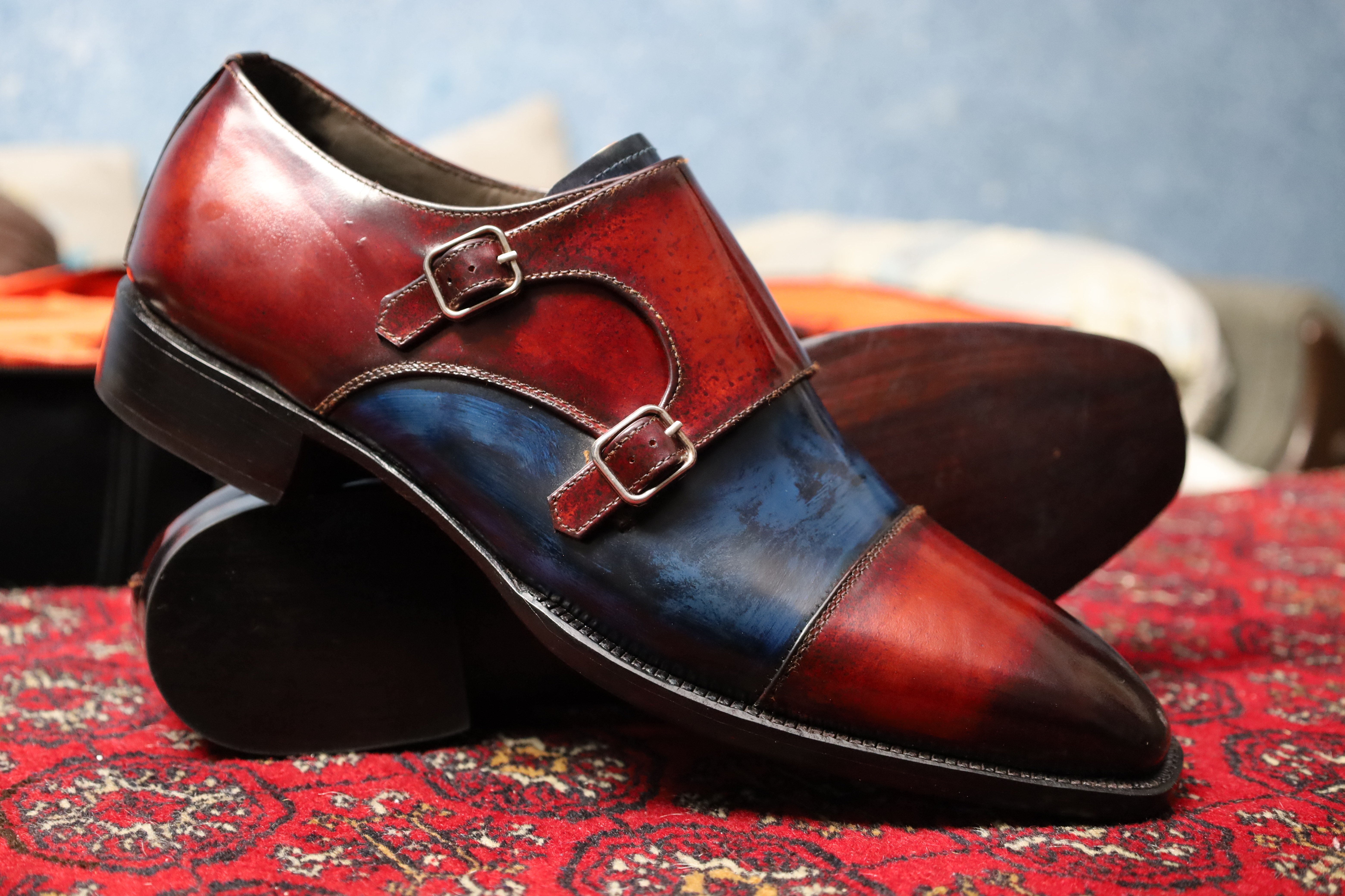 Crafted Leather Classic Handmade Bordeaux and Blue Monk Strap Dress Shoes