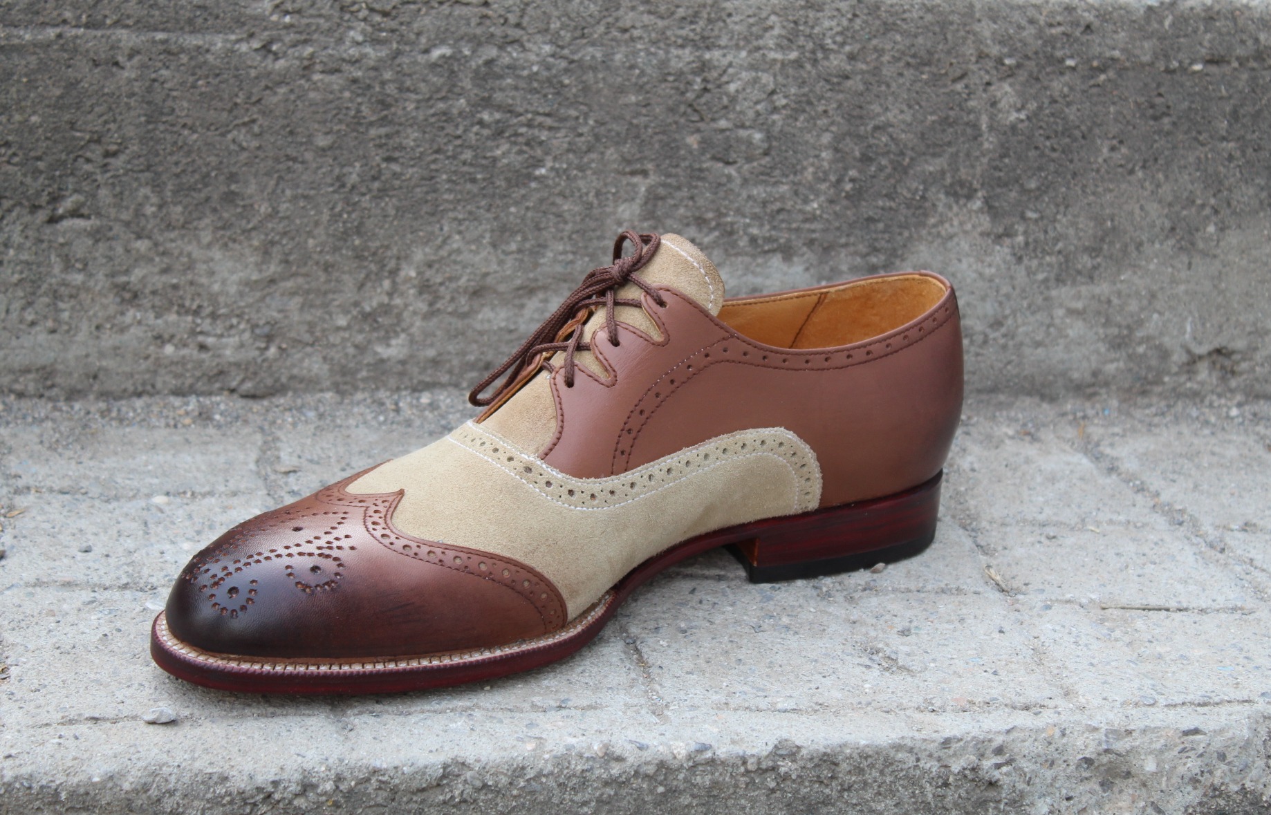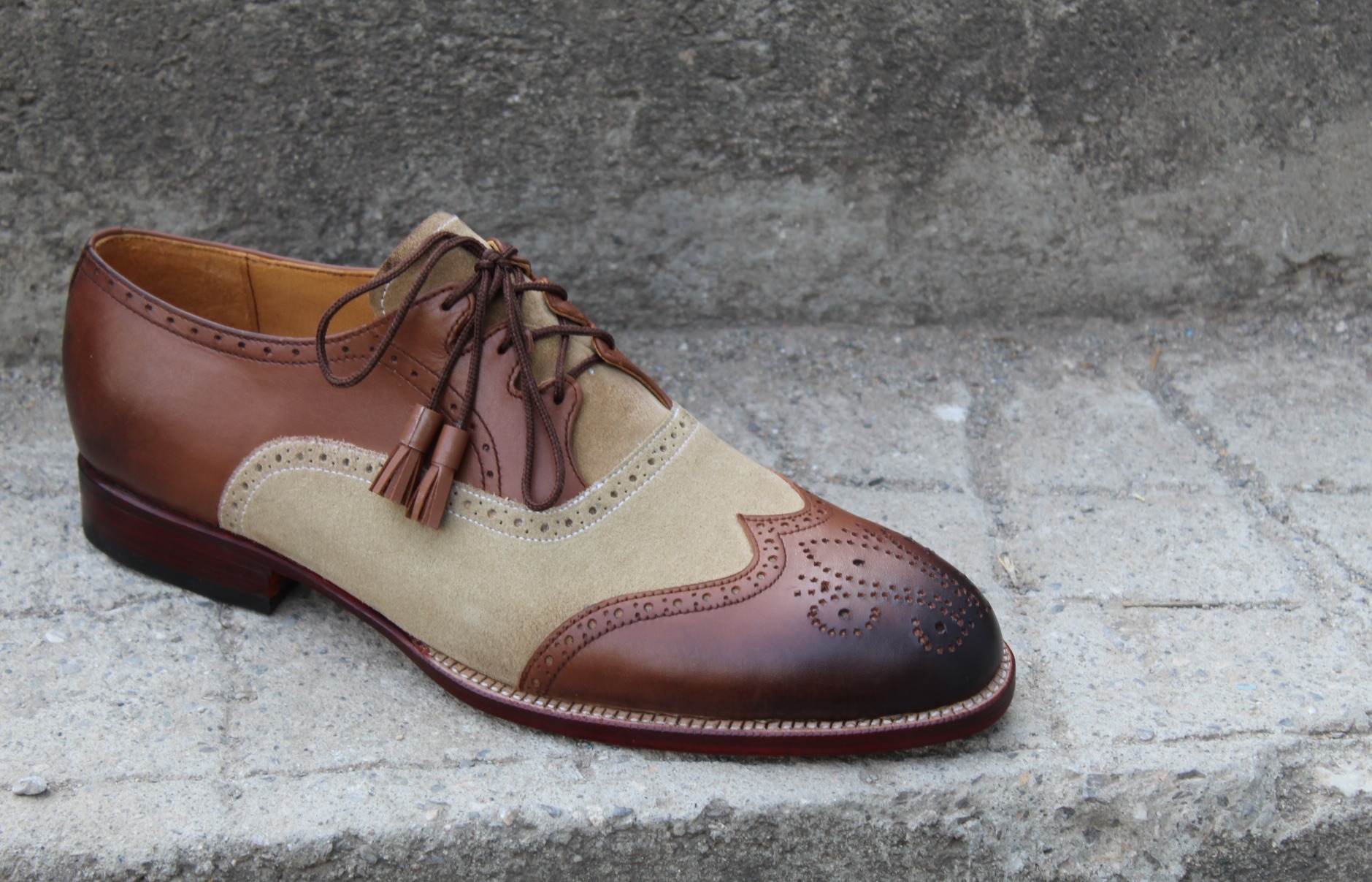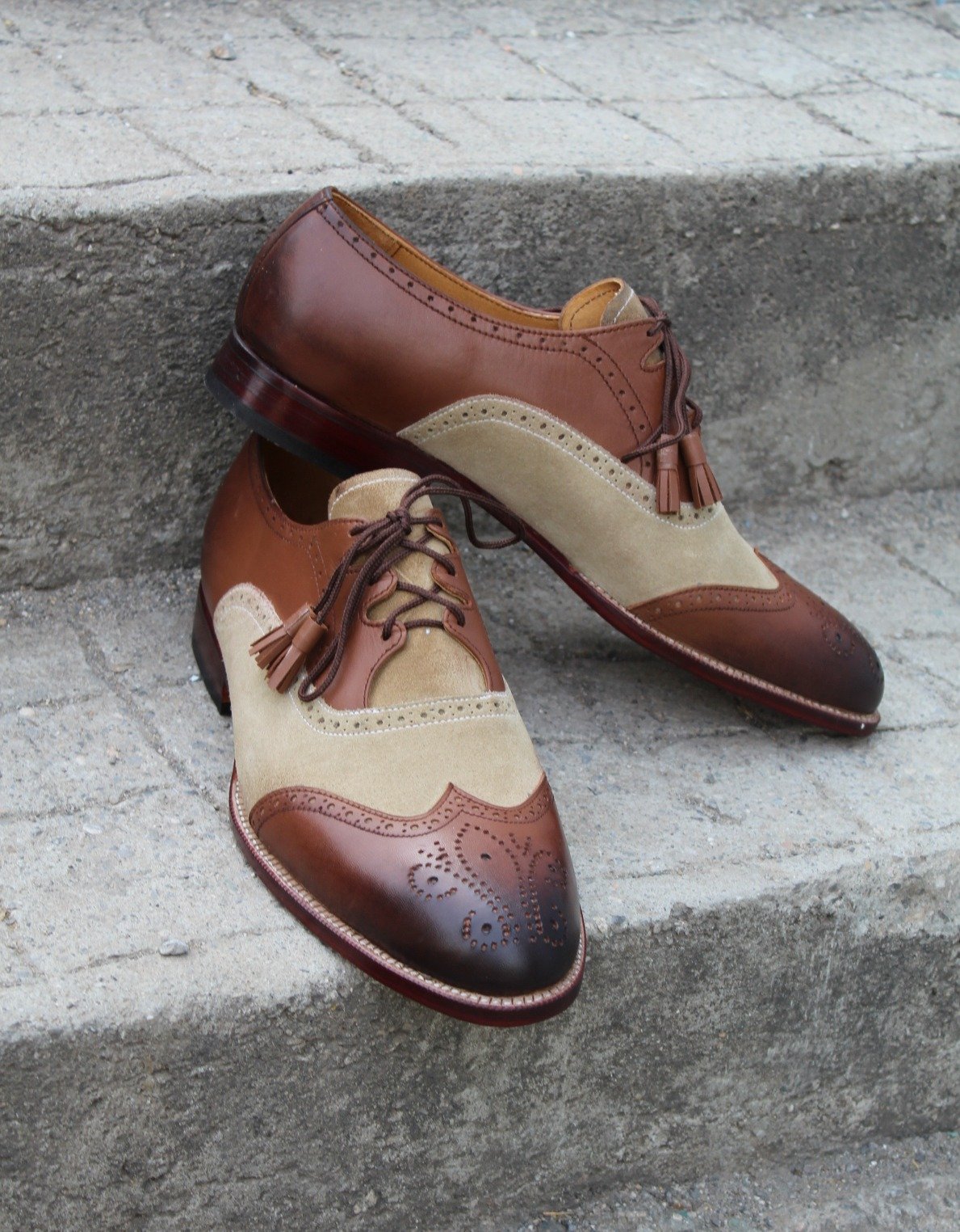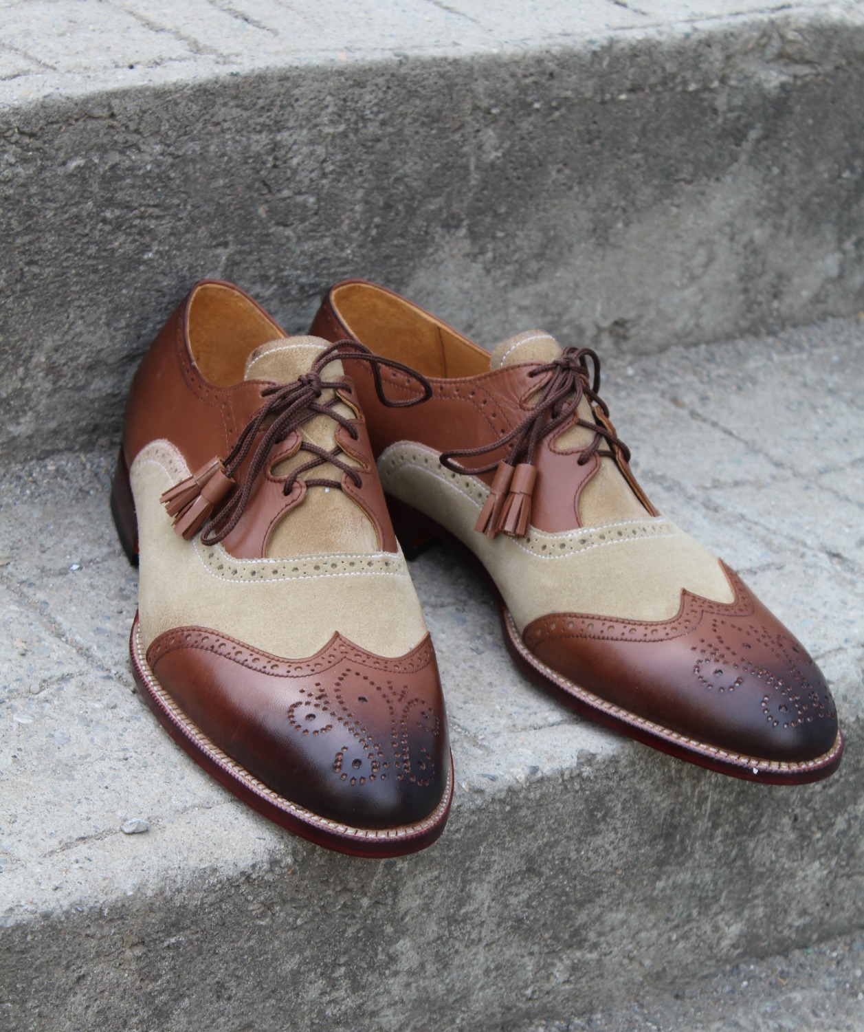 Crafted Leather Handmade Brown Leather Beige Suede Ghillie Lacing Wingtip Oxford Dress Shoes