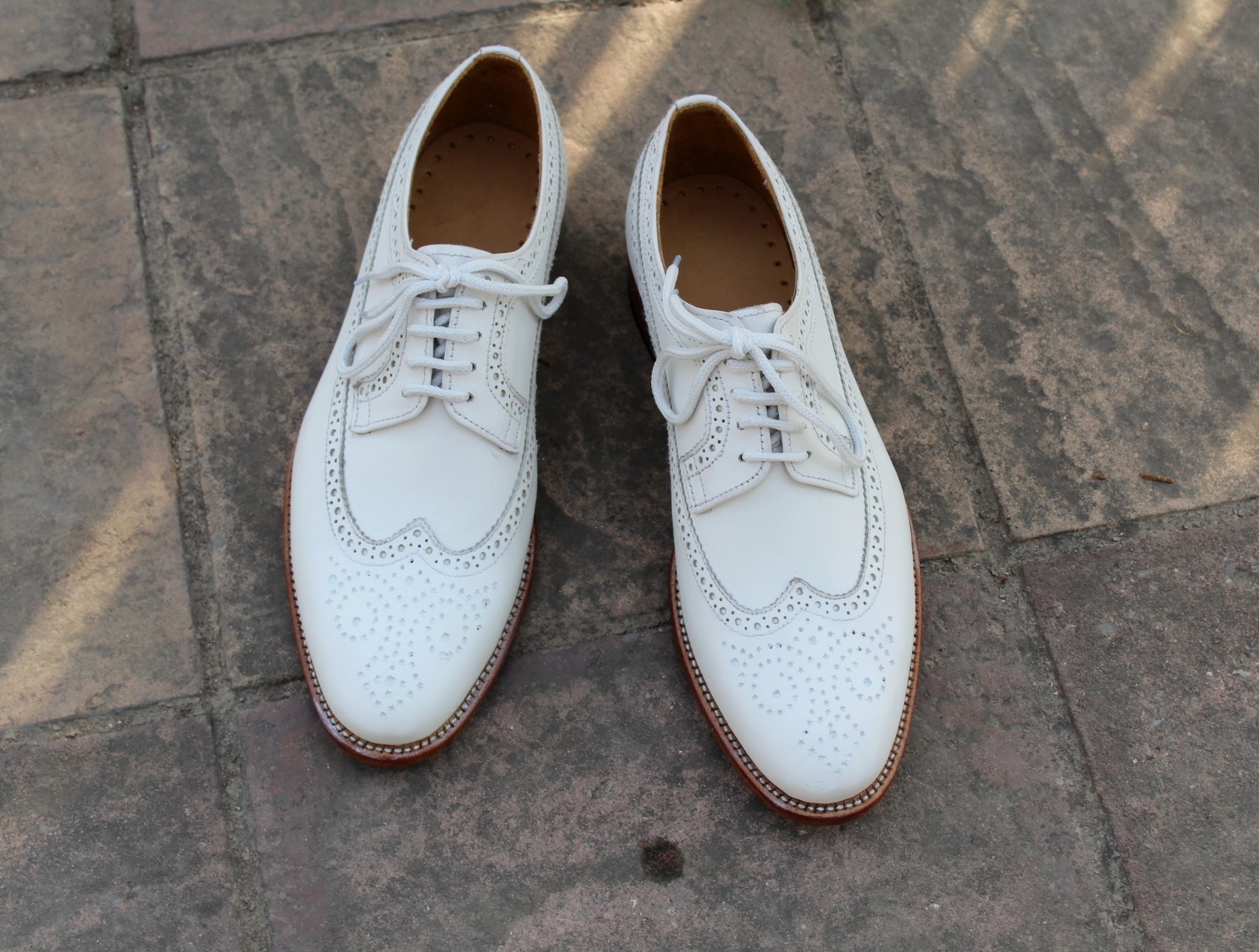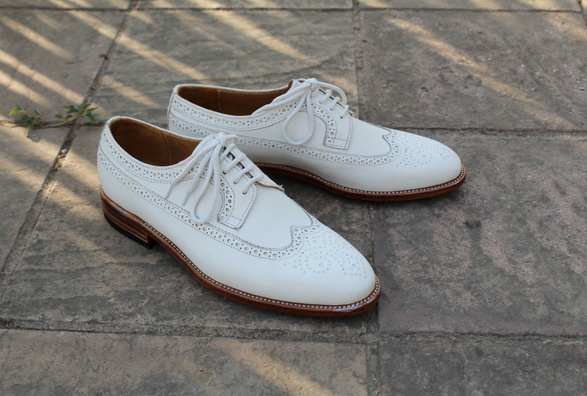 Crafted Leather Classic Men White Leather Wingtip Oxford Lace up Dress Shoes