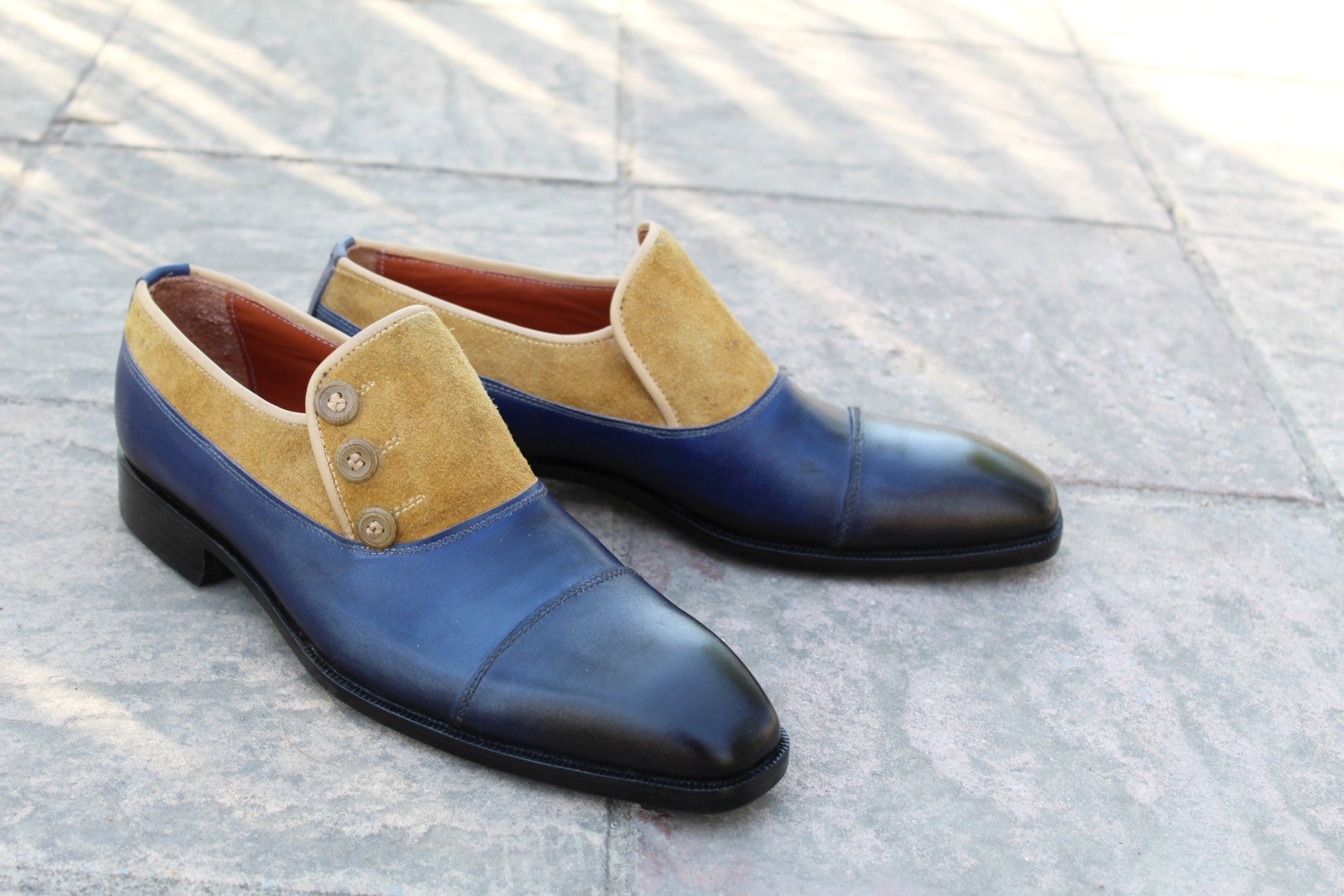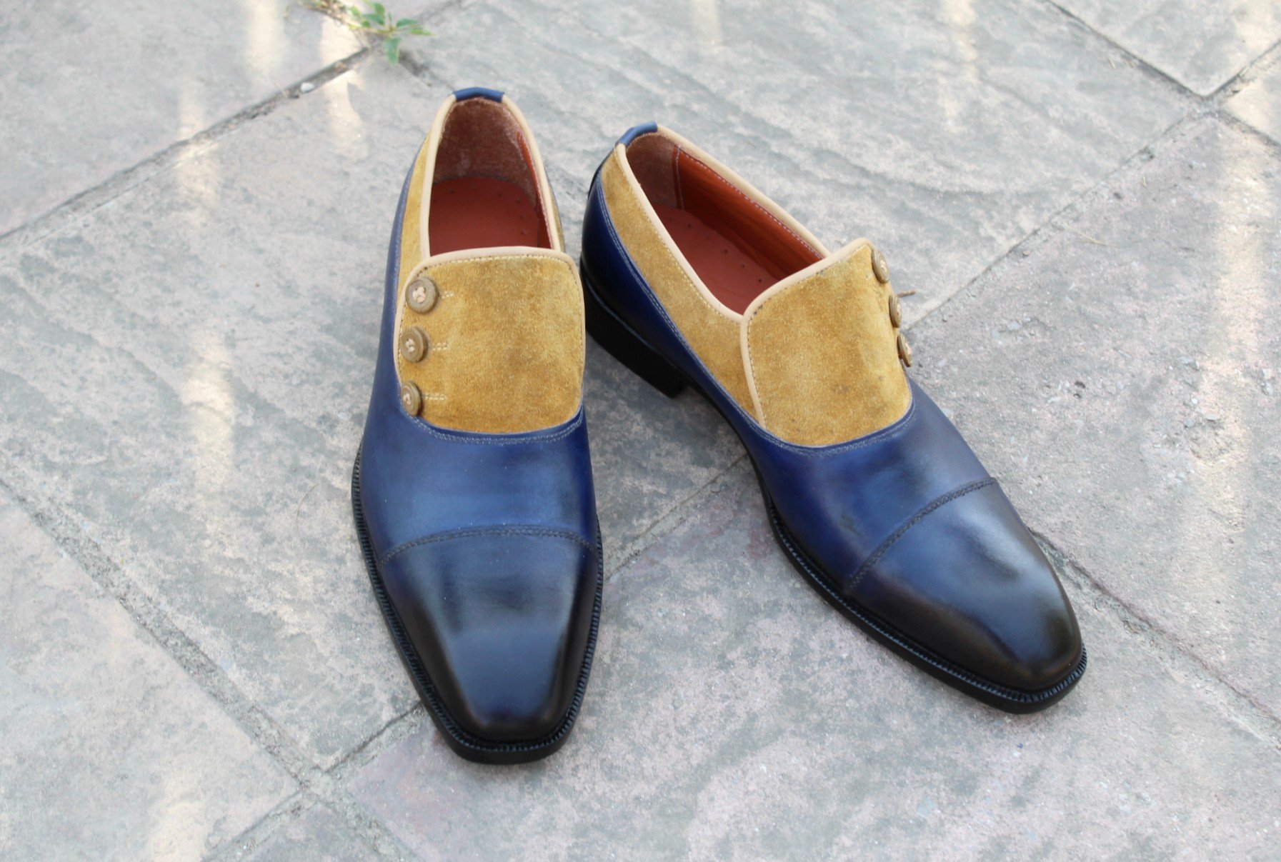 Inner: Soft Leather Sole: Leather Gender : Male Heel: Leather Color: Brown / Blue Style: Button Dress Shoes Lining Soft Calf Leather Lining Totally Hand stitched Manufacturing time 7-10 business days If you can’t find your Size/Colorjust send us message we will make for you.