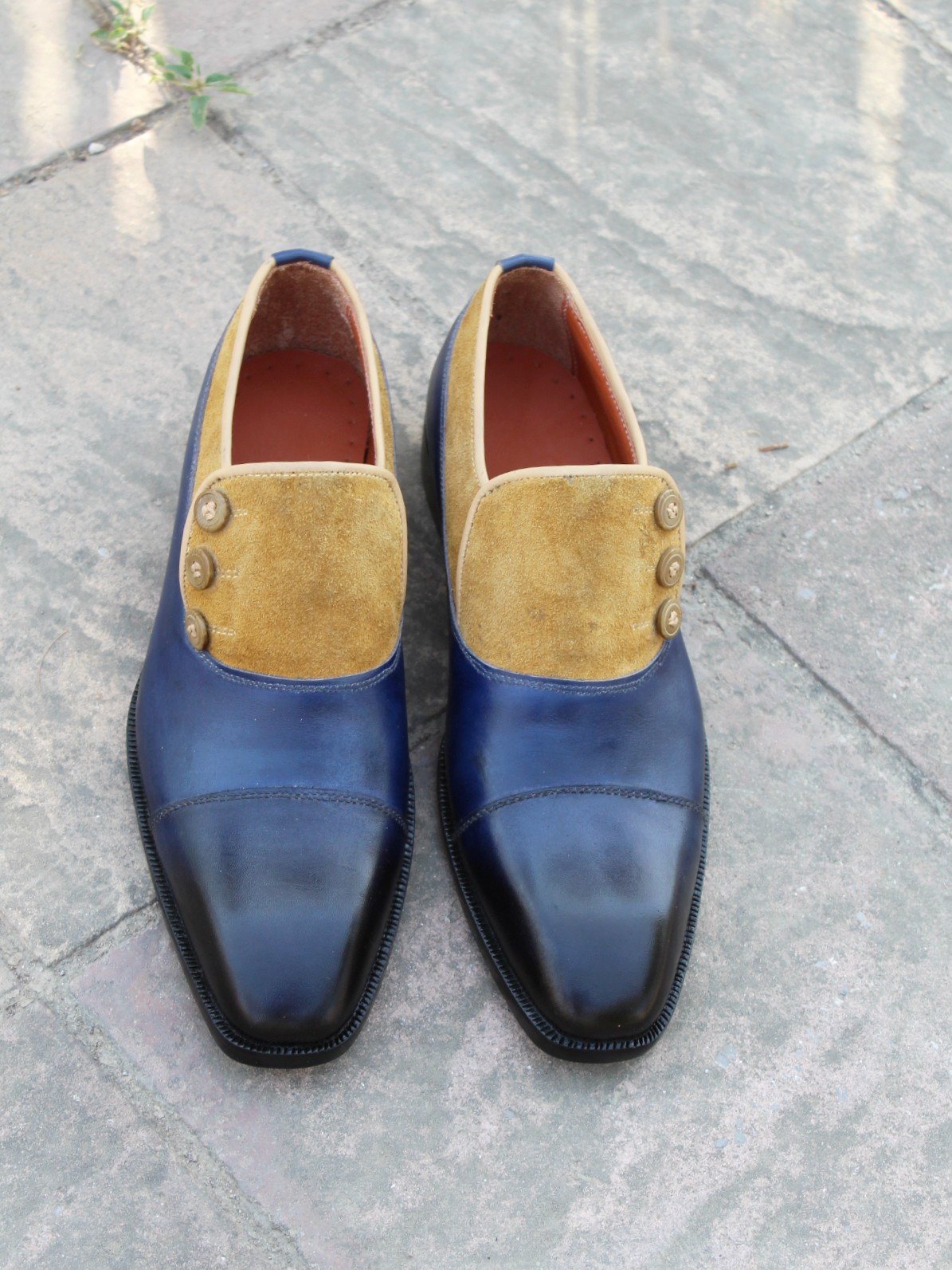 Crafted Leather Men Blue Brown Suede Leather Button Dress Shoes