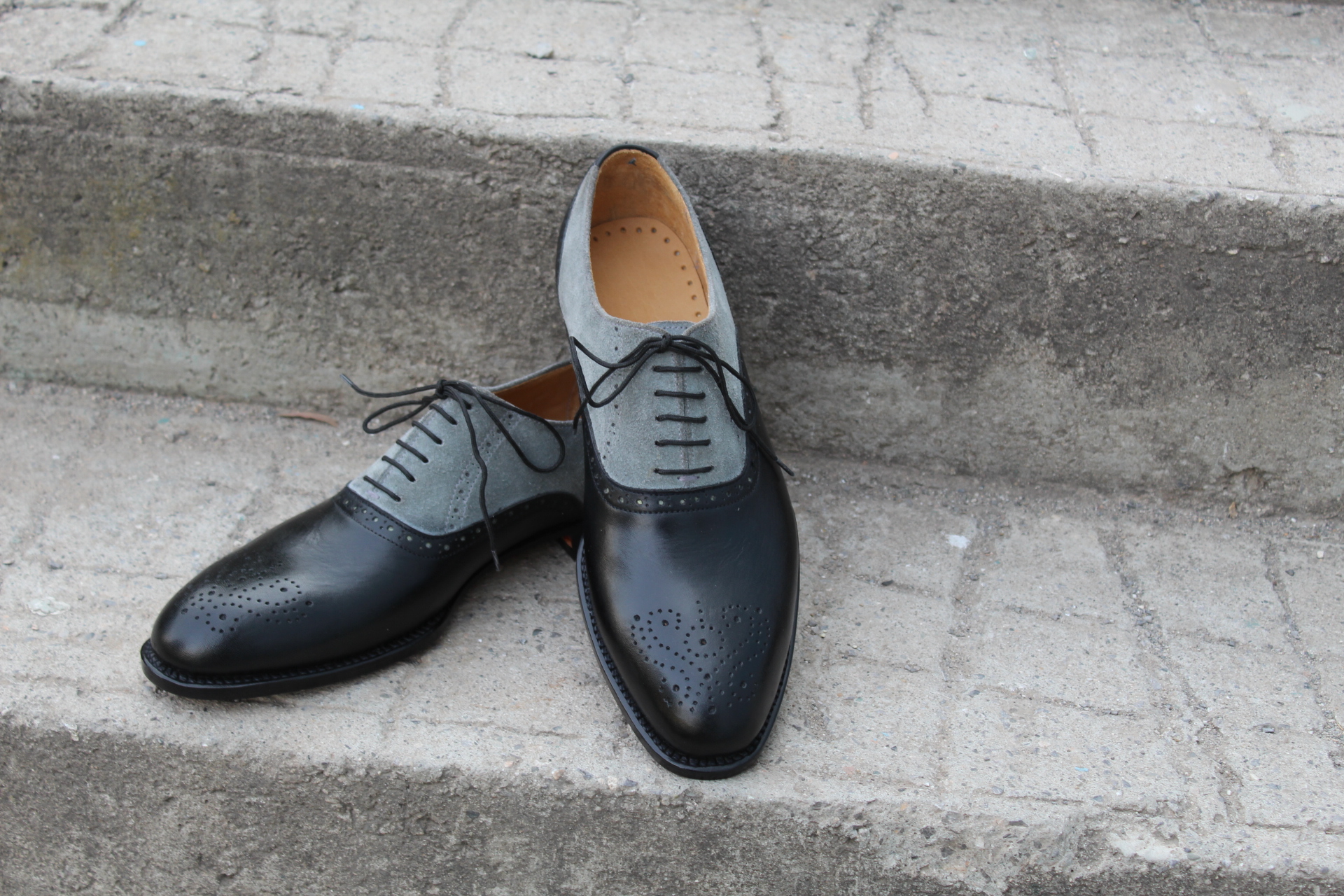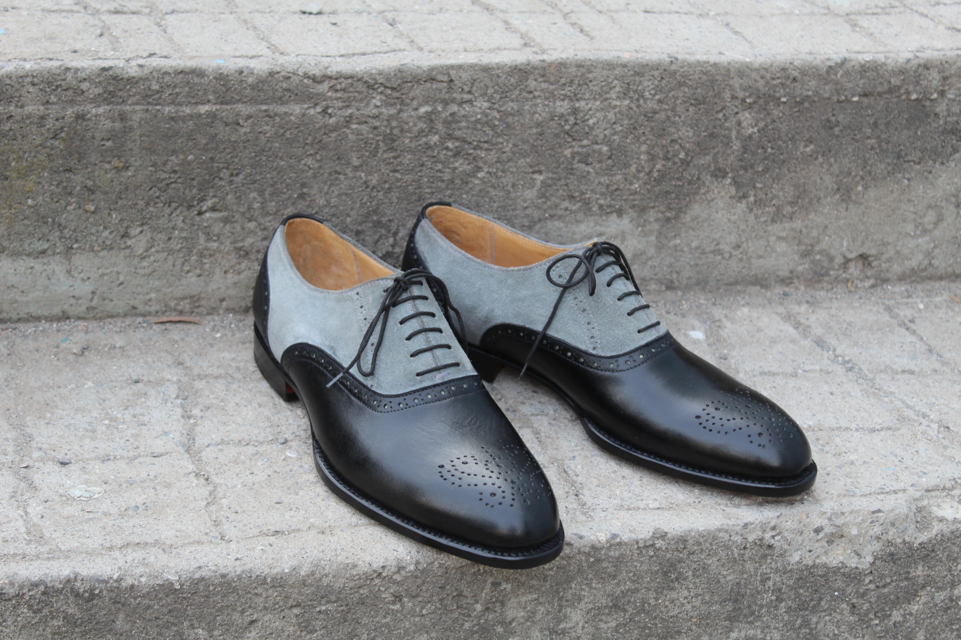 Crafted Leather Handmade Black Leather Gray Suede Oxford Lace up Dress Shoes