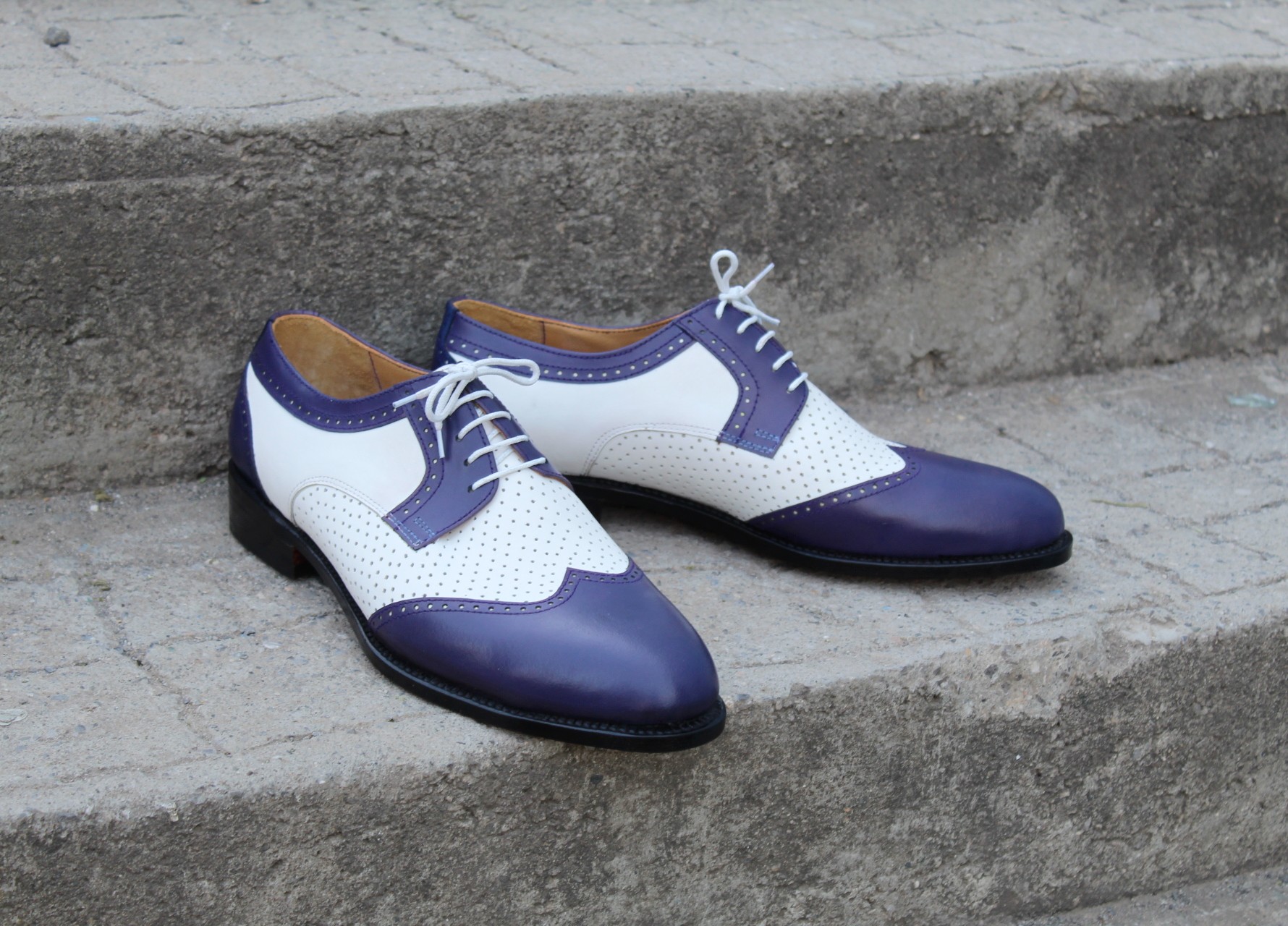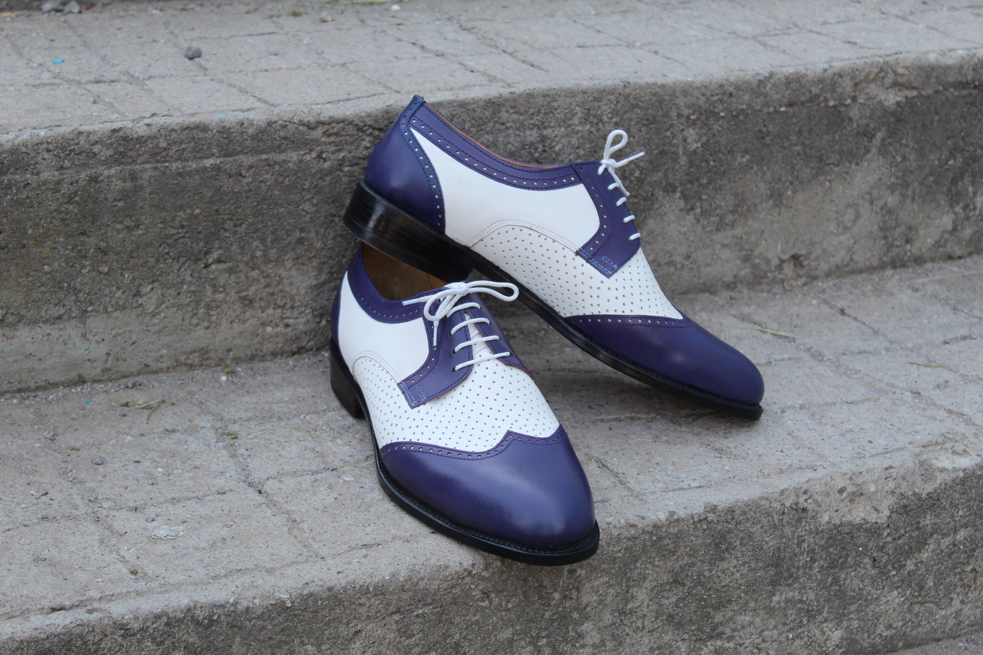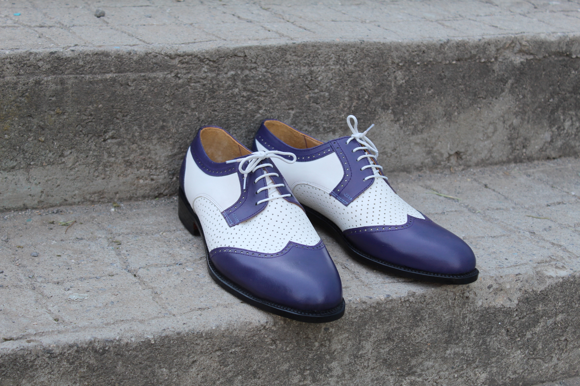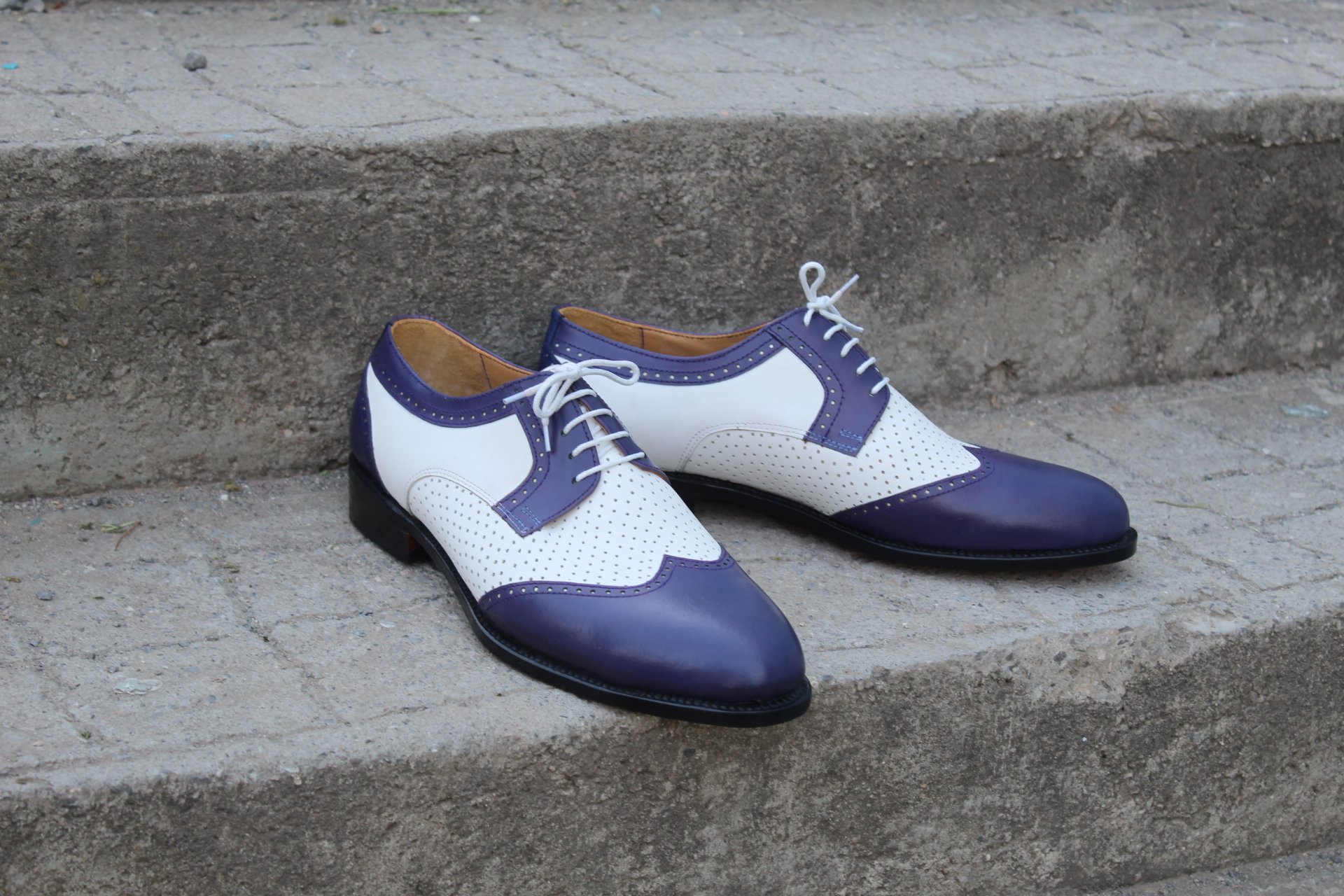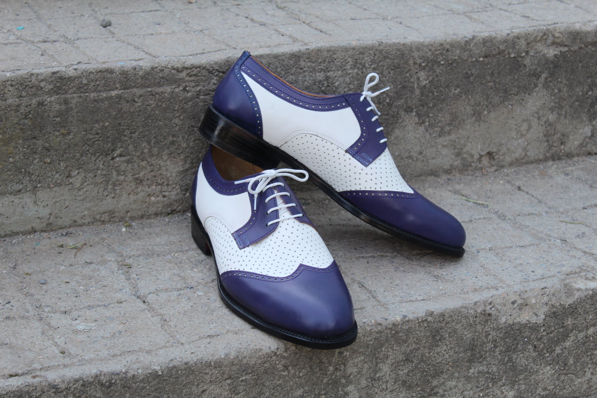 Crafted Leather Handmade Purple White Leather Wingtip Oxford Lace up Dress Shoes