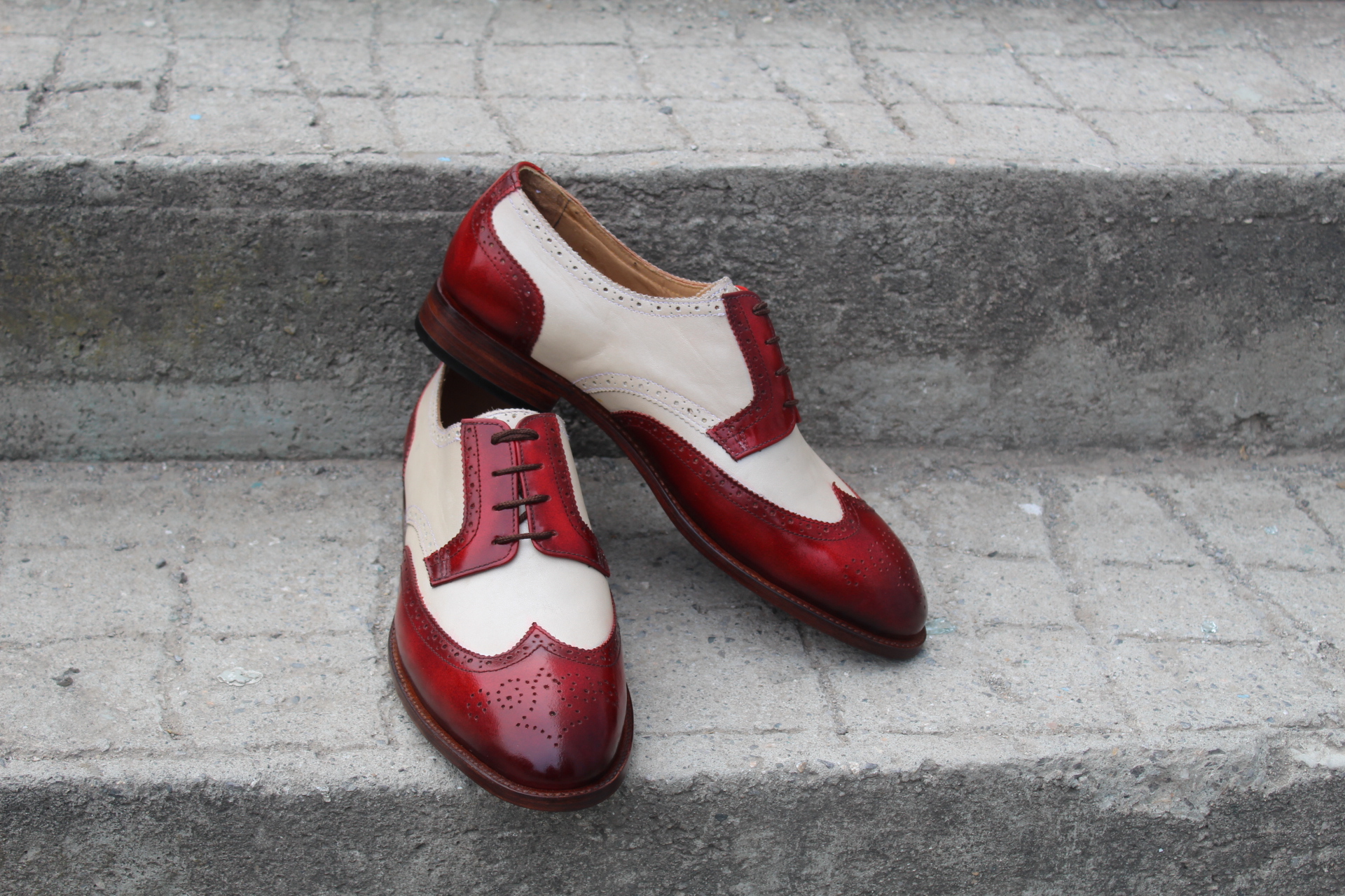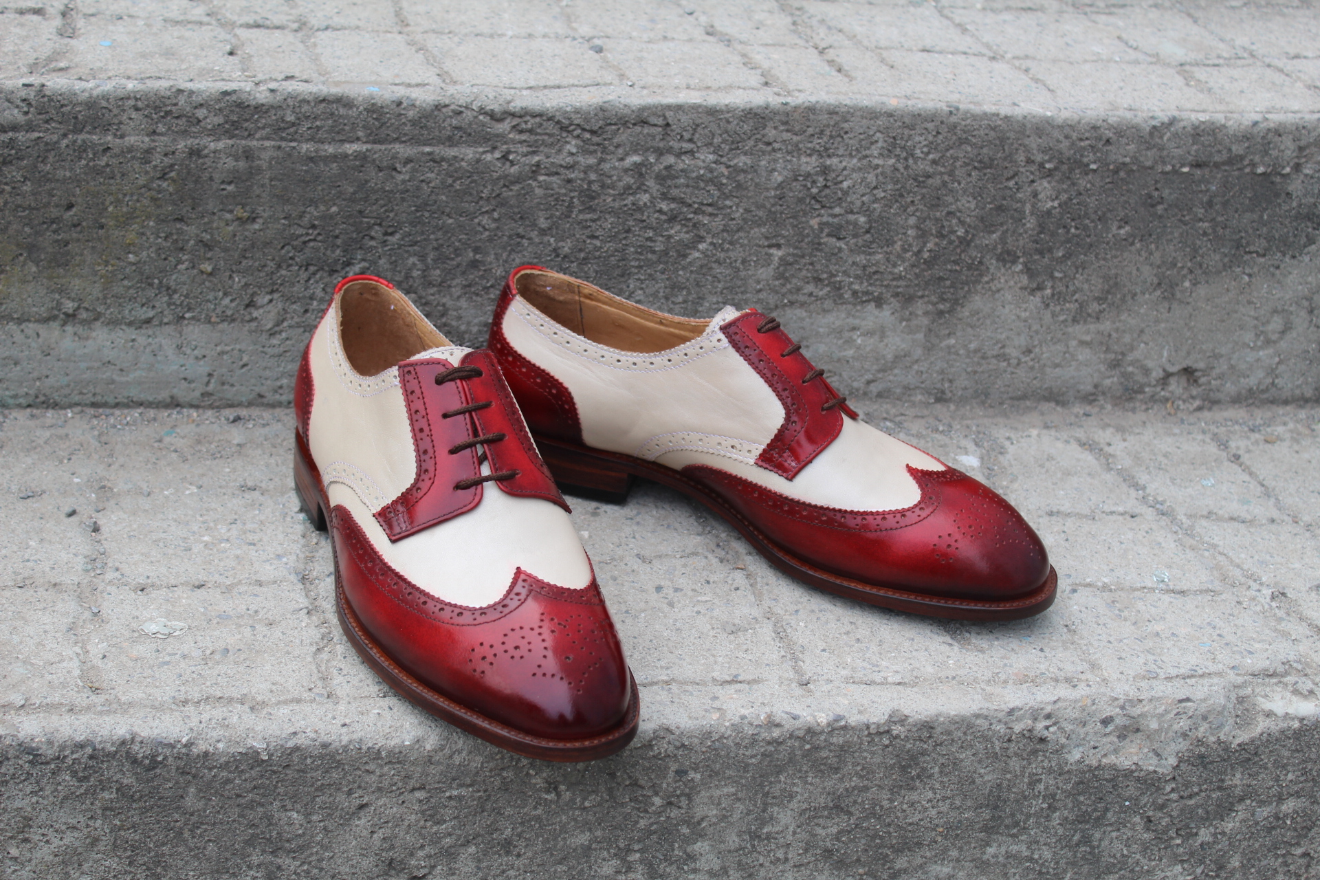 Crafted Leather Classic Beige and Burgundy Leather Wingtip Oxford Lace up Dress Shoes