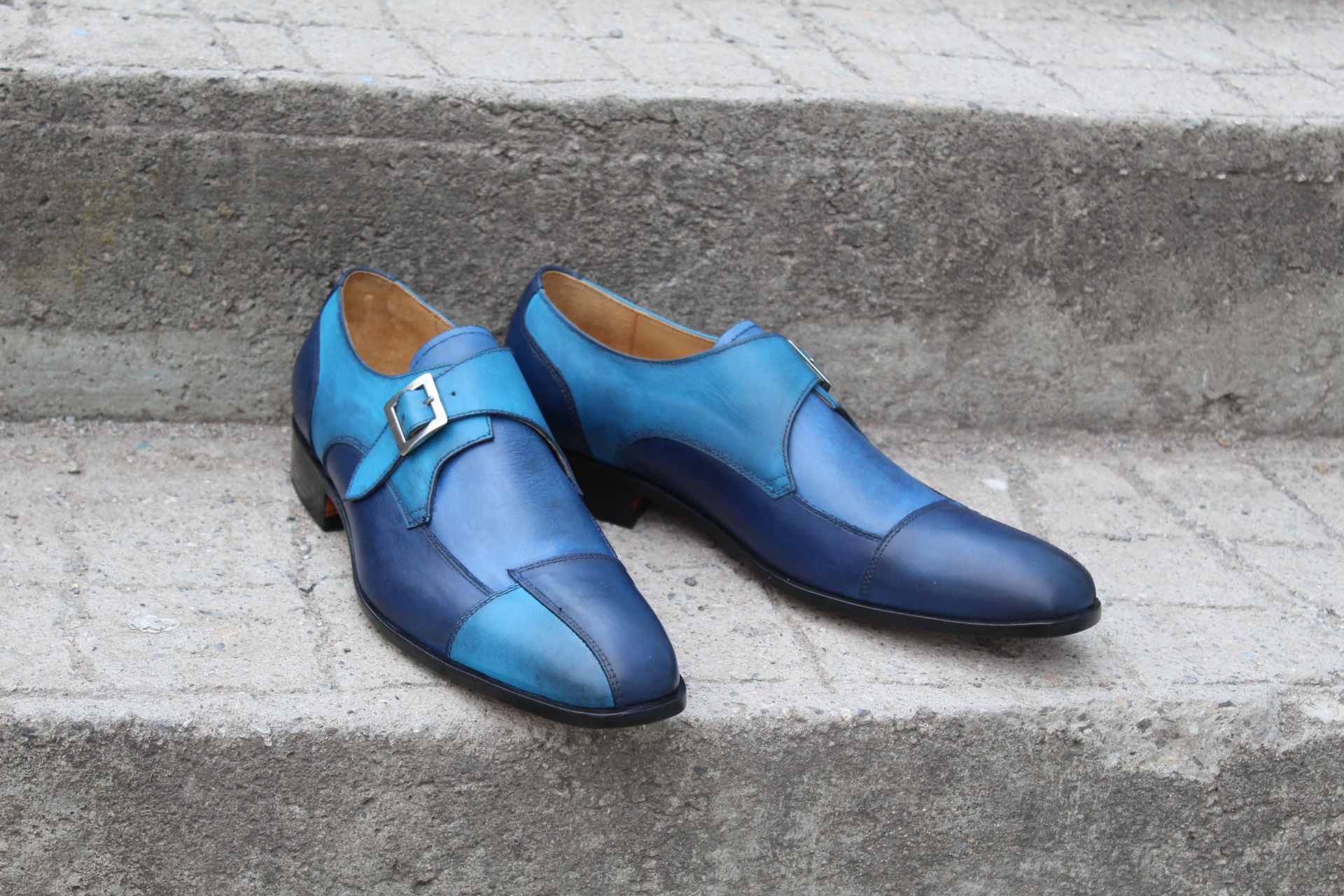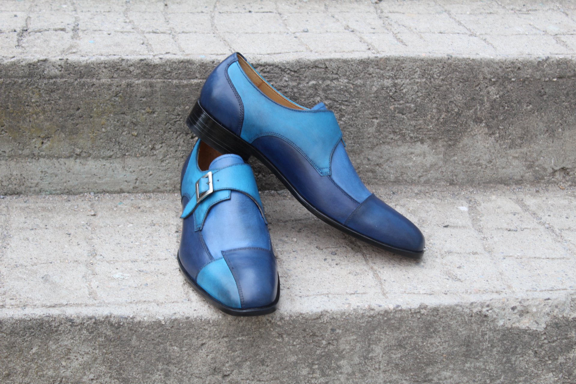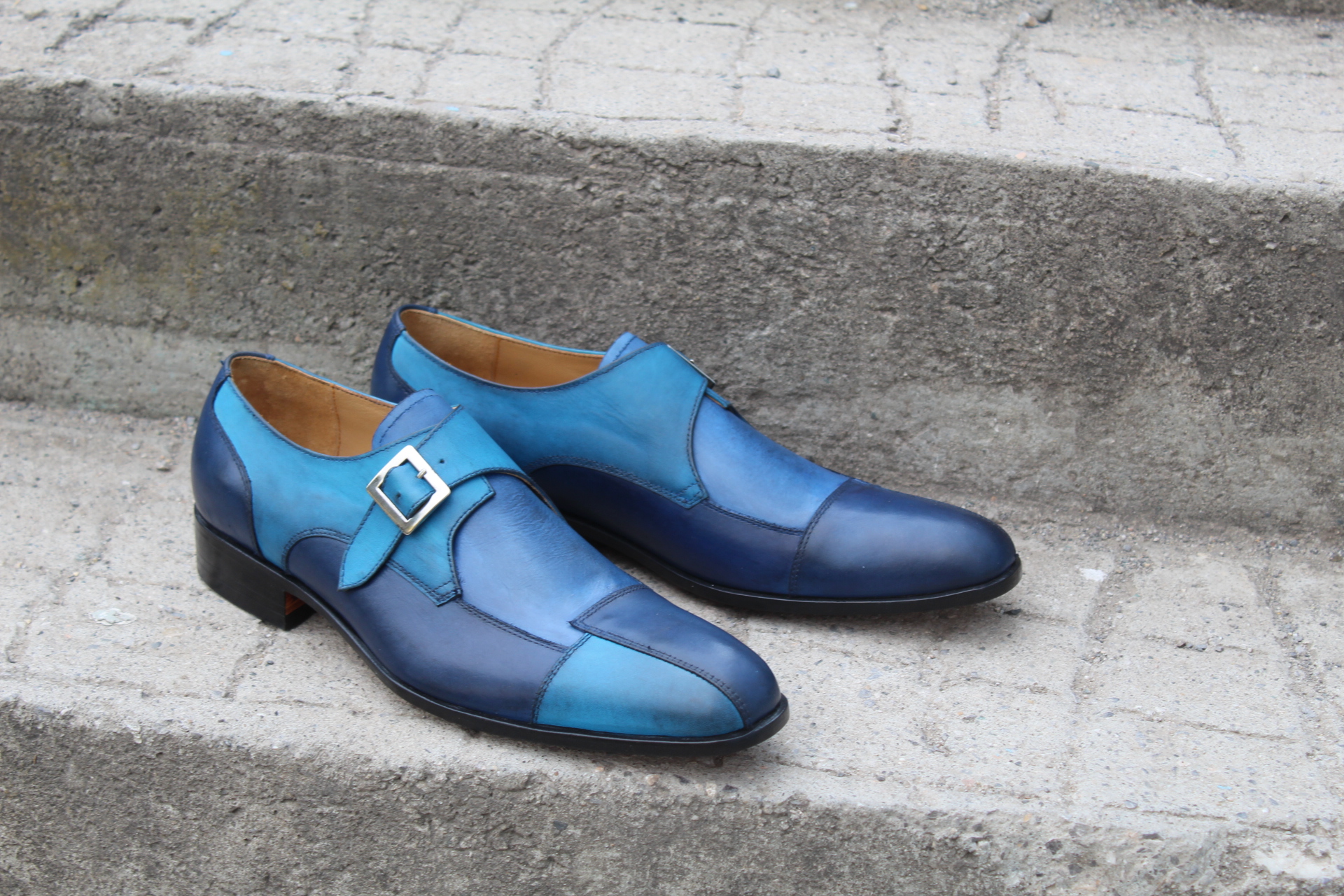 Crafted Leather Single Monk Strap Dress Shoes in Blue Leather