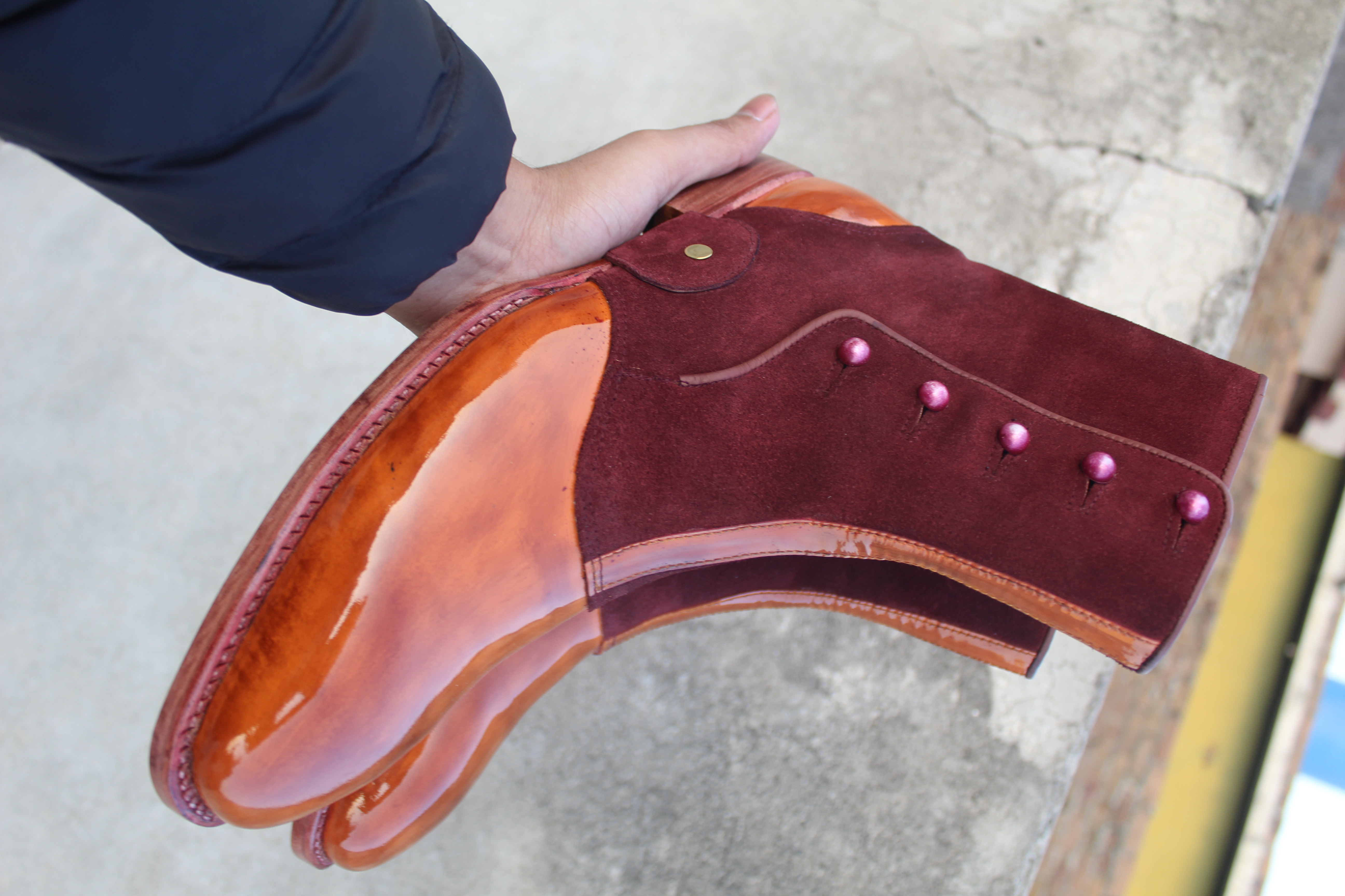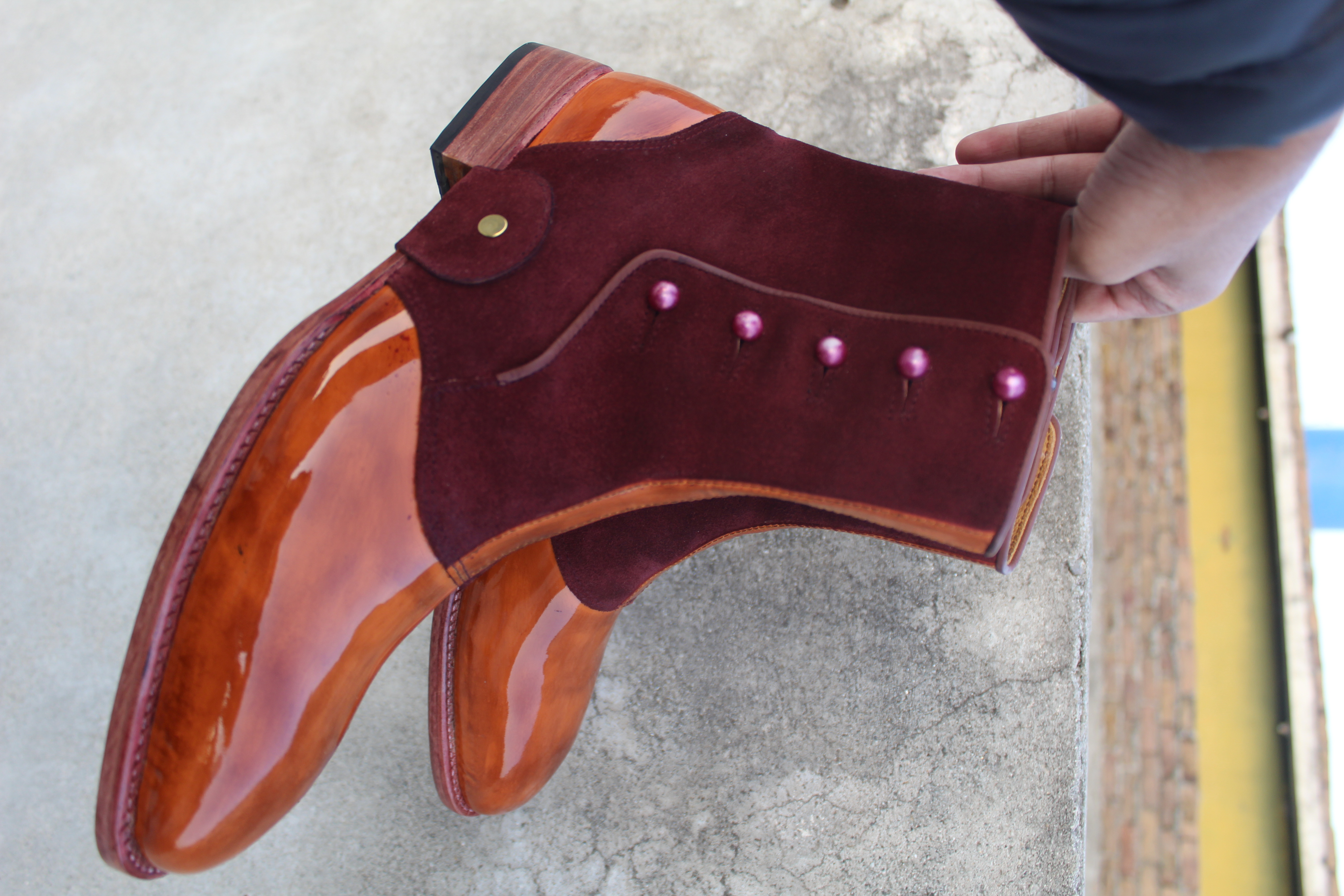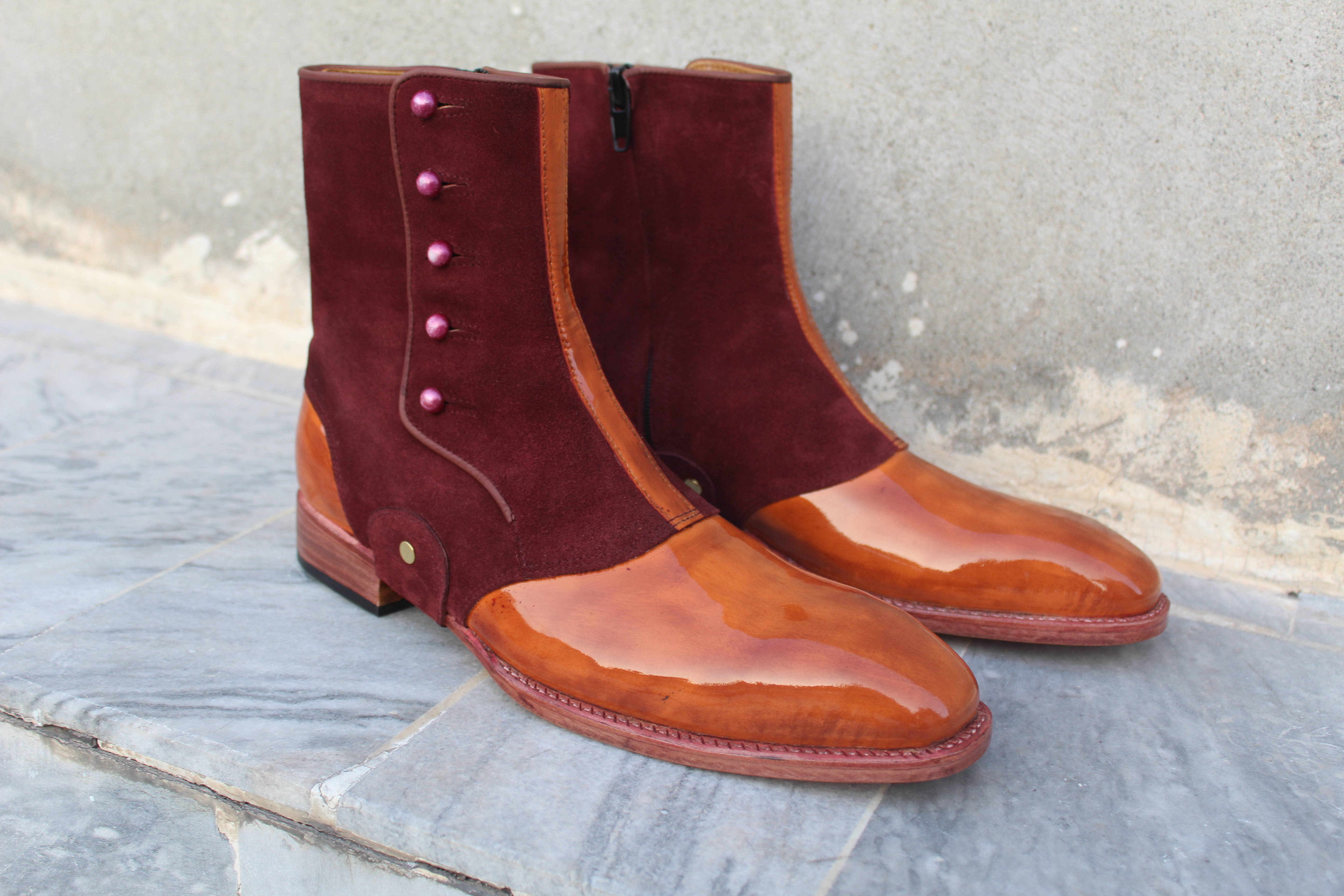 New Crafted Leather Bespoke Dress Shoes Two Tone Brown Patent Leather & Suede Ankle High Button Boot
