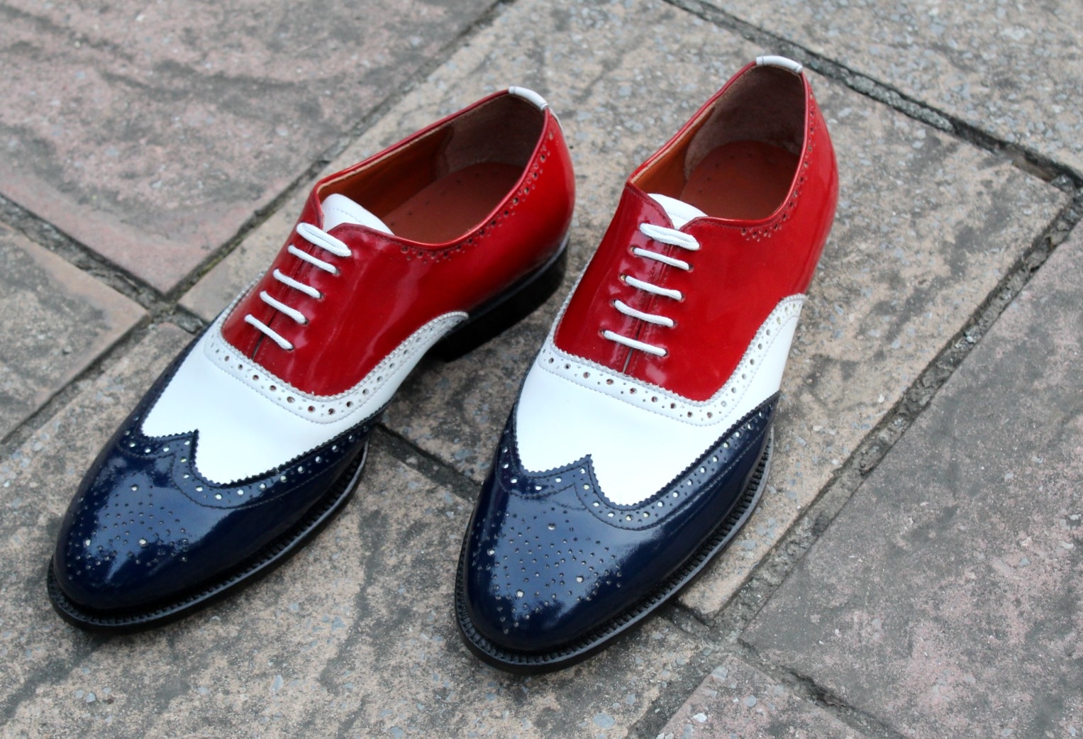 Inner: Soft Leather Sole: Leather Gender : Male Heel: Leather Color: Red / White / Blue Style: Oxford Shoes Lining Soft Calf Leather Lining Totally Hand stitched Manufacturing time 7-10 business days If you can’t find your Size/Colorjust send us message we will make for you.