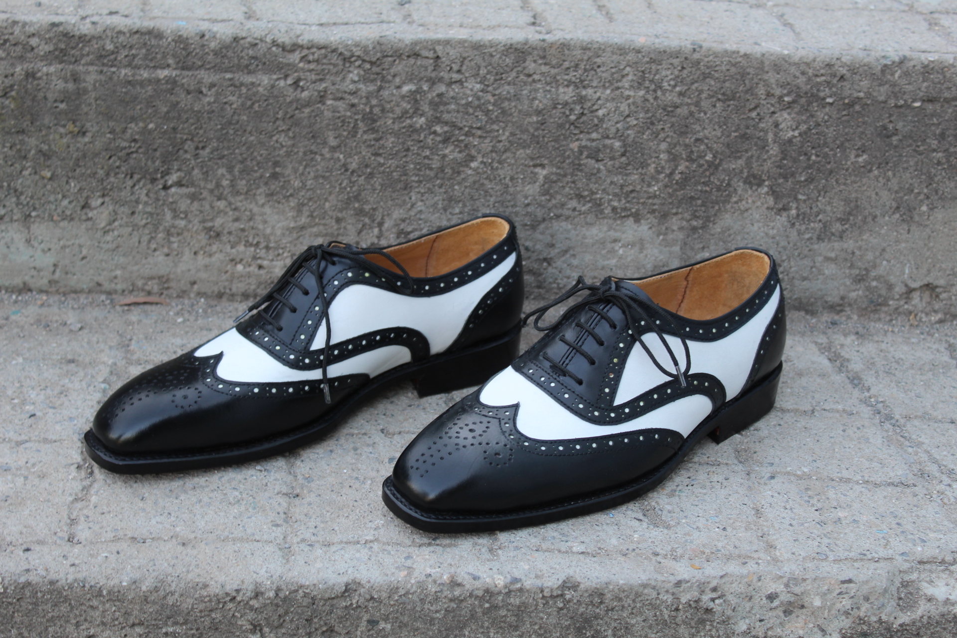 Inner: Soft Leather Sole: Leather Gender : Male Heel: Leather Color: Black / White Style: Wingtip Oxford Shoes Lining Soft Calf Leather Lining Totally Hand stitched Manufacturing time 7-10 business days If you can’t find your Size/Colorjust send us message we will make for you.