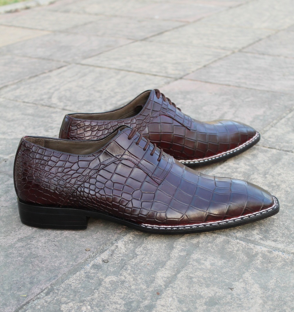 Crafted Leather Classic Dark Brown Patina Leather Crocodile/Alligator Lace up Dress Shoes