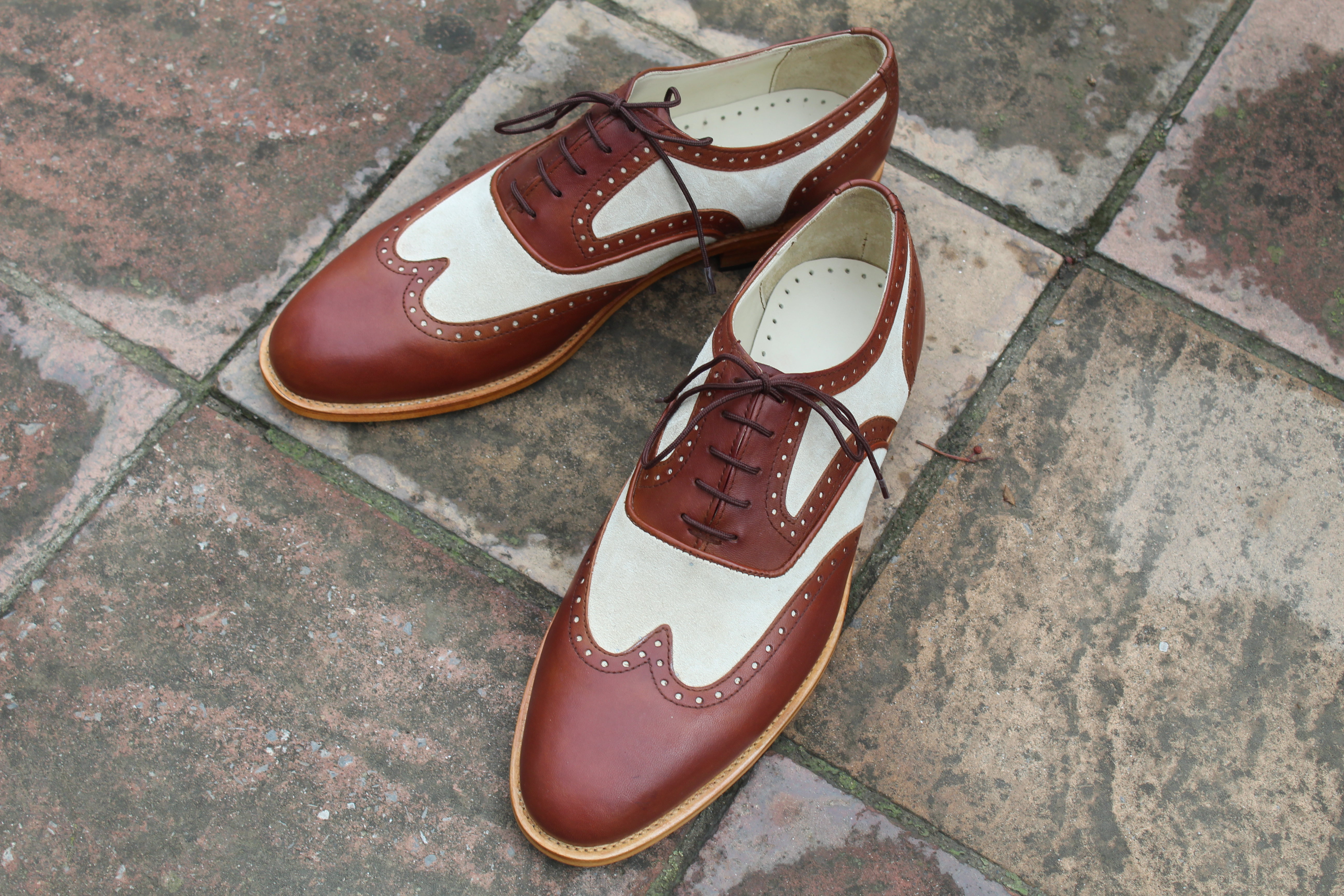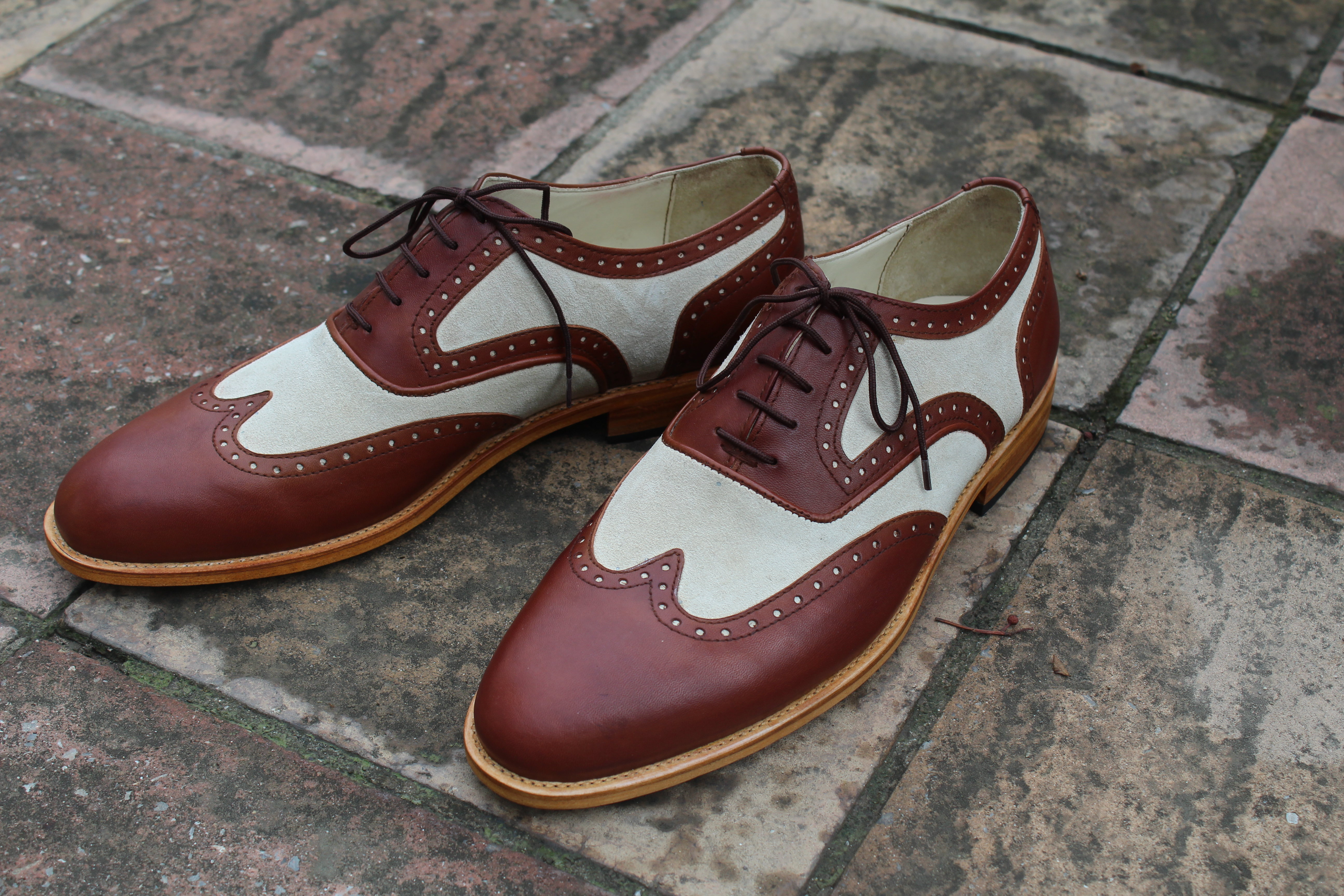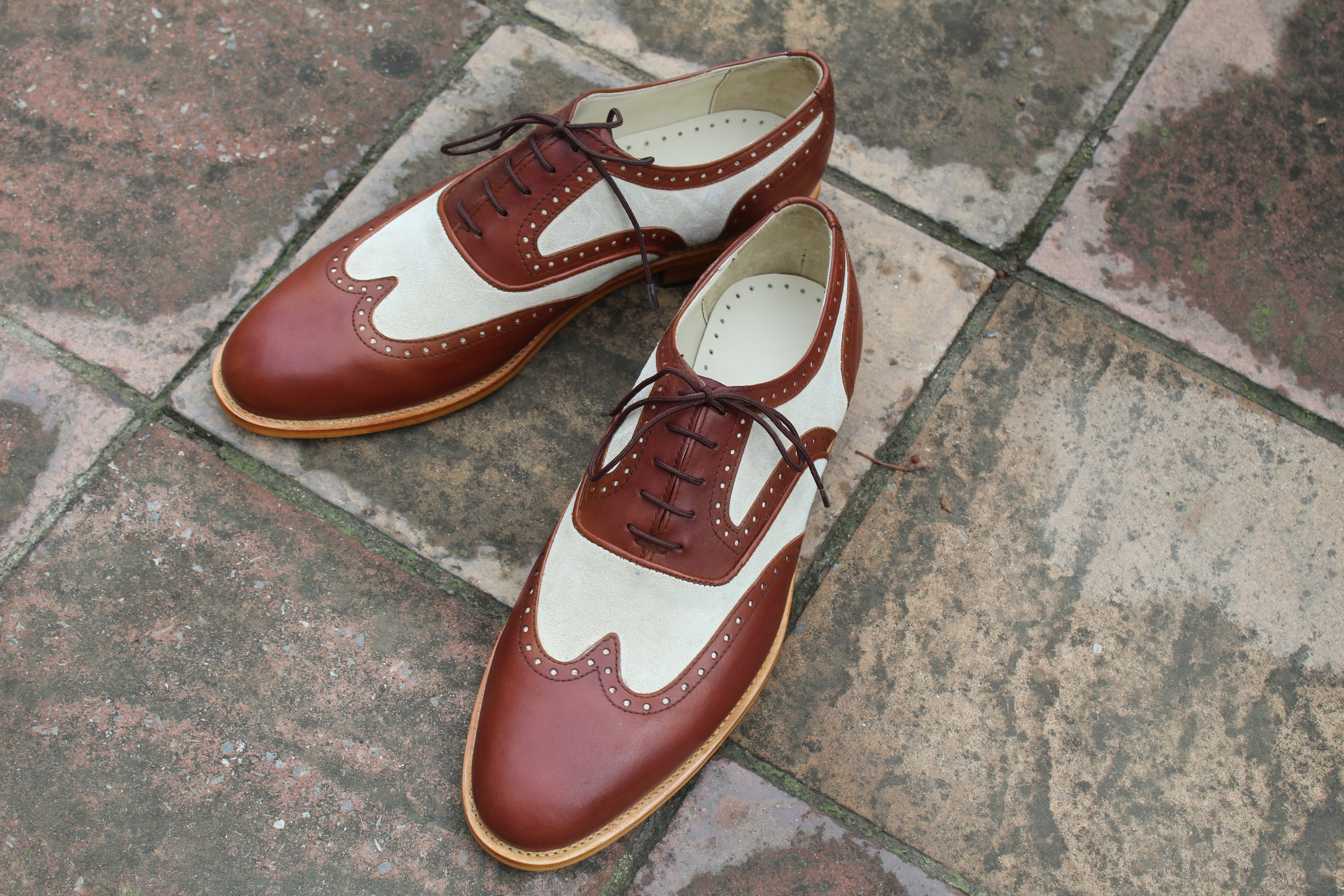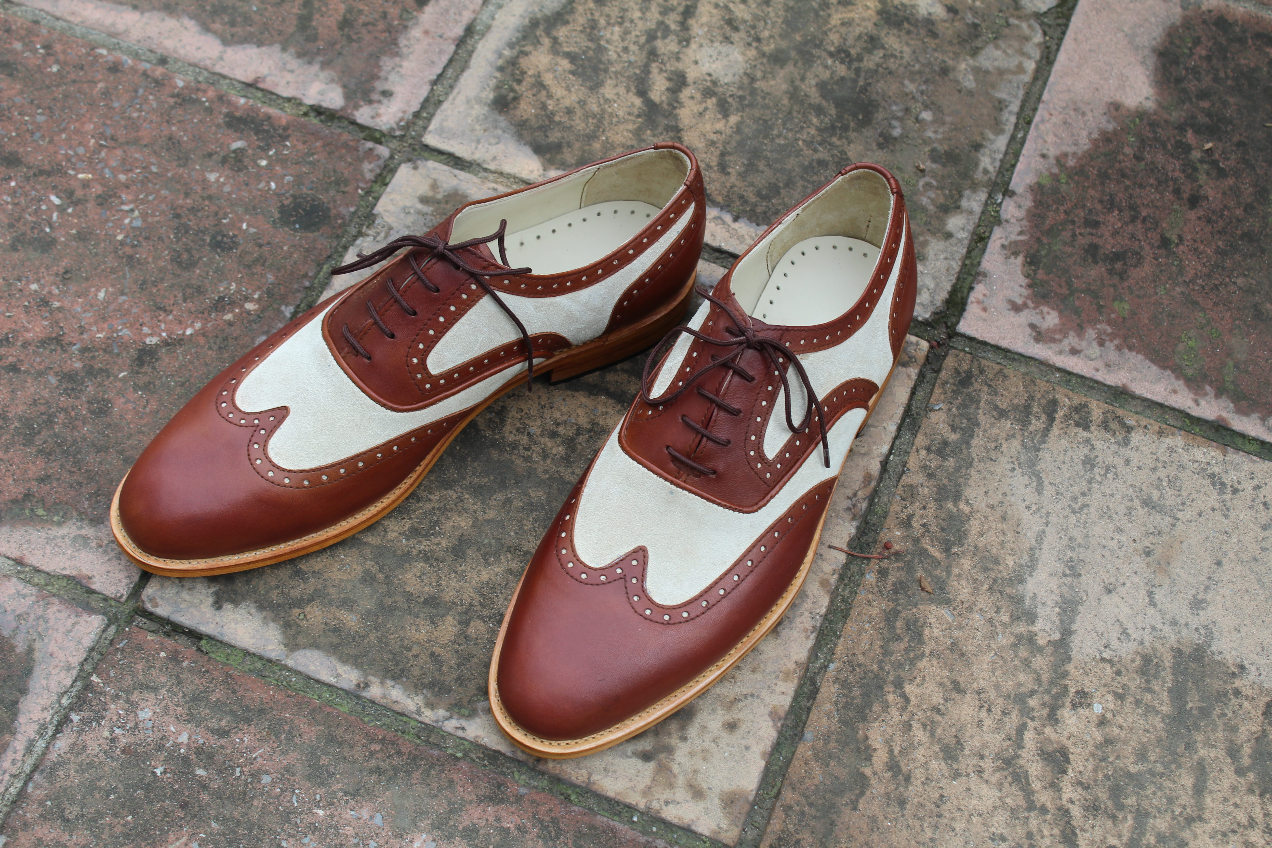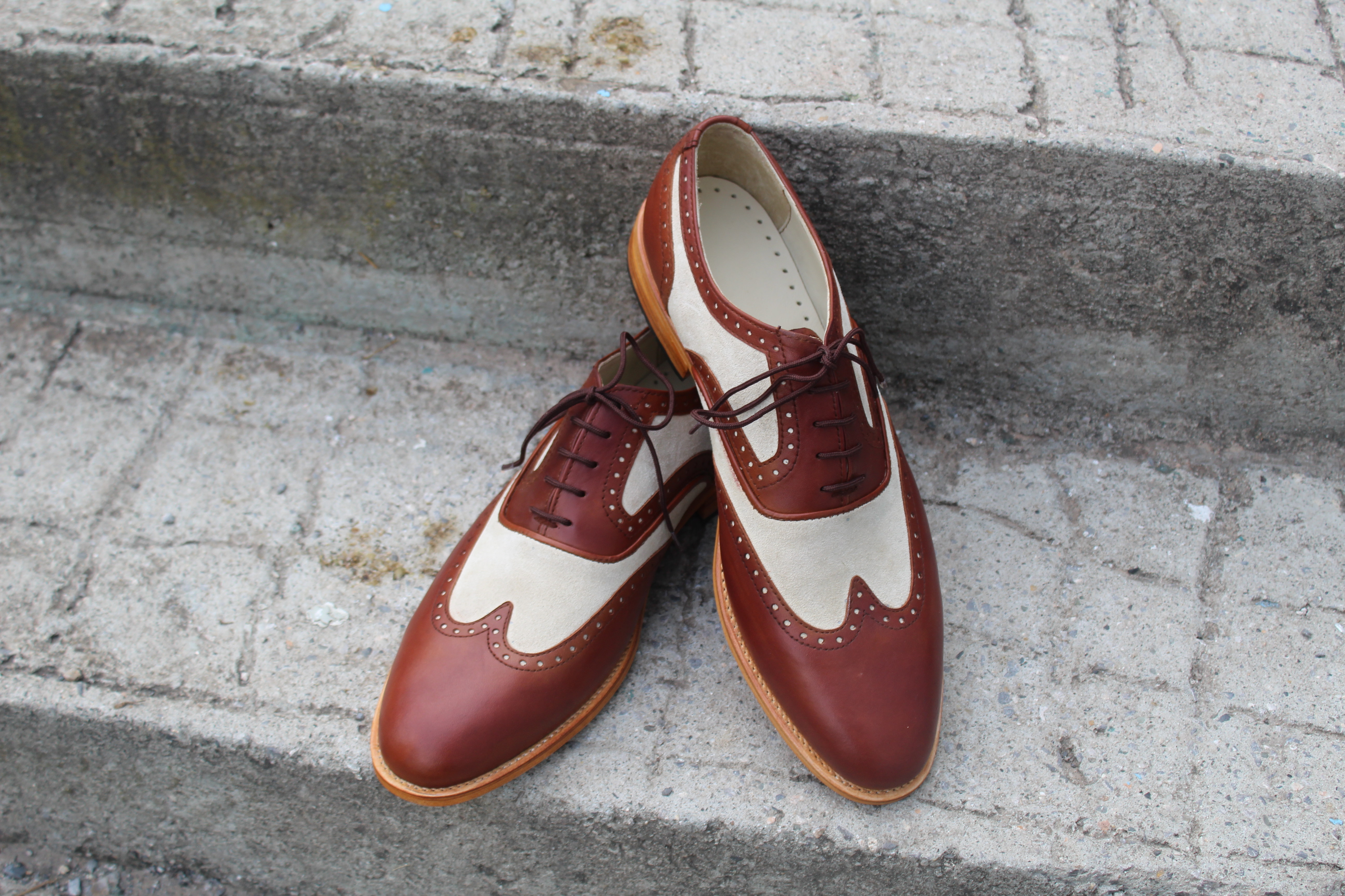 Inner: Soft Leather Sole: Leather Gender : Male Heel: Leather Color: Brown / White Style: Wingtip Oxford Shoes Lining Soft Calf Leather Lining Totally Hand stitched Manufacturing time 7-10 business days If you can’t find your Size/Colorjust send us message we will make for you.