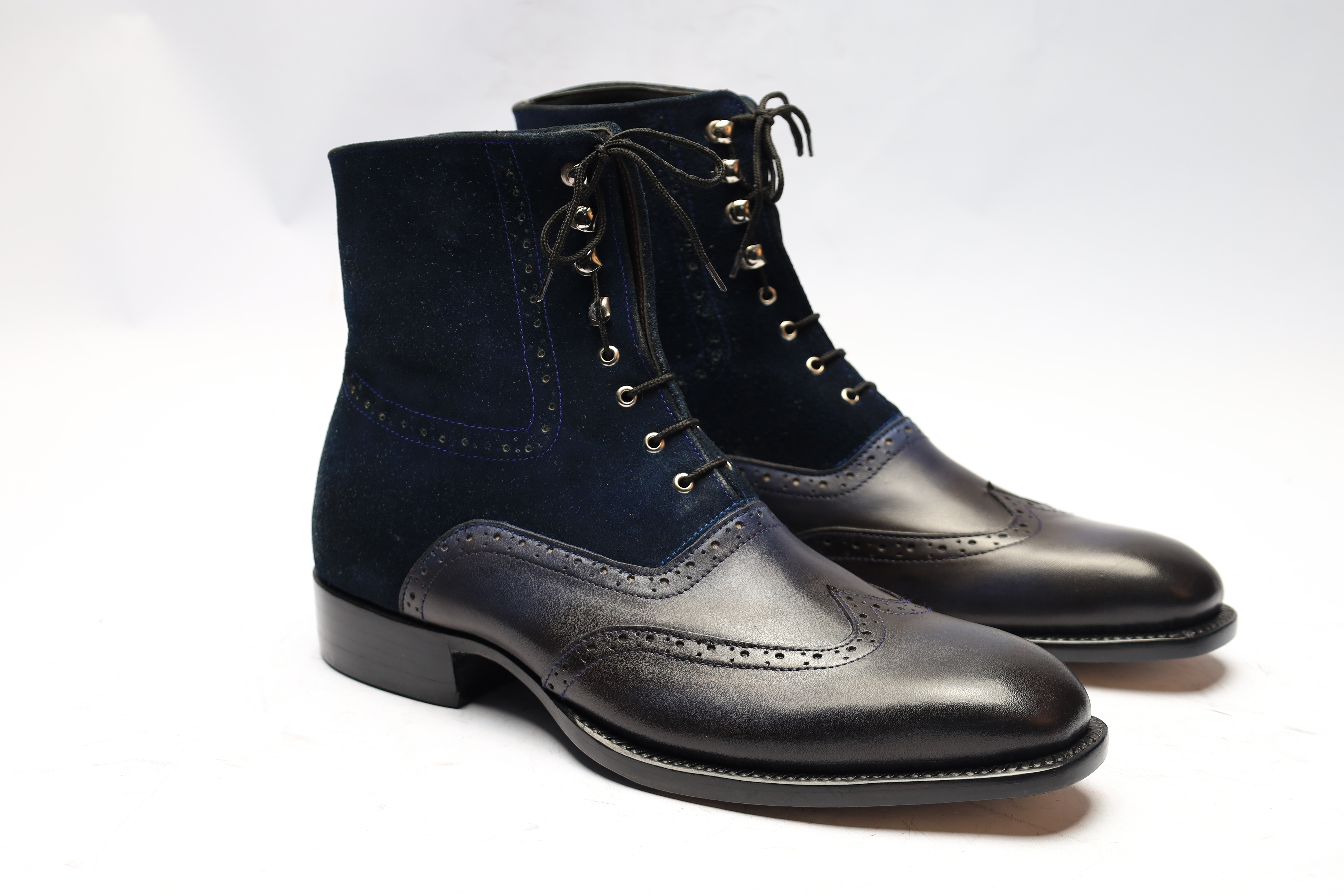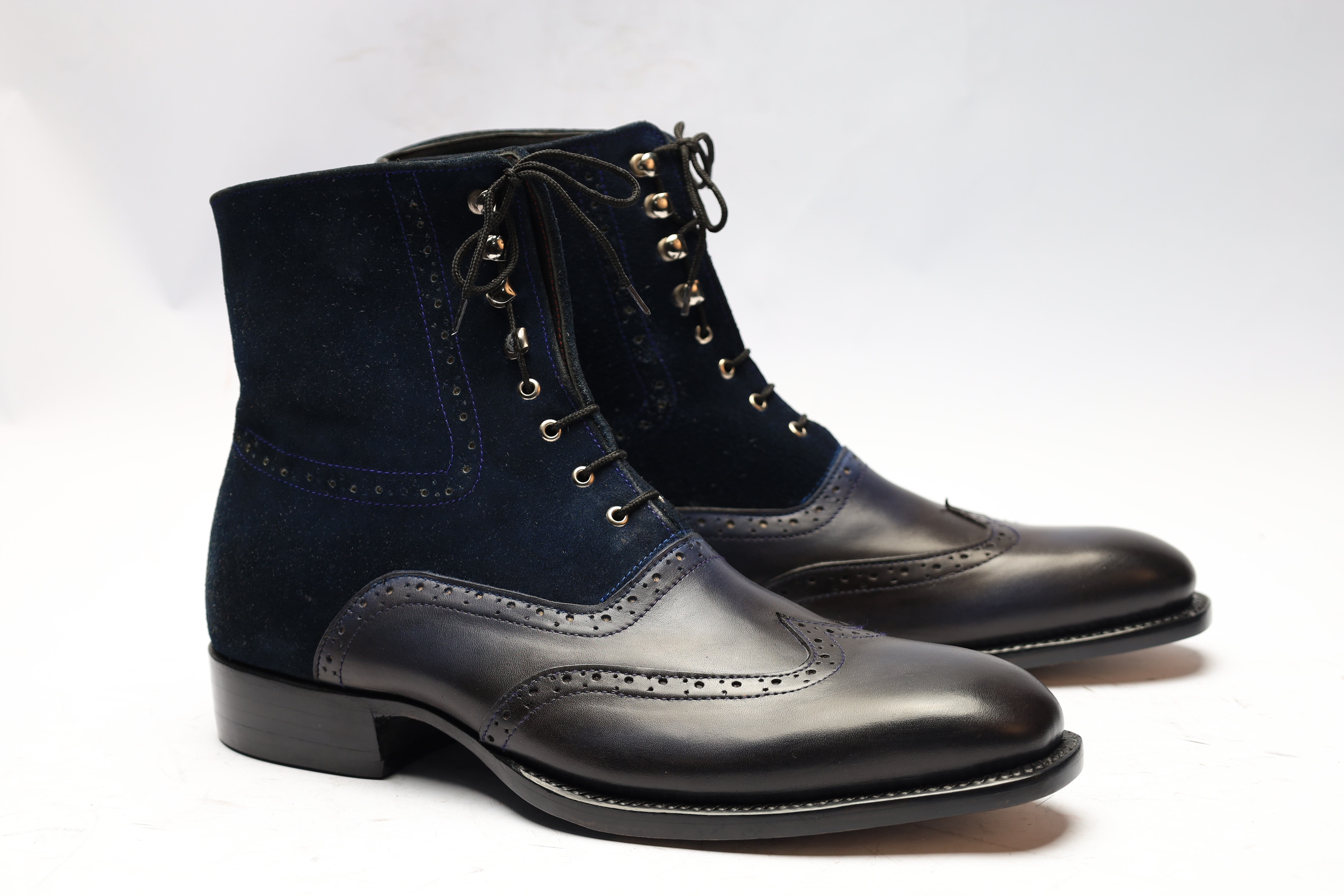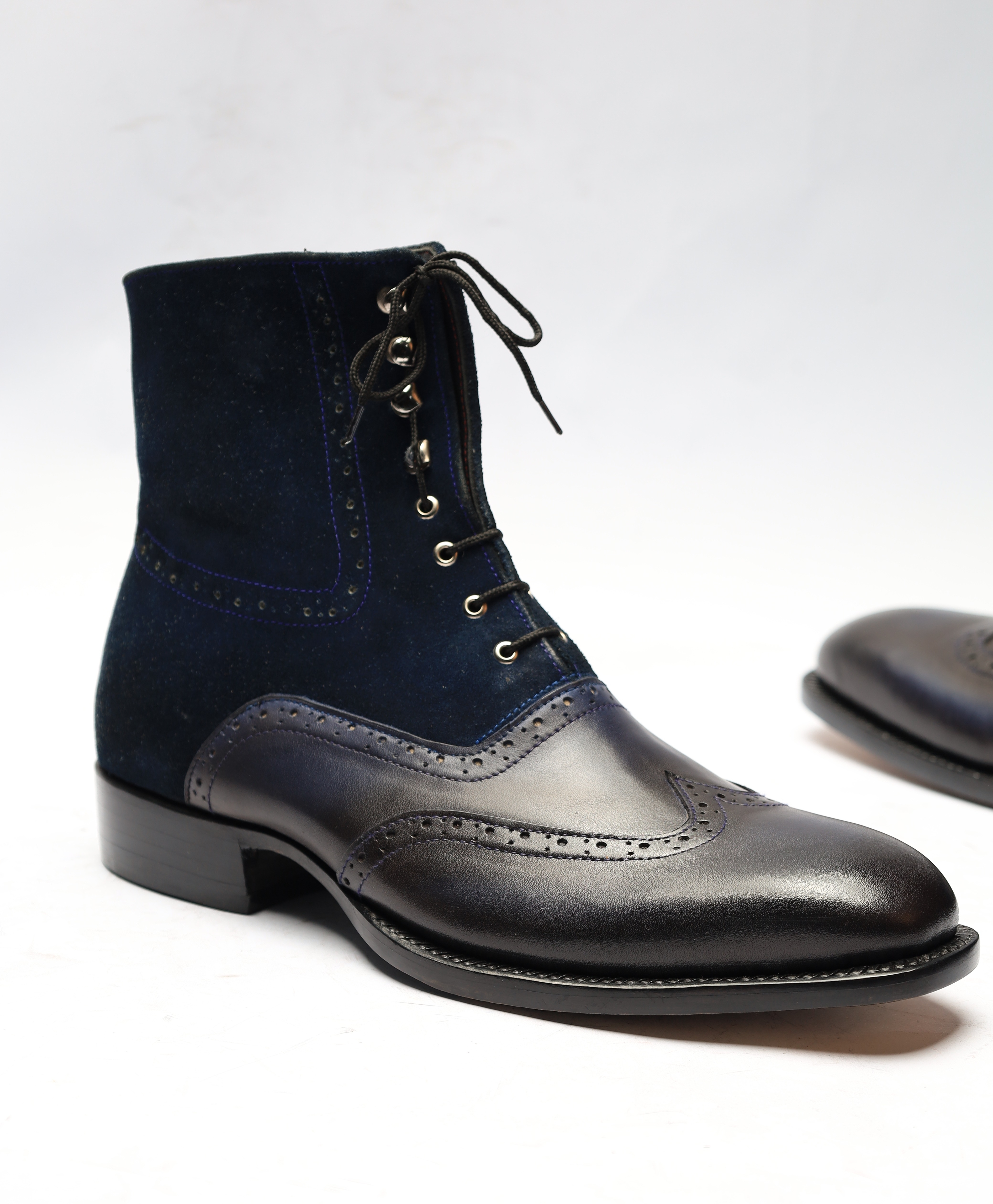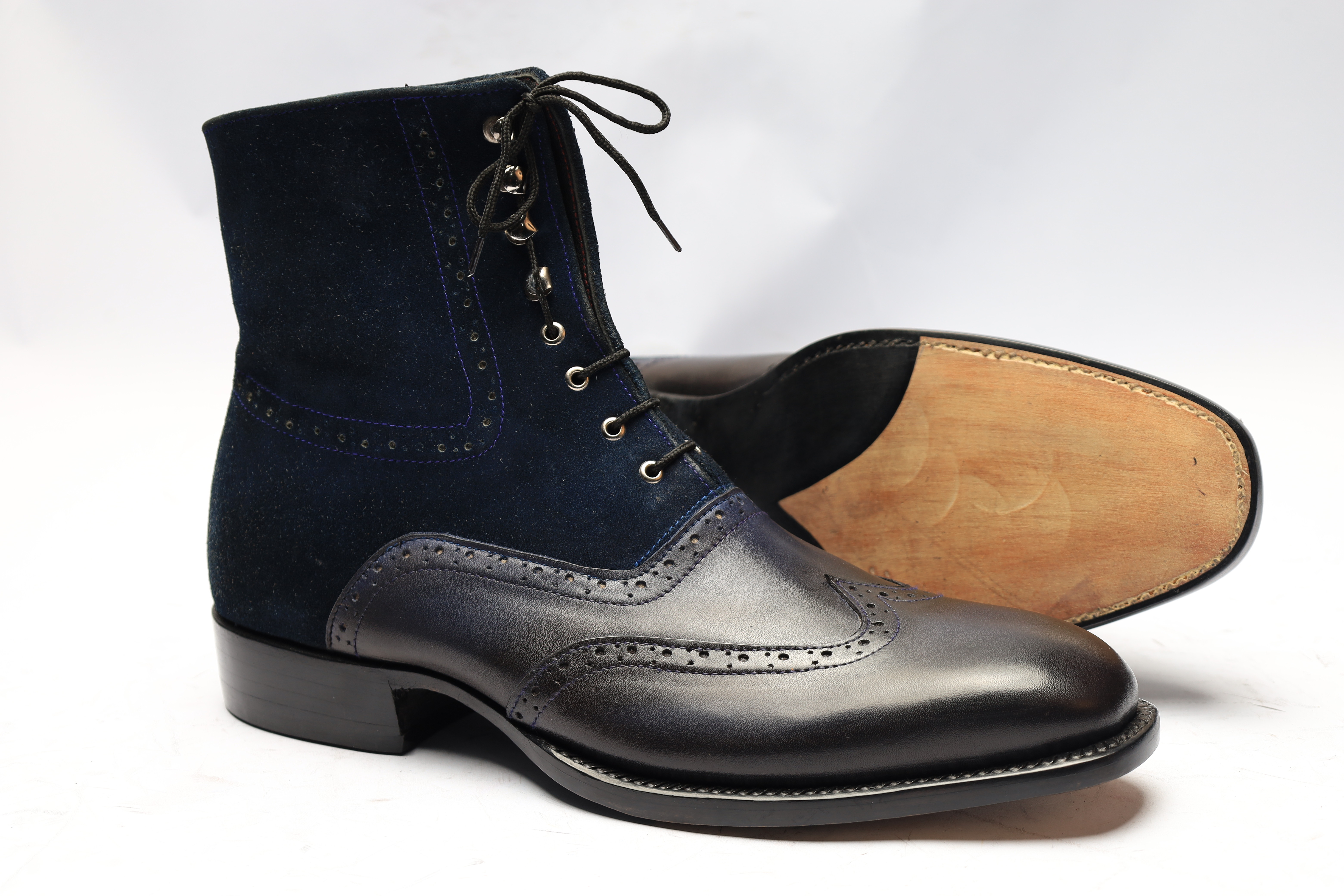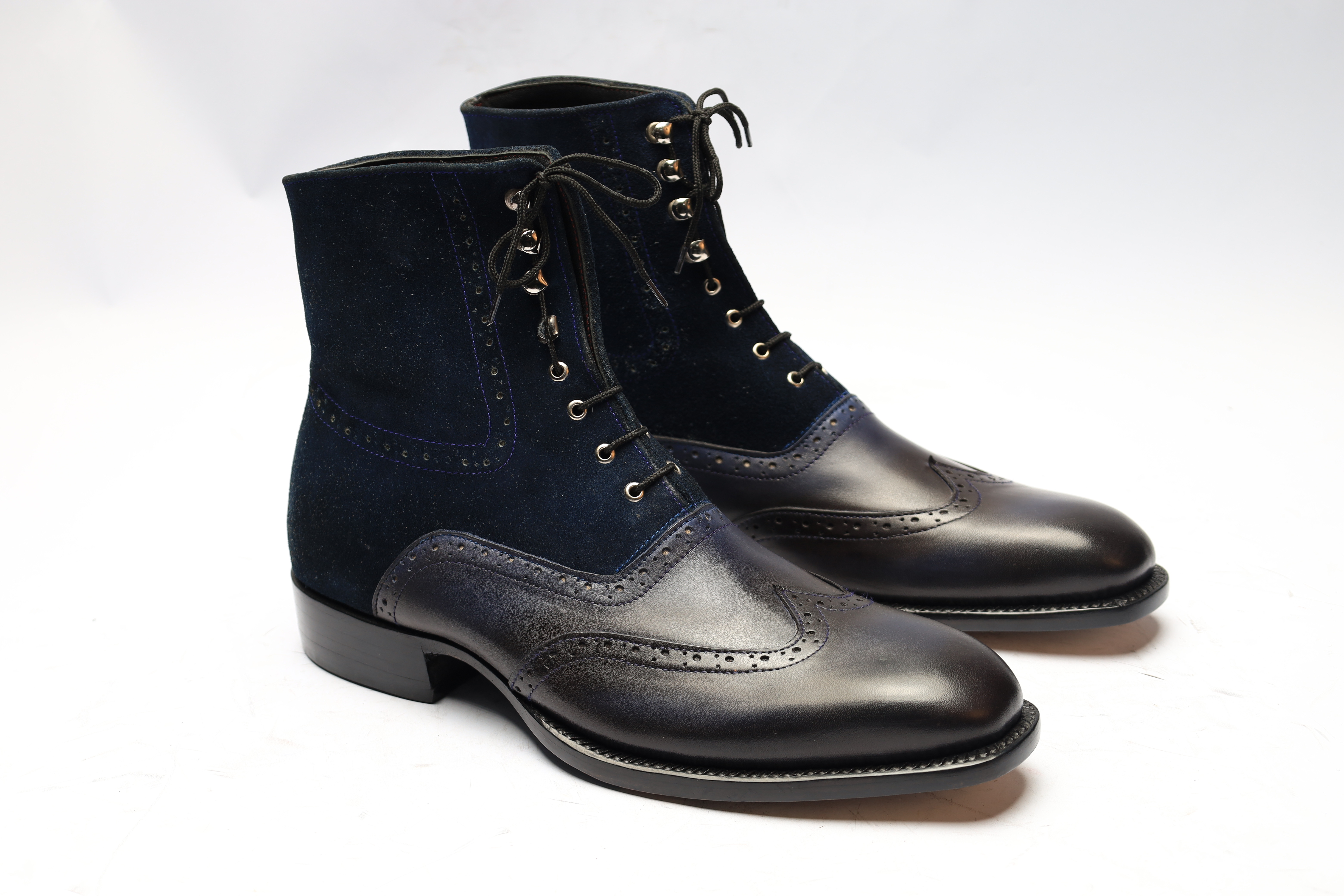 Crafted Leather Classic Dress Shoes Black Calf Dark Blue Suede Ankle High Wingtip Boot