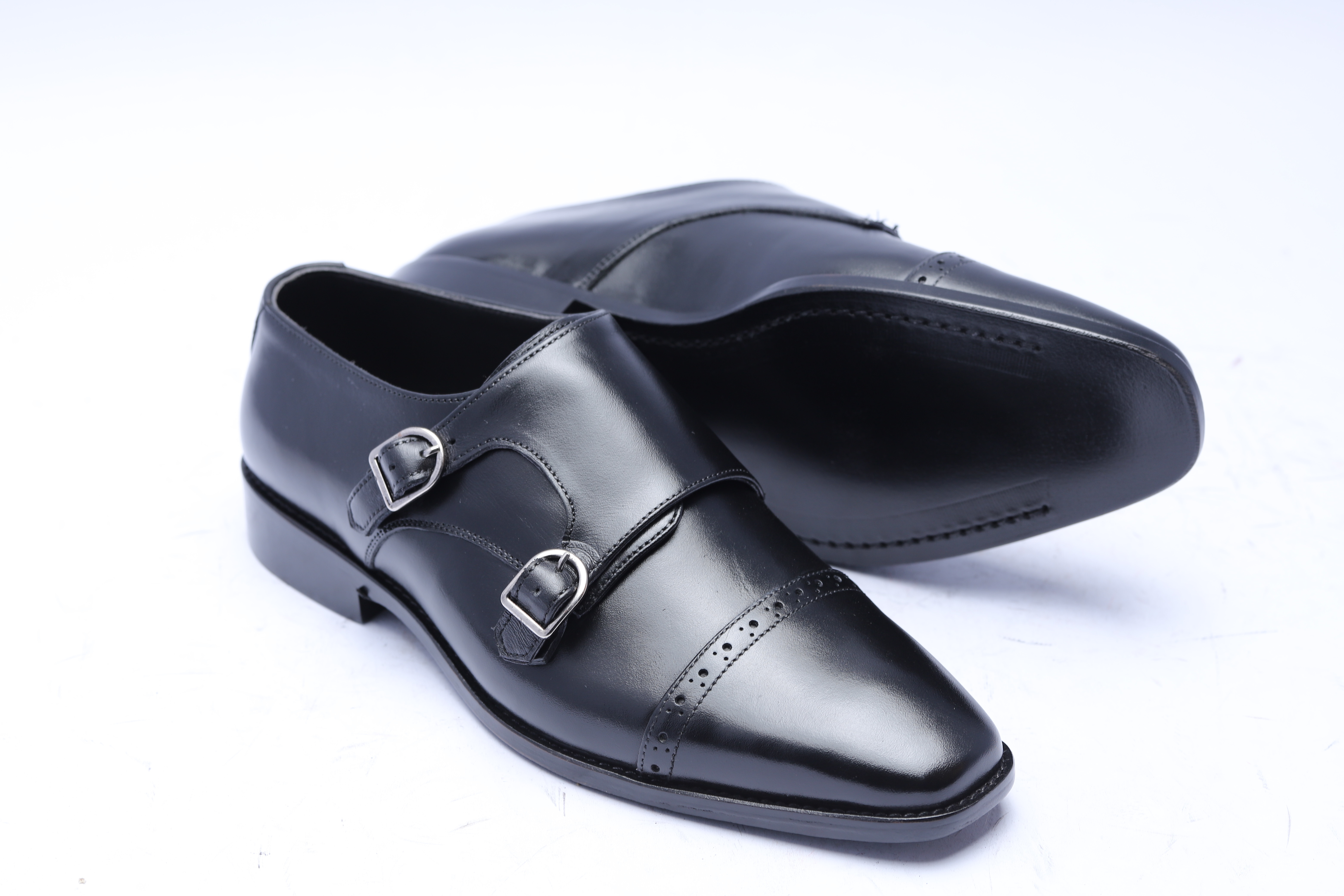 Crafted Leather Classic Black Calf Leather Monk Strap Dress Shoes