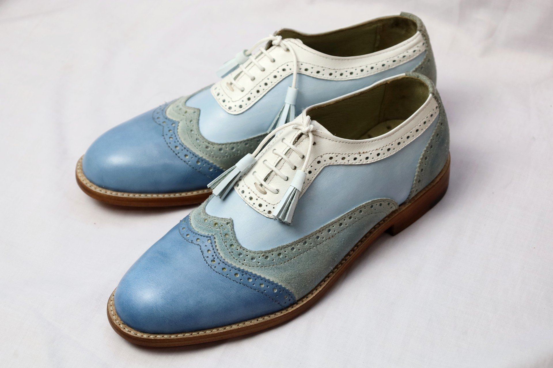 Inner: Soft Leather Sole: Leather Gender : Male Heel: Leather Color: Blue / Gray Style: Wingtip Dress Shoes Lining Soft Calf Leather Lining Totally Hand stitched Manufacturing time 7-10 business days If you can’t find your Size/Colorjust send us message we will make for you.