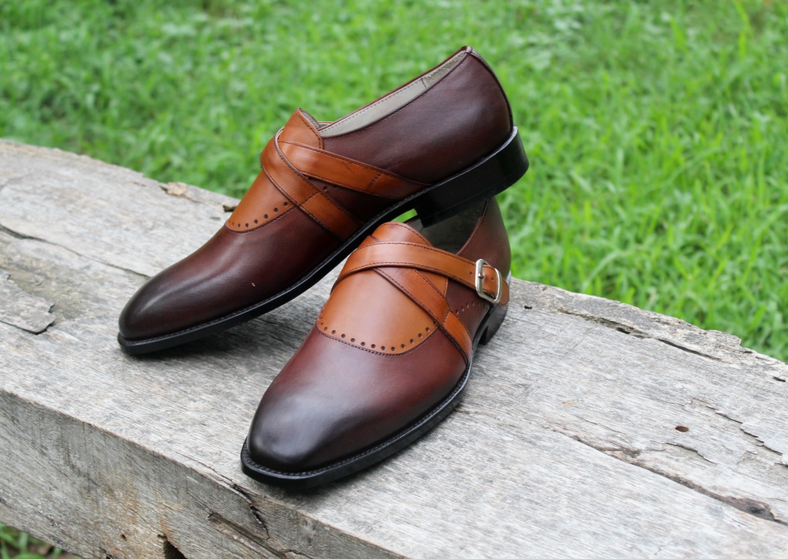 Crafted Leather Classic Tan Brown Leather Cross Buckle Monk Strap Dress Shoes