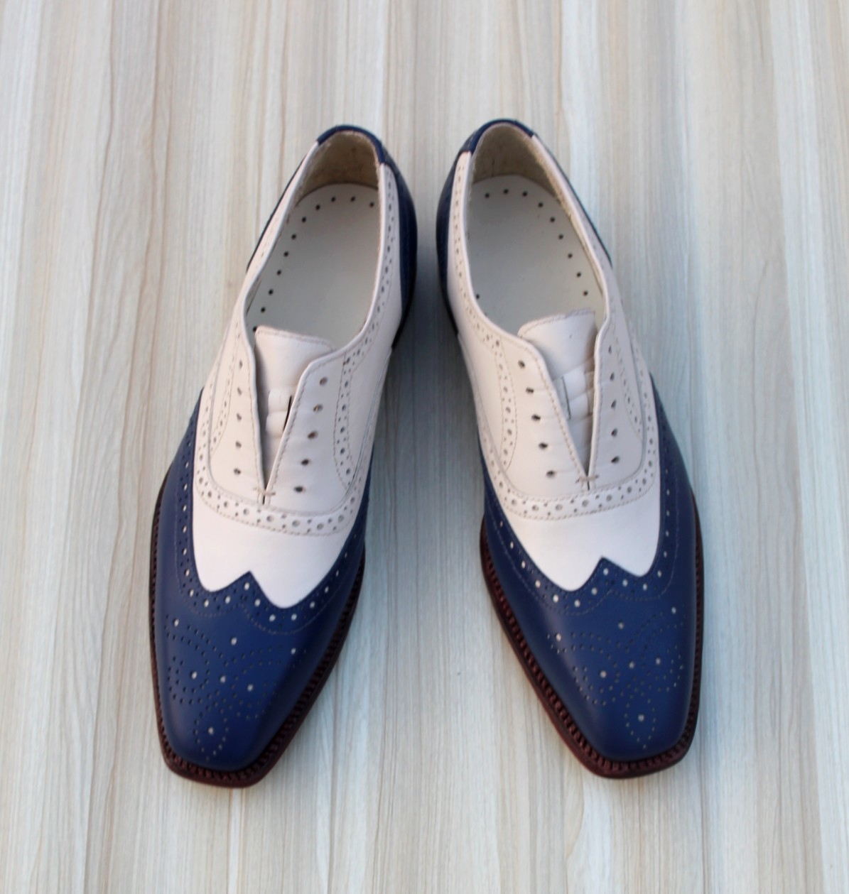 Crafted Leather Classic Blue White Leather Wingtip Oxford Dress Shoes