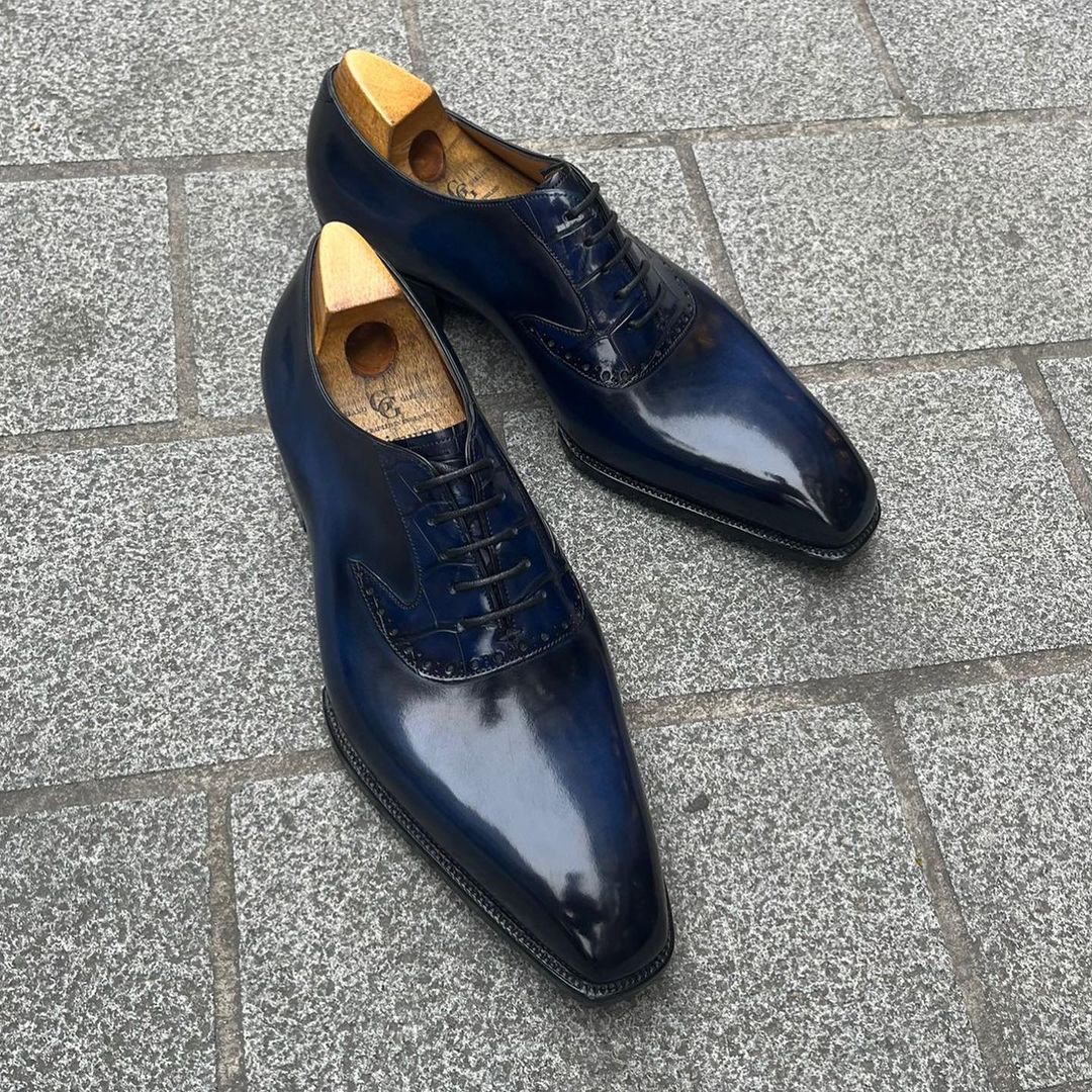 Inner: Soft Leather Sole: Leather Gender : Male Heel: Leather Color: Sapphire Patina Style: Dress Shoes Lining Soft Calf Leather Lining Totally Hand stitched Manufacturing time 7-10 business days If you can’t find your Size/Colorjust send us message we will make for you.