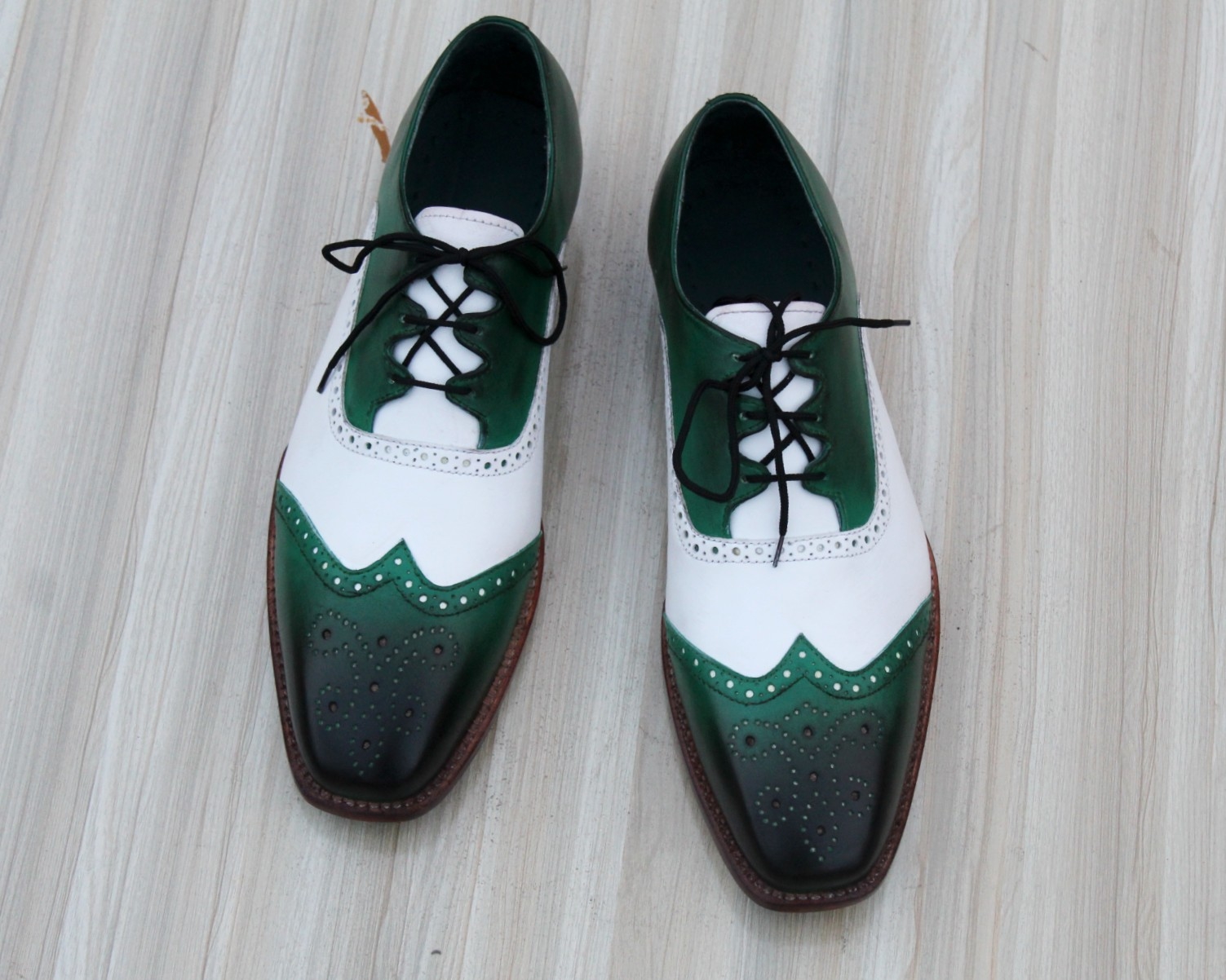 Inner: Soft Leather Sole: Leather Gender : Male Heel: Leather Color: Green / White Style: Oxford Wingtip Shoes Lining Soft Calf Leather Lining Totally Hand stitched Manufacturing time 7-10 business days If you can’t find your Size/Colorjust send us message we will make for you.