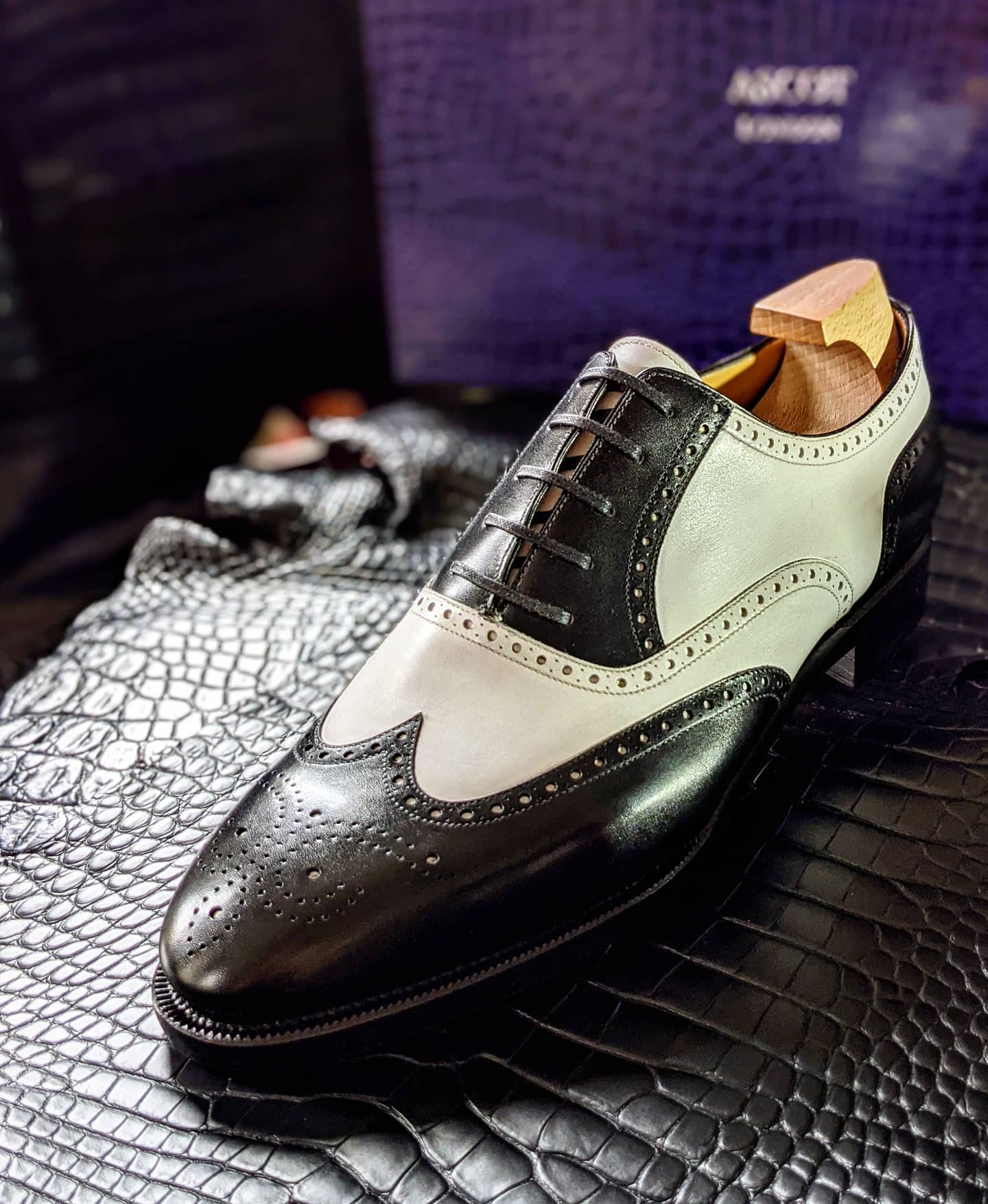 Handmade Men Black White Leather Wingtip Oxford Lace up Dress Shoes