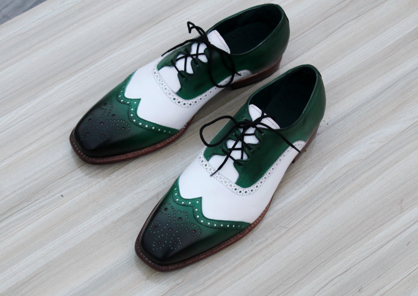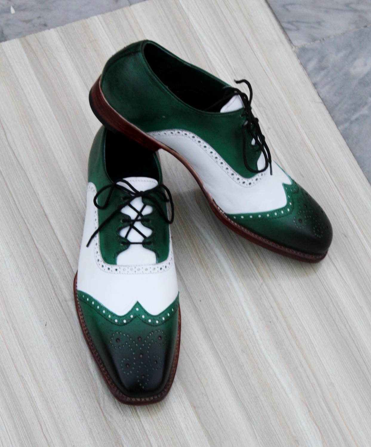 Inner: Soft Leather Sole: Leather Gender : Male Heel: Leather Color: Green / White Style: Oxford Wingtip Shoes Lining Soft Calf Leather Lining Totally Hand stitched Manufacturing time 7-10 business days If you can’t find your Size/Colorjust send us message we will make for you.