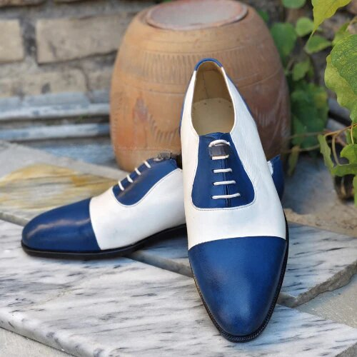 Crafted Leather Handmade Men Blue White Leather Oxford Lace up Dress Shoes
