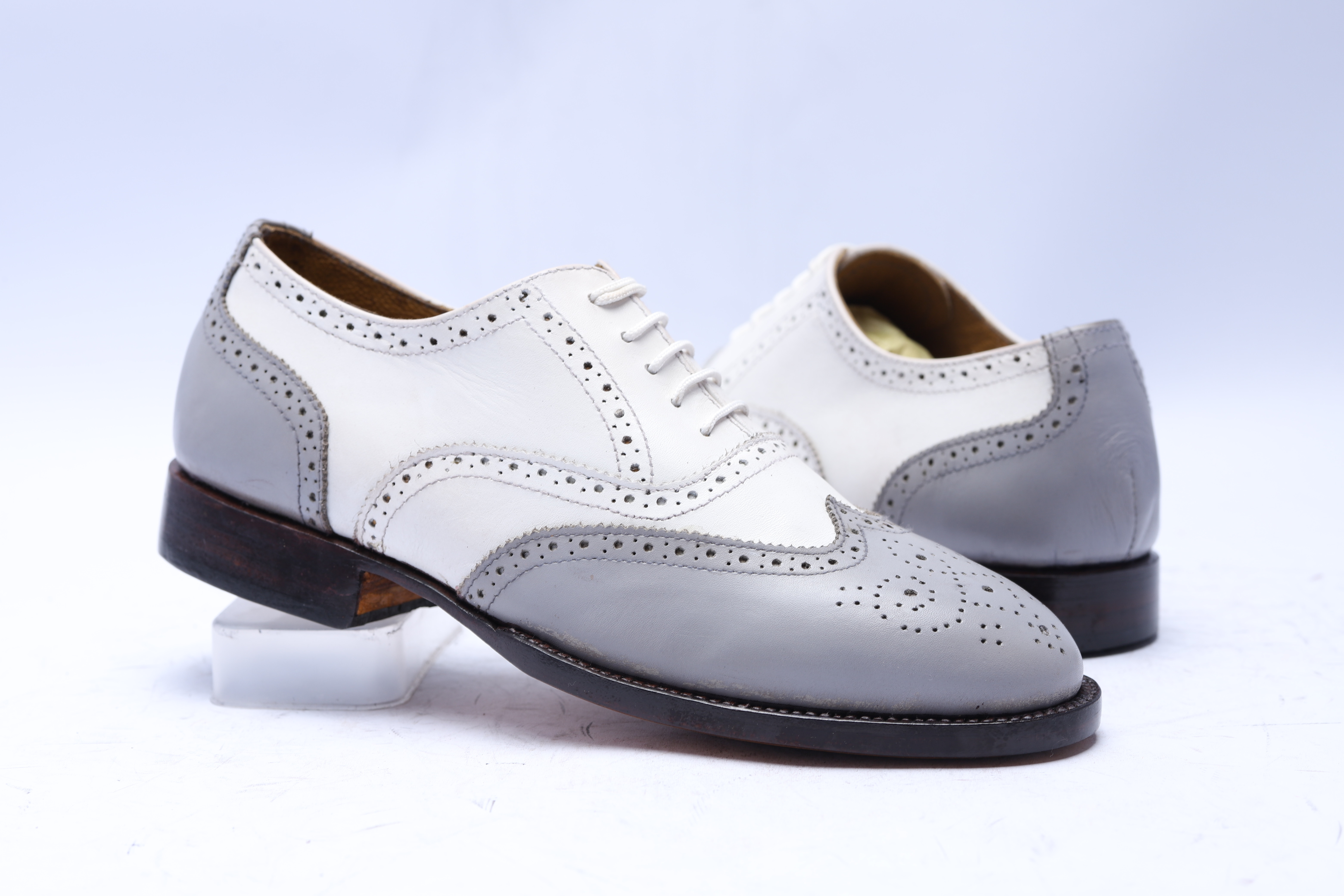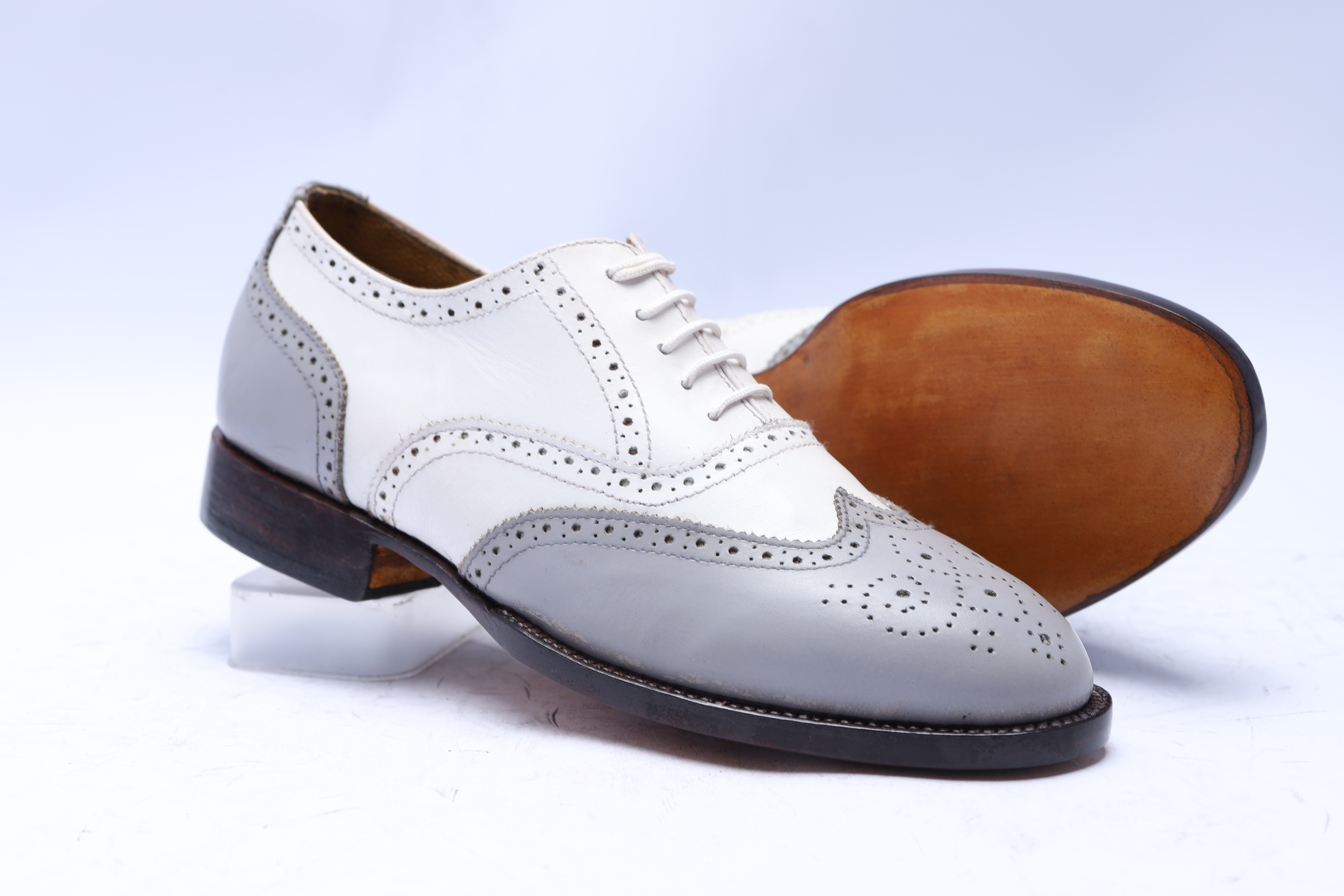 Crafted Leather Handmade Men Classic Gray White Leather Wingtip Oxford Dress Shoes