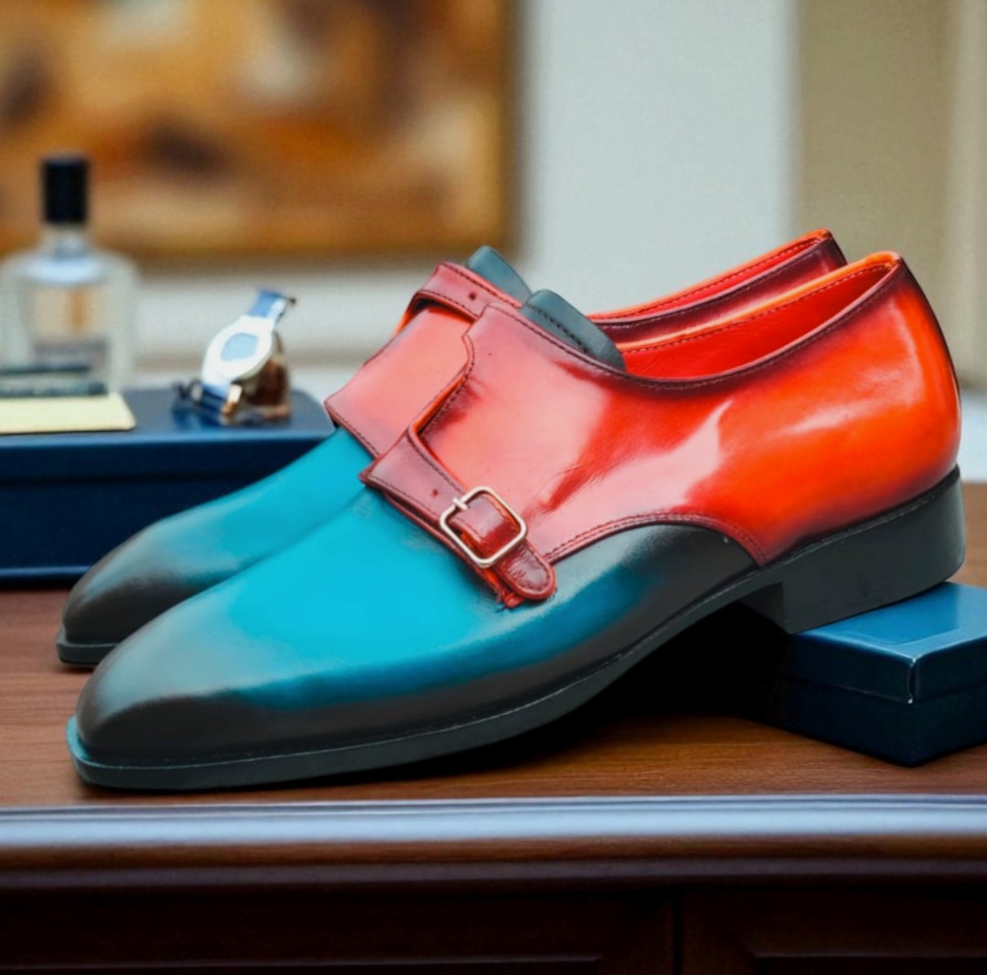 Crafted Leather Classic Blue Tan Patina Leather Monk Strap Dress Shoes