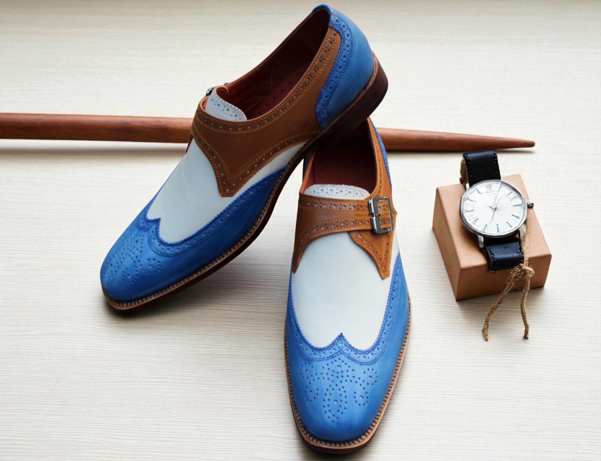 Inner: Soft Leather Sole: Leather Gender : Male Heel: Leather Color: Blue / White / Brown Style: Dress Shoes Totally Hand stitched Manufacturing time 7-10 business days If you can’t find your Size/Colorjust send us message we will make for you.
