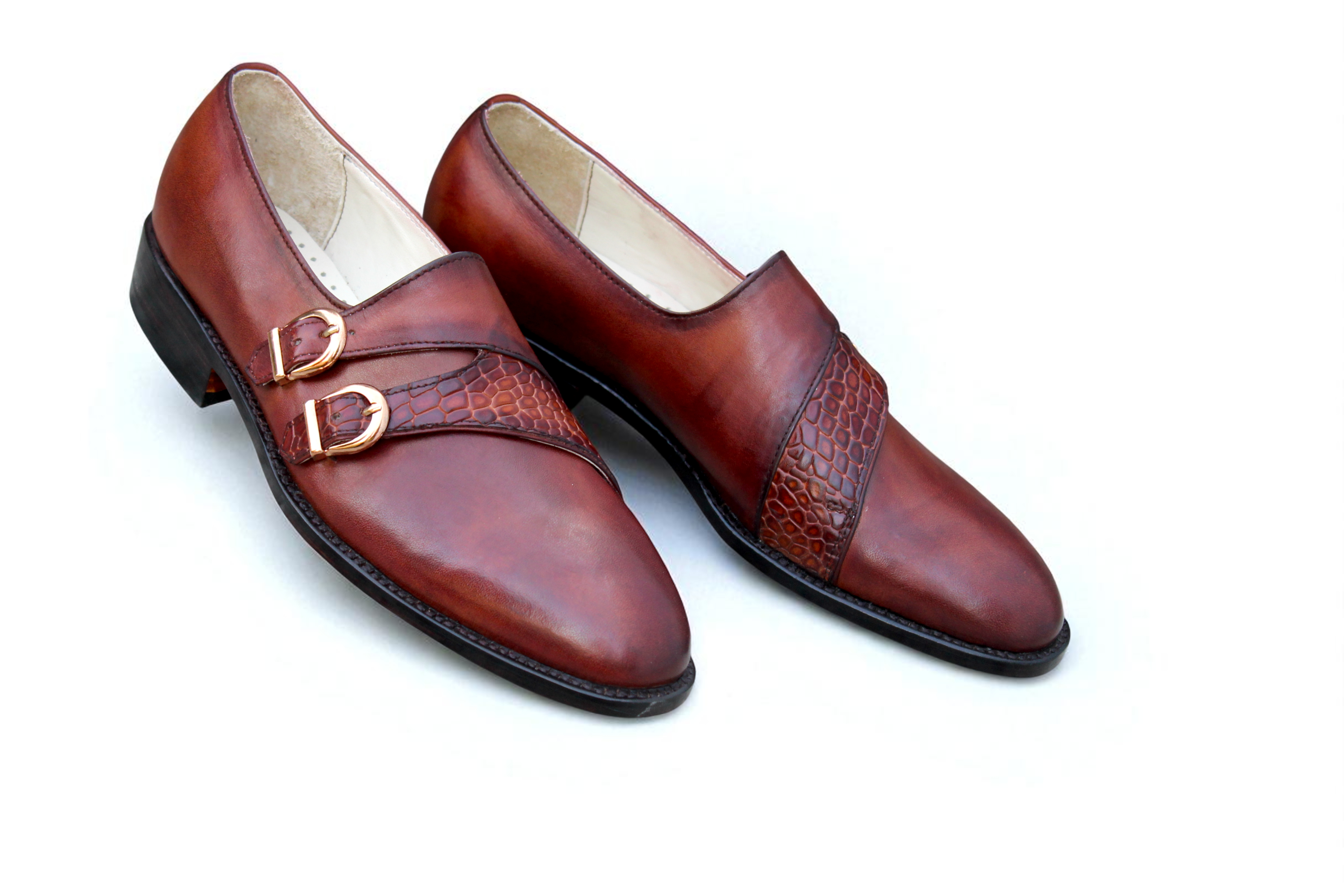 Crafted Leather Classic Brown Crocodile Leather Monk Strap Dress Shoes