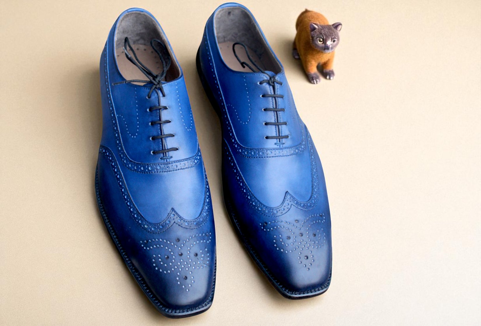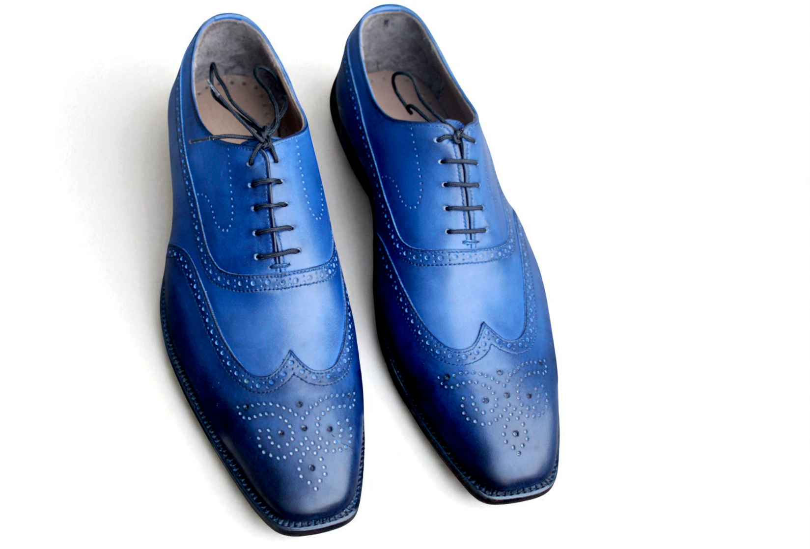 Inner: Soft Leather  Sole: Leather  Gender : Male Heel: Leather Color:  Blue  Style: Oxford Wingtip Shoes Lining Soft Calf Leather Lining Totally Hand stitched Manufacturing time 7-10 business days If you can’t find your Size/Colorjust send us message we will make for you.