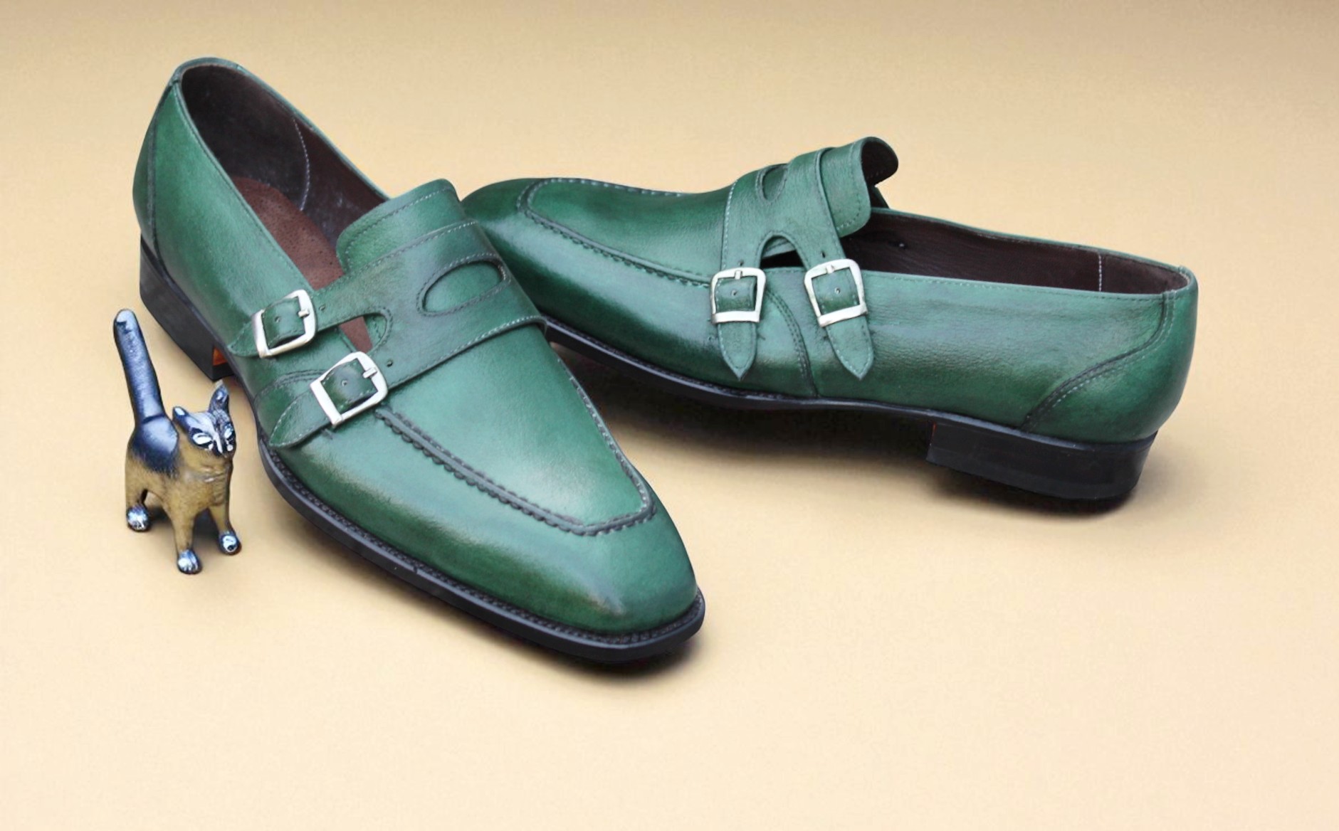 Inner: Soft Leather Sole: Leather Gender : Male Heel: Leather Color: Green Style: Double Monk Strap Shoes Lining Soft Calf Leather Lining Totally Hand stitched Manufacturing time 7-10 business days If you can’t find your Size/Colorjust send us message we will make for you.