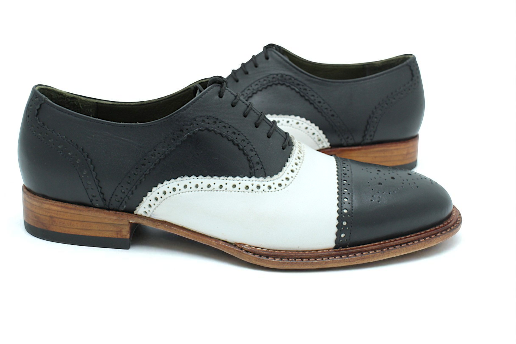Crafted Leather Handmade Classic Black White Leather Triple Sole Handwelted Oxfords Lace up Dress Shoes